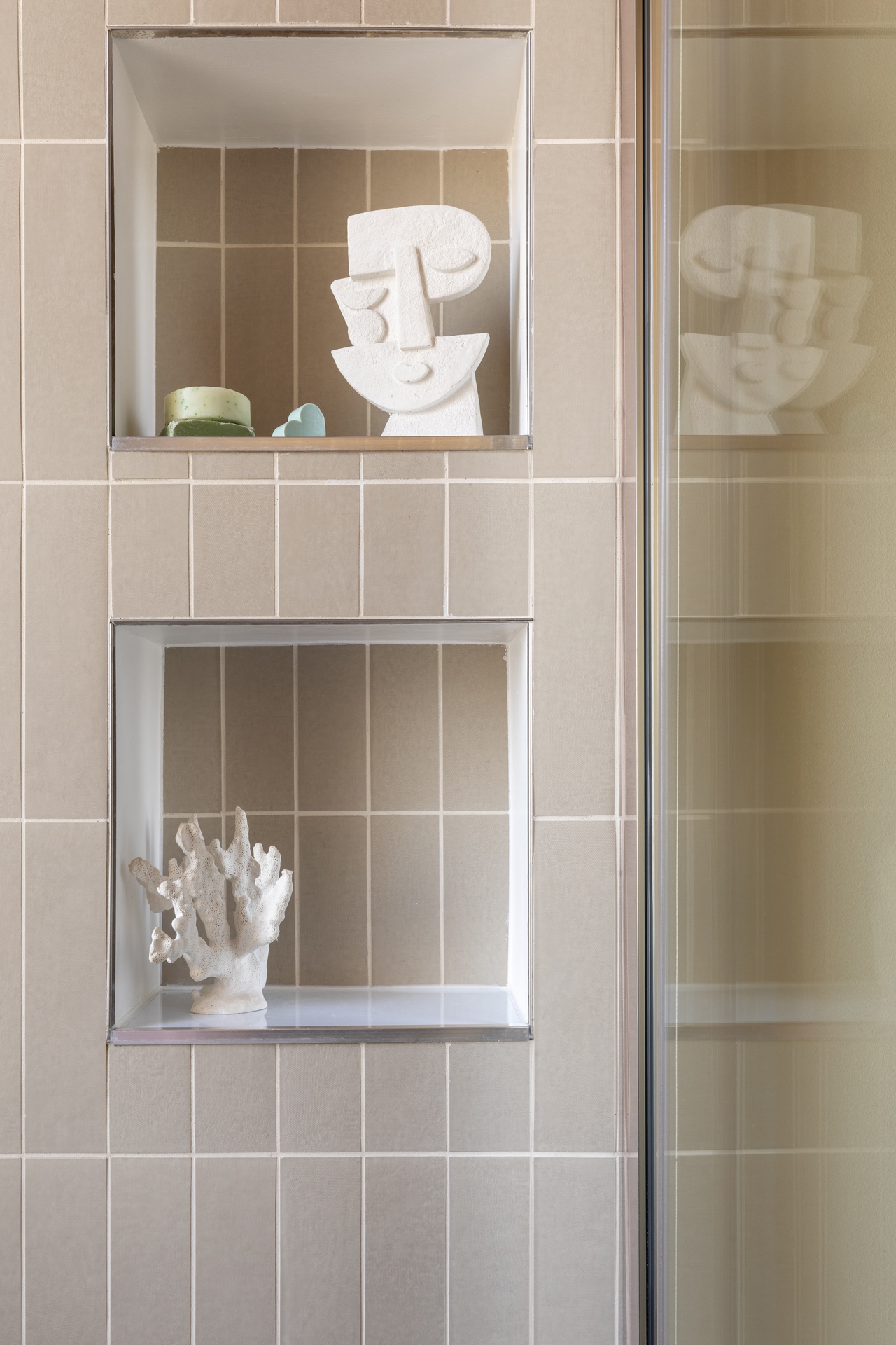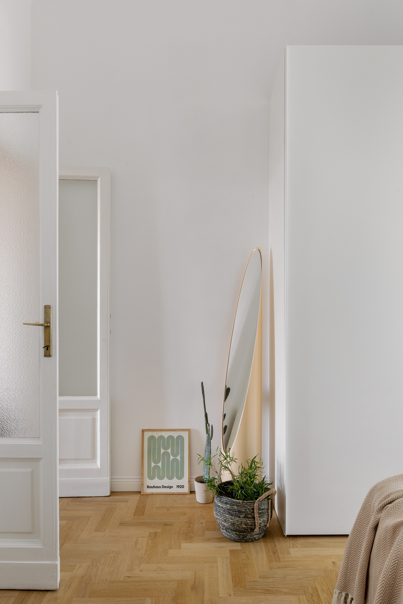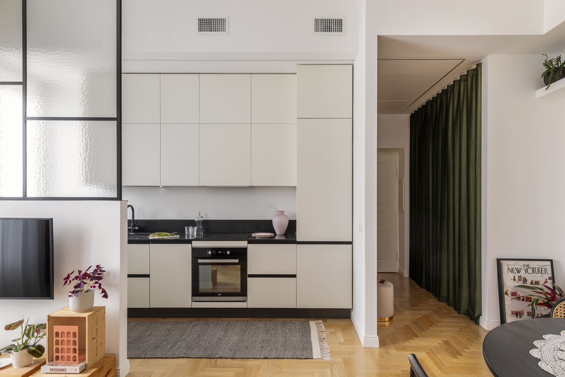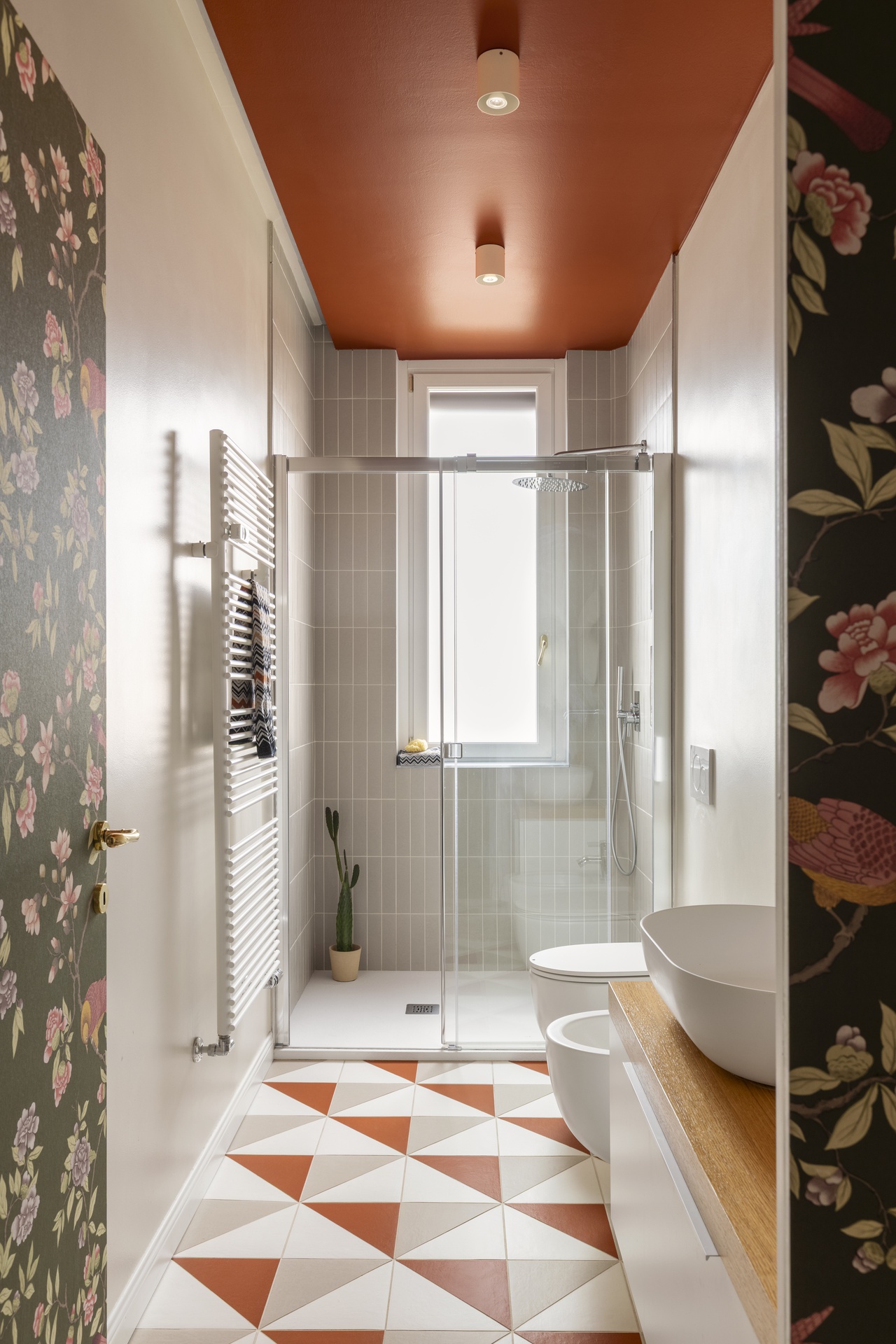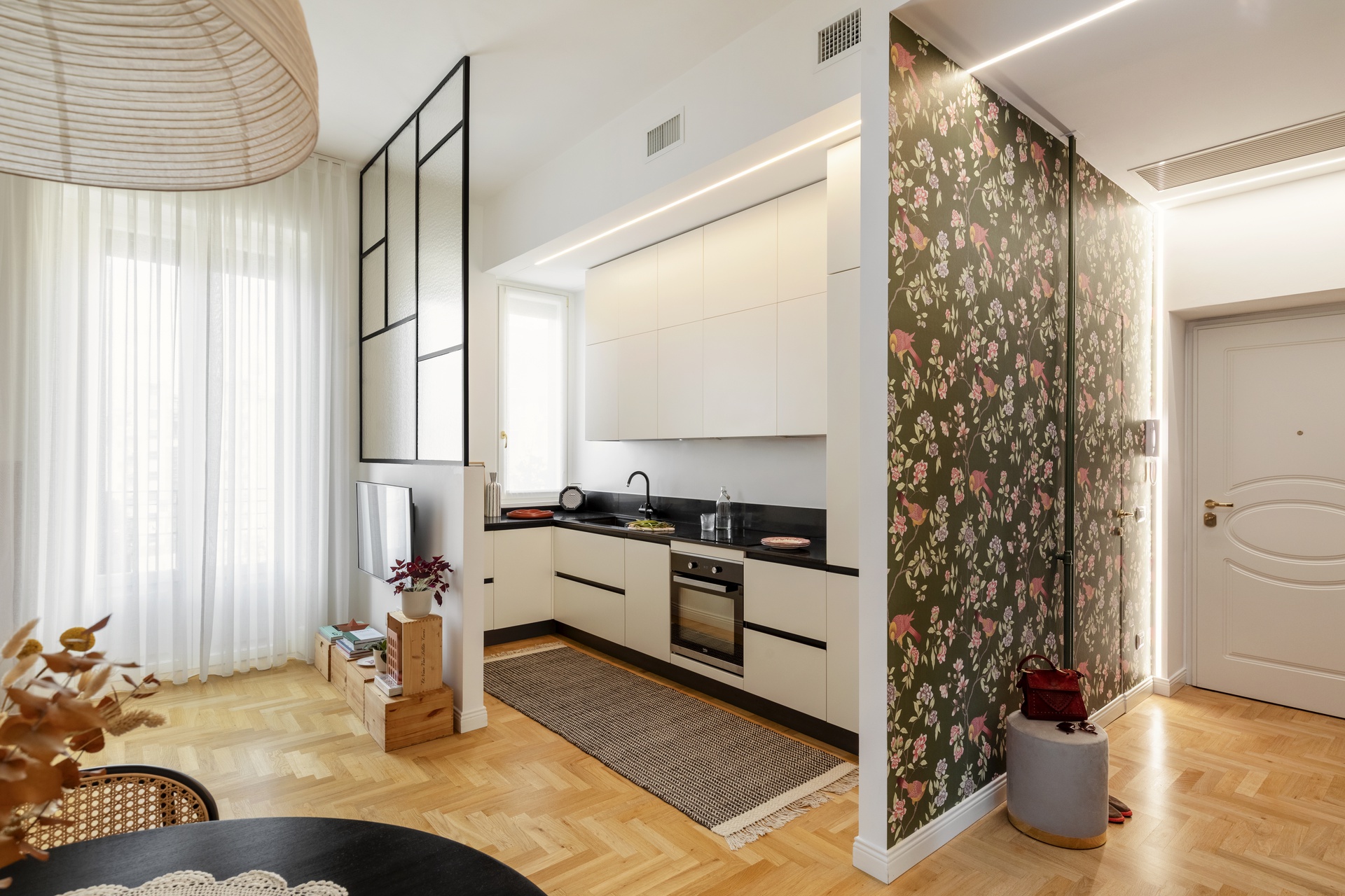 All’inizio, l’ingresso era frammentato tra corridoio, bagno, ripostiglio e cucina, generando spazi disgiunti e poco funzionali. La ristrutturazione ha trasformato questi ambienti in un ampio open space, dove la vecchia cucina e il ripostiglio dialogano con una boiserie color vinaccia che conferisce eleganza e continuità visiva. Un setto in muratura, completato da una grande vetrata in ferro e vetro progettata su misura, separa delicatamente una parte della cucina dal living, senza interrompere la percezione di apertura e profondità.La camera matrimoniale ha mantenuto le generose dimensioni originarie, impreziosita da un serramento ad arco che riprende quello storico dell’appartamento e da una grande nicchia colorata che funge da testata del letto, diventando elemento scenografico e funzionale.