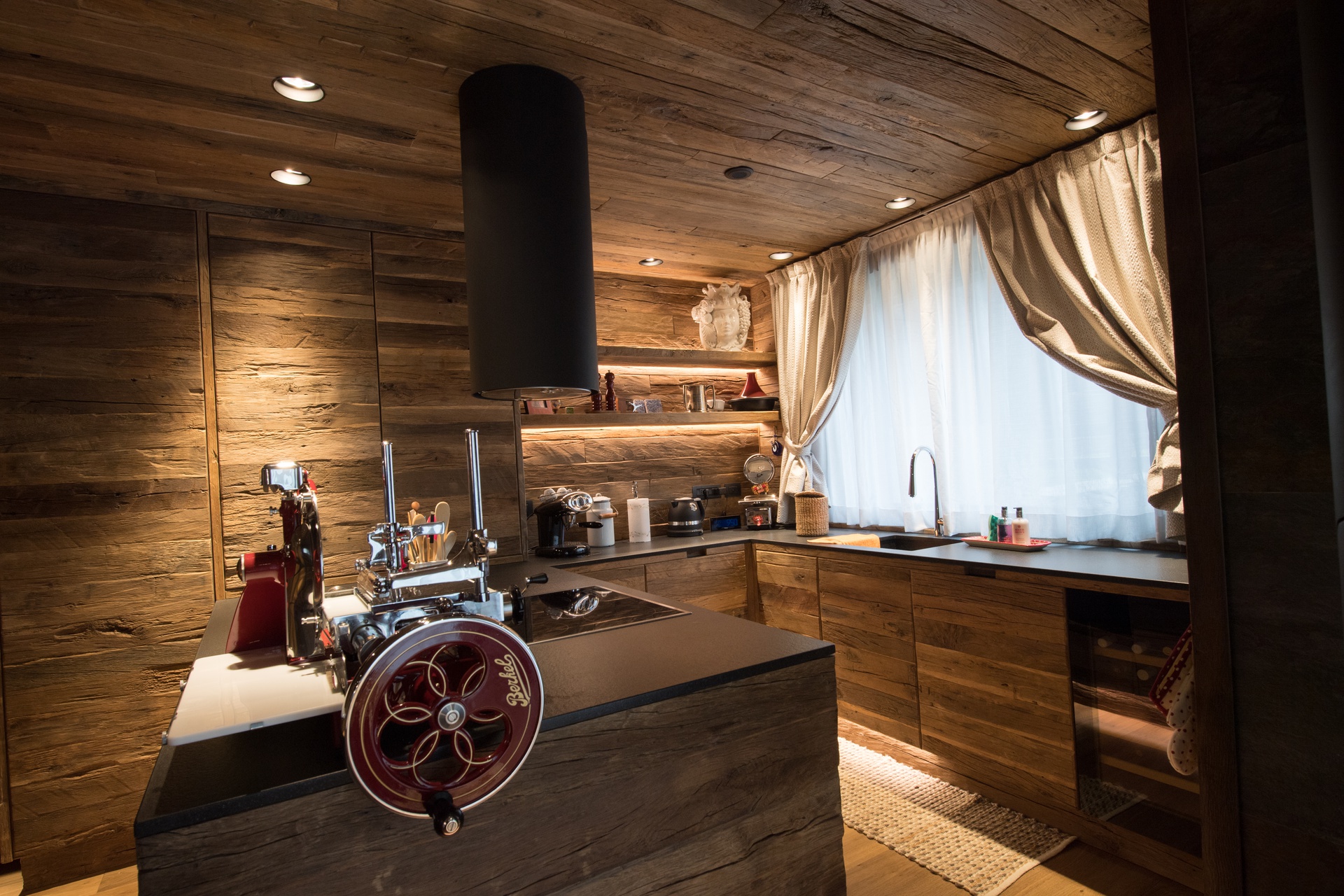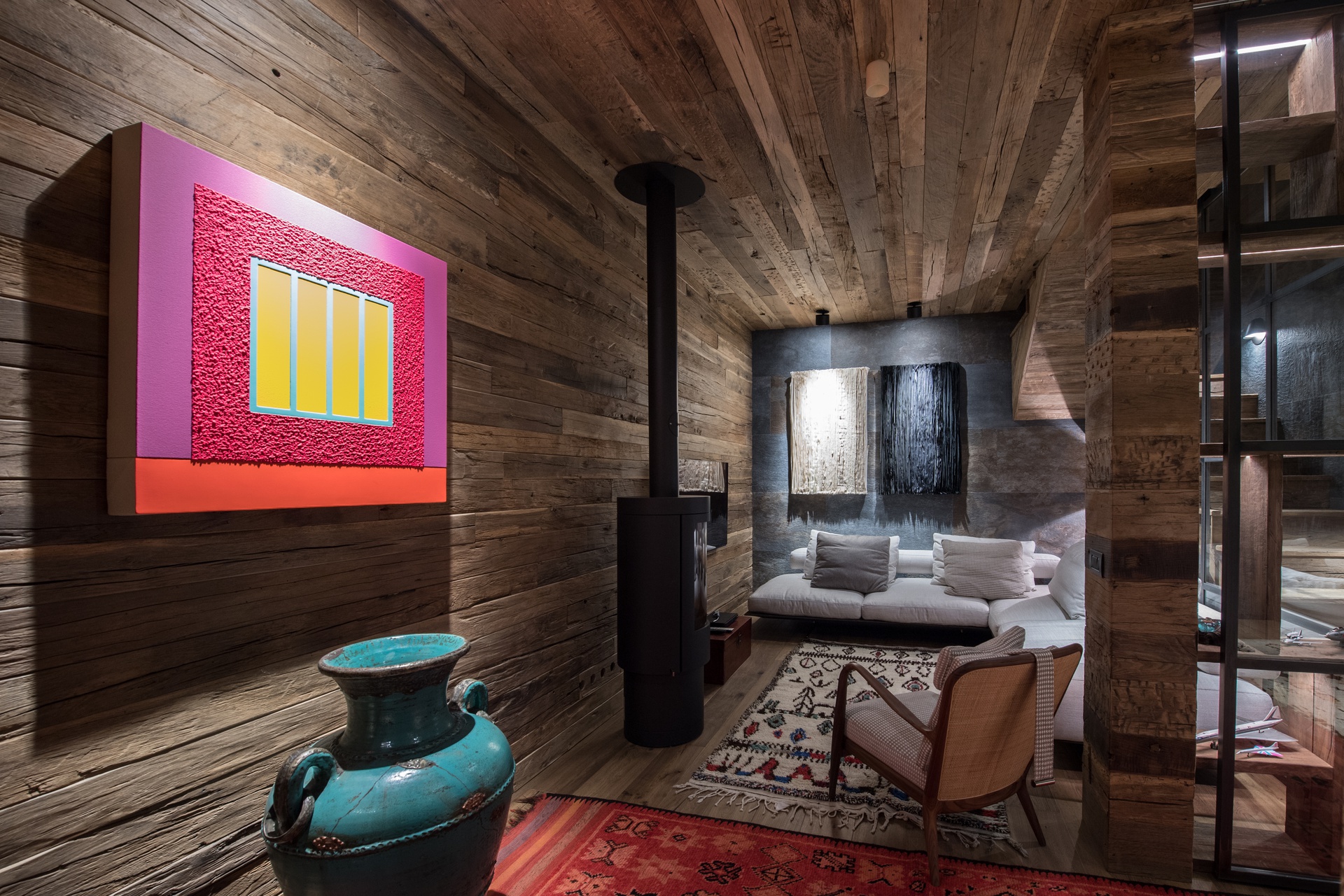 Il progetto, tiene conto dello spirito in cui e' inserito l'immobile e alla richiesta della committenza. Anche se di nuova realizzazione, l'interno rispecchia l'atmosfera di una baita di montagna in chiave moderna, l'utilizzo di legno vecchio sulle pareti e soffitti e la presenza di setti in ferro e vetro creano la scatola ideale.In questa soluzione, armadi e arredo si integrano perfettamente nelle pareti quasi a scomparire, altri complementi invece creano il carattere vivace e colorato dello spazio creando un contrasto unico nel suo genere.