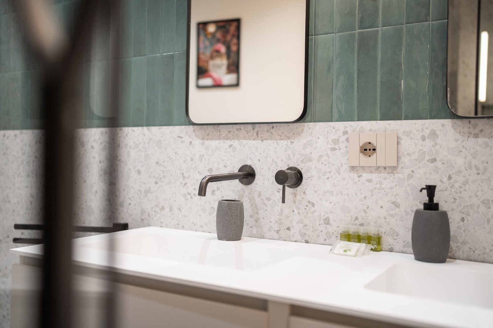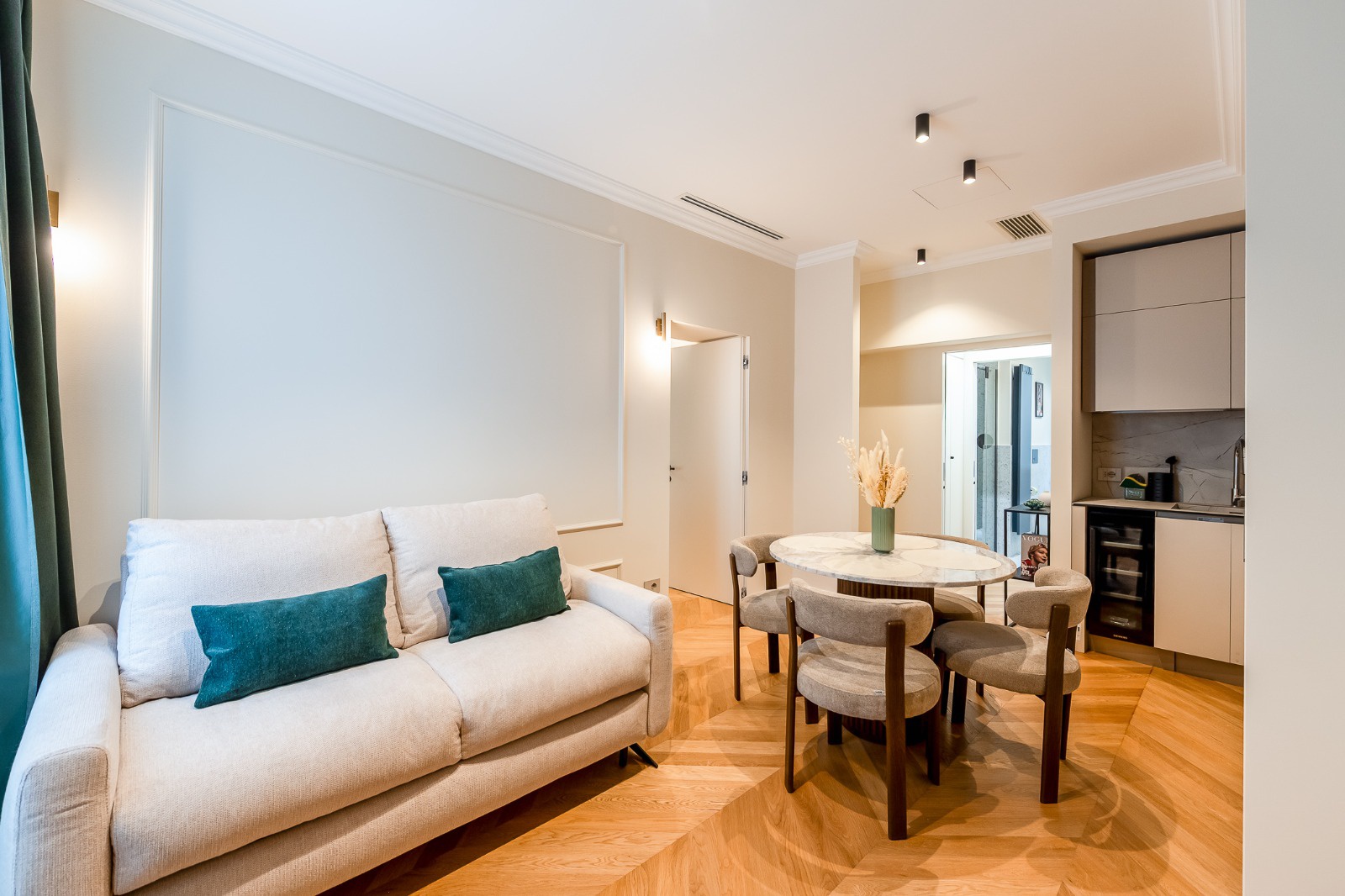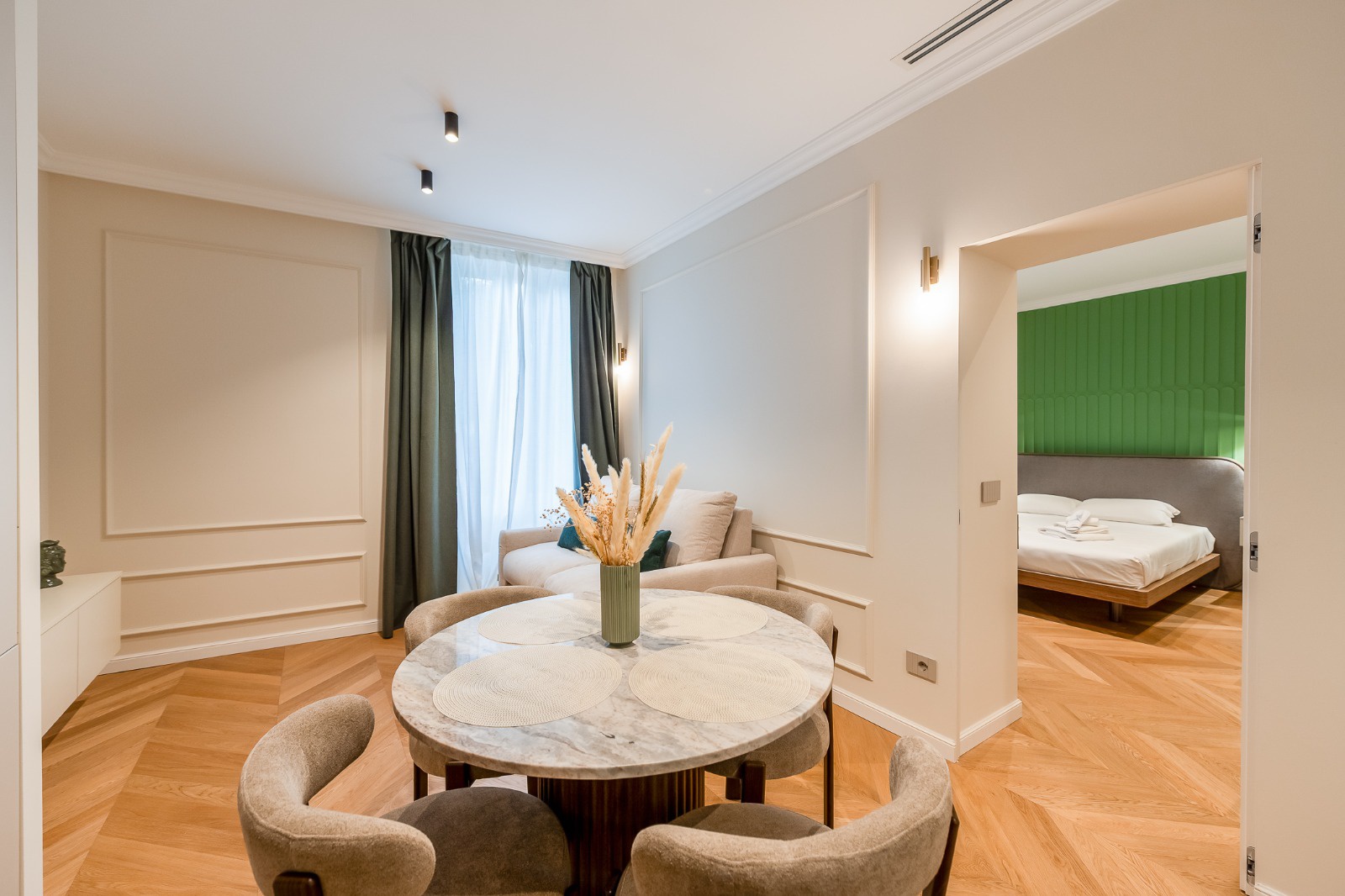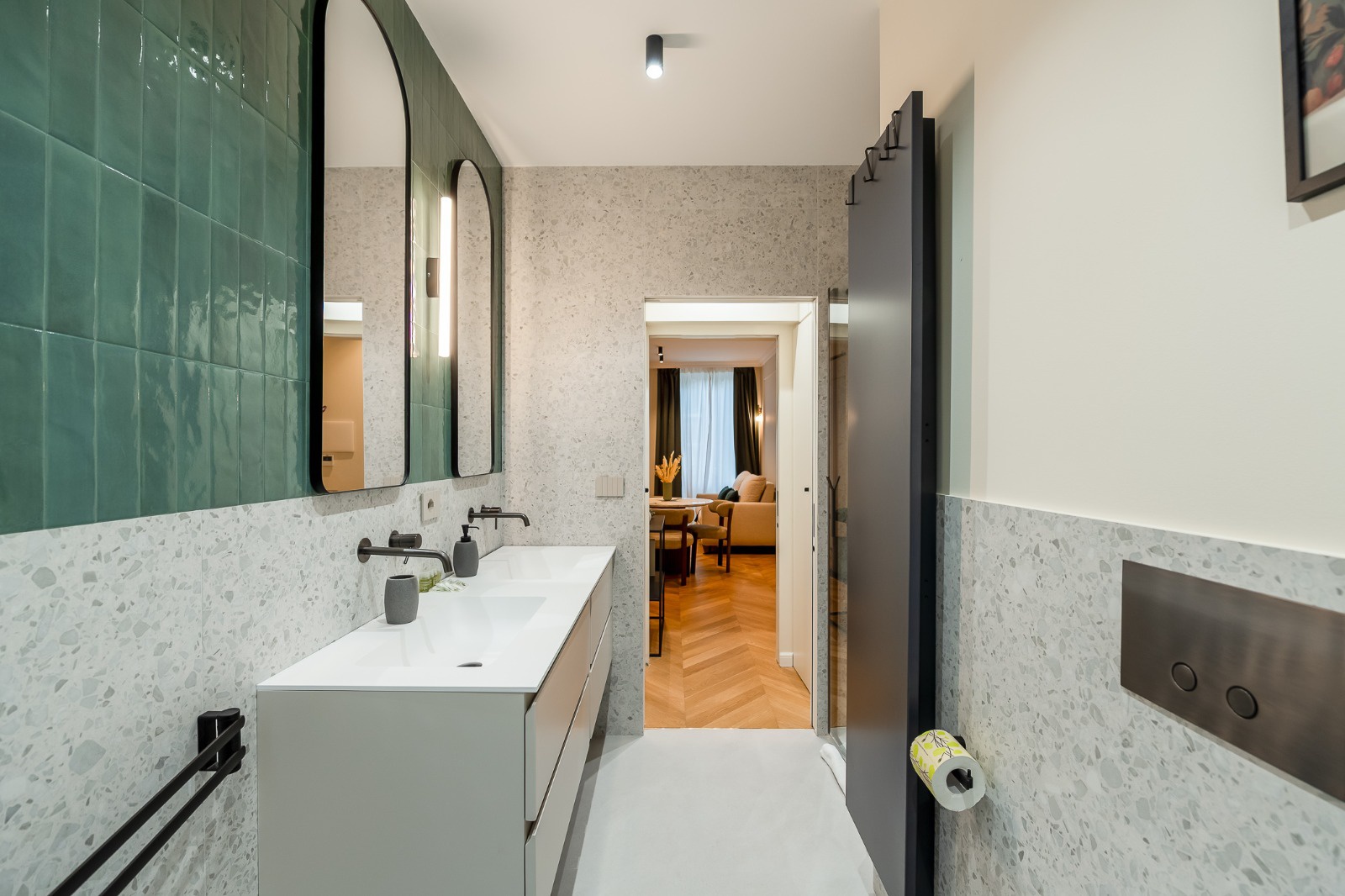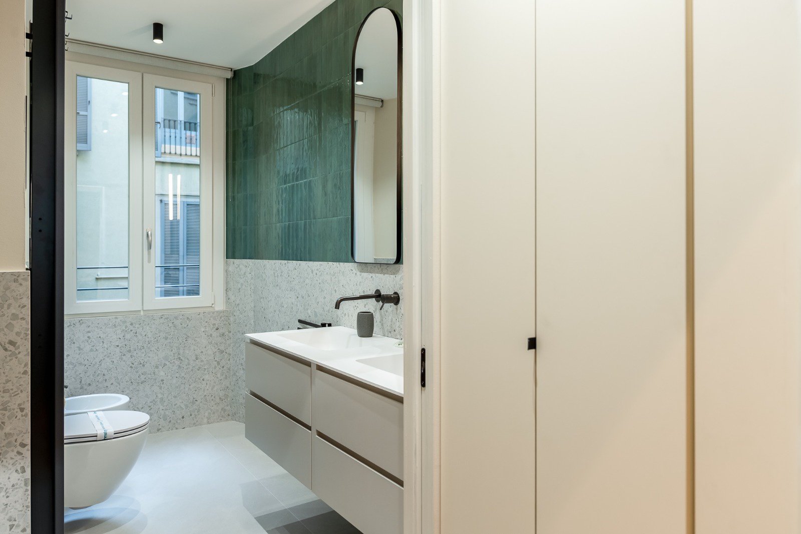 Questo progetto si distingue per uno stile contemporaneo raffinato, che combina eleganza sobria e comfort domestico con una cura minuziosa per i dettagli. Gli ambienti sono luminosi e accoglienti, caratterizzati da una palette neutra di beige, tortora e grigio chiaro, interrotta da tocchi di colore più decisi come il verde intenso della parete della camera da letto, che diventa il vero elemento iconico dello spazio.L’atmosfera generale è calda ma equilibrata, grazie al pavimento in legno posato a spina di pesce che aggiunge ritmo e matericità, bilanciato da arredi dalle linee essenziali e sospese, che alleggeriscono la percezione dello spazio. Le superfici opache e i tessuti morbidi conferiscono una sensazione di comfort discreto, mentre le cornici a parete e gli specchi dalle forme organiche introducono un accenno di classicità reinterpretata in chiave moderna.L’illuminazione, studiata con faretti incassati e sospensioni verticali sottili, contribuisce a creare un effetto scenografico misurato, esaltando i volumi e i materiali senza risultare invadente. Il bagno prosegue la stessa coerenza stilistica, con un uso raffinato del verde lucido delle piastrelle e delle superfici chiare in pietra ricomposta, in un dialogo continuo tra naturalezza e design.Nel complesso, lo stile può essere descritto come un contemporaneo soft: moderno ma non freddo, con richiami retro e tocchi mid-century rivisitati, capace di unire funzionalità, armonia e una sottile ricercatezza formale.