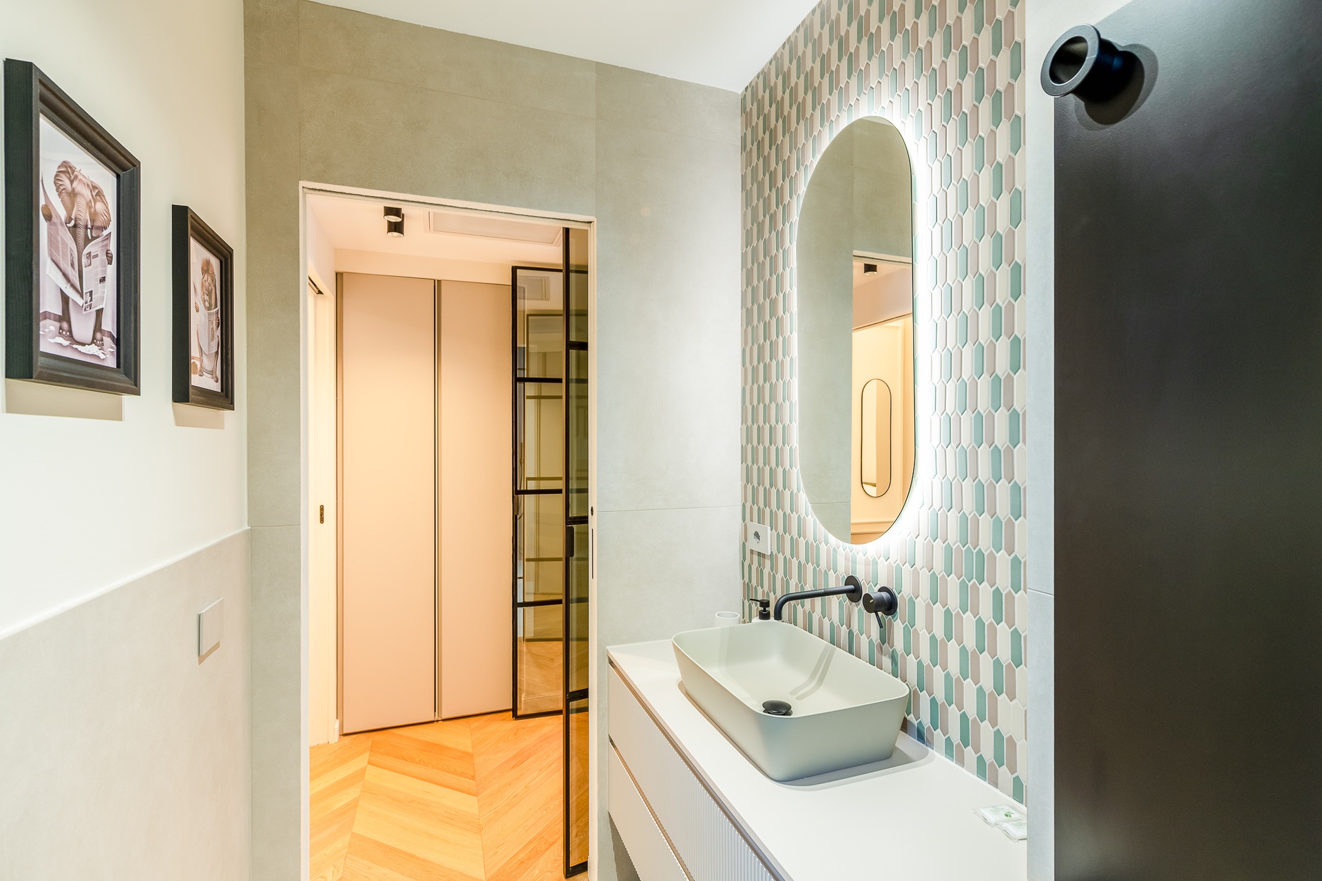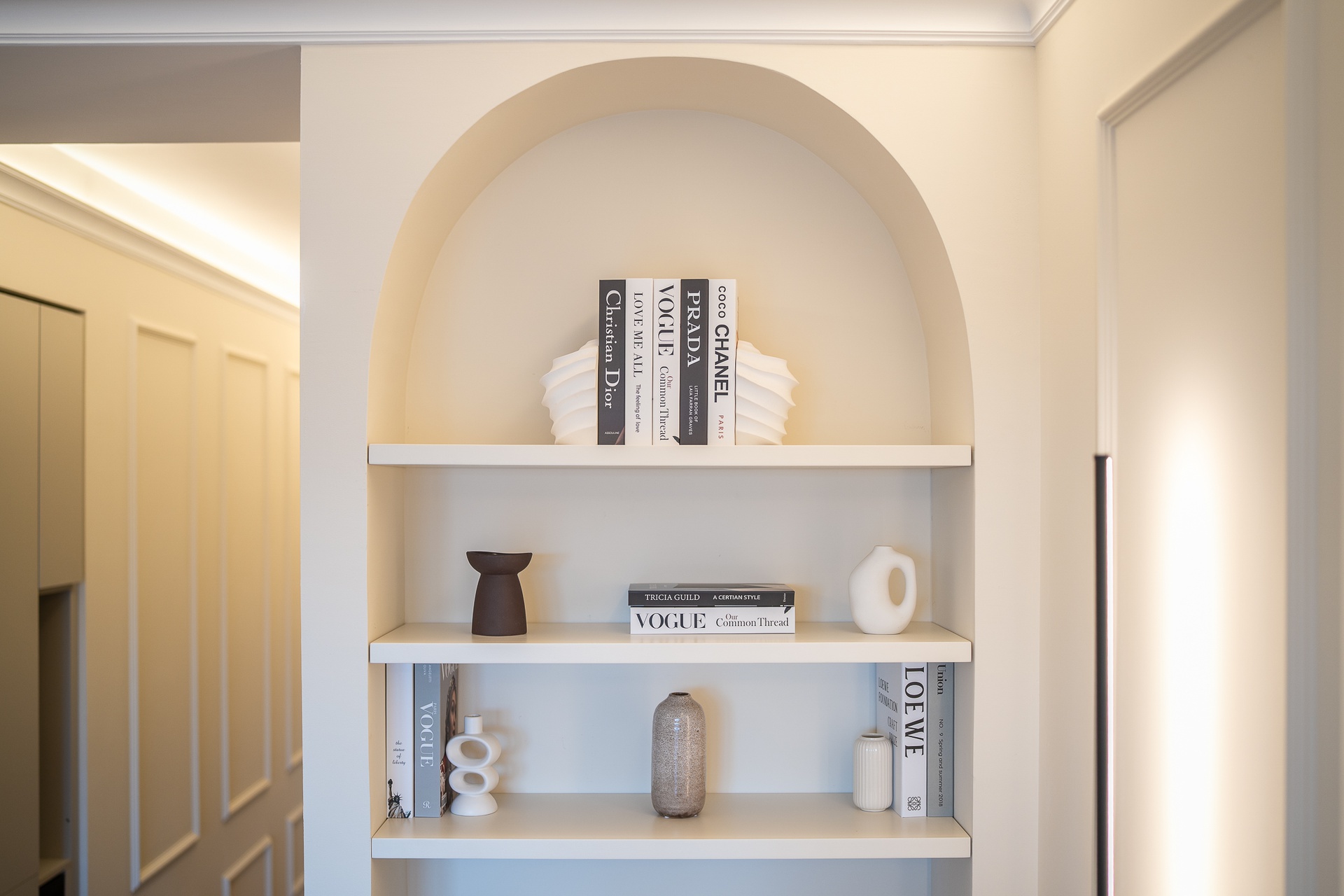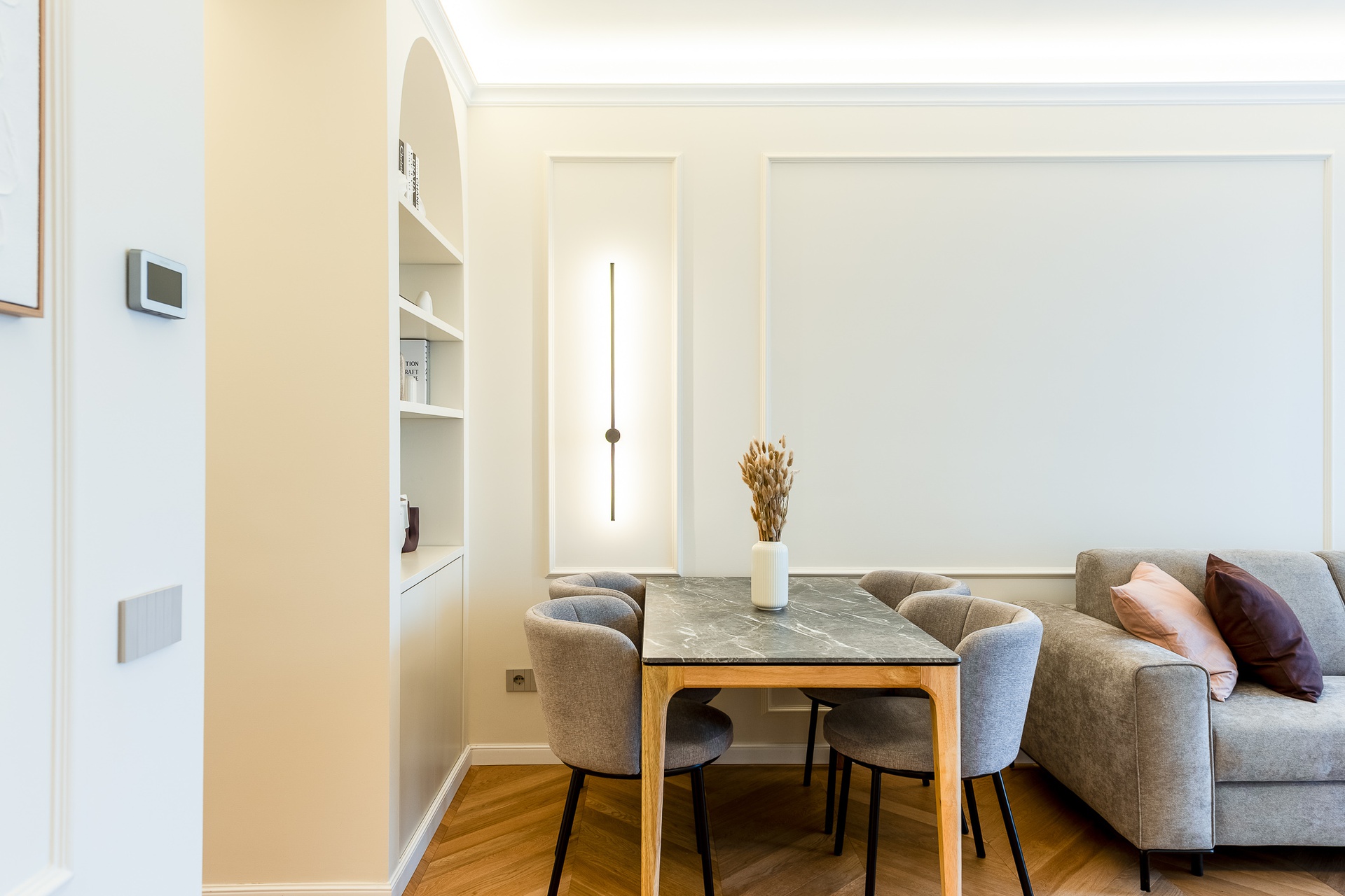 Questo progetto si presenta come un esempio di design contemporaneo elegante e misurato, dove ogni scelta formale e materica contribuisce a creare un’atmosfera accogliente e di grande raffinatezza. Gli interni sono pensati per trasmettere equilibrio e armonia, combinando linee pulite e dettagli sofisticati con una palette cromatica calda e naturale.Le tonalità prevalenti sono neutre e avvolgenti, come sabbia, crema e grigio chiaro, arricchite da note più decise di verde, blu e rosso bruciato, che conferiscono profondità e identità agli ambienti senza appesantirli. Il pavimento in legno posato a spina di pesce introduce un elemento di classicità reinterpretato in chiave moderna, mentre materiali come il marmo, il metallo opaco e i tessuti morbidi aggiungono texture e pregio.La luce gioca un ruolo centrale: l’illuminazione diffusa e i punti luce mirati valorizzano le superfici e creano atmosfere intime, mettendo in risalto le volumetrie e i contrasti materici. Gli arredi, spesso realizzati su misura, si inseriscono con naturalezza nello spazio, fondendo estetica e funzionalità in un linguaggio sobrio ma ricercato.Il progetto racconta un’idea di eleganza contemporanea senza eccessi, dove comfort e stile convivono in perfetta sintonia. È uno spazio pensato per essere vissuto, ma con un carattere distintivo, raffinato e coerente in ogni suo dettaglio.