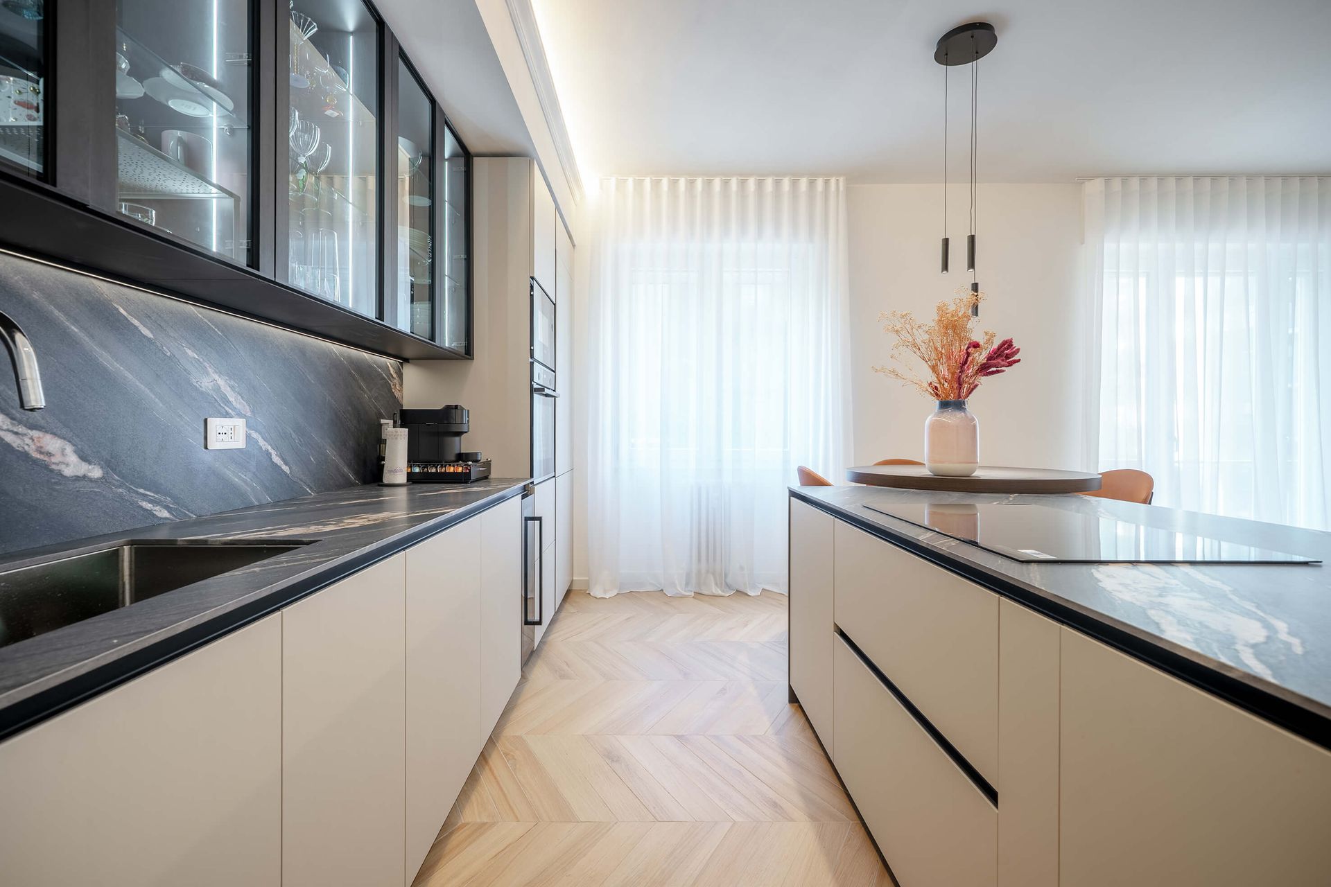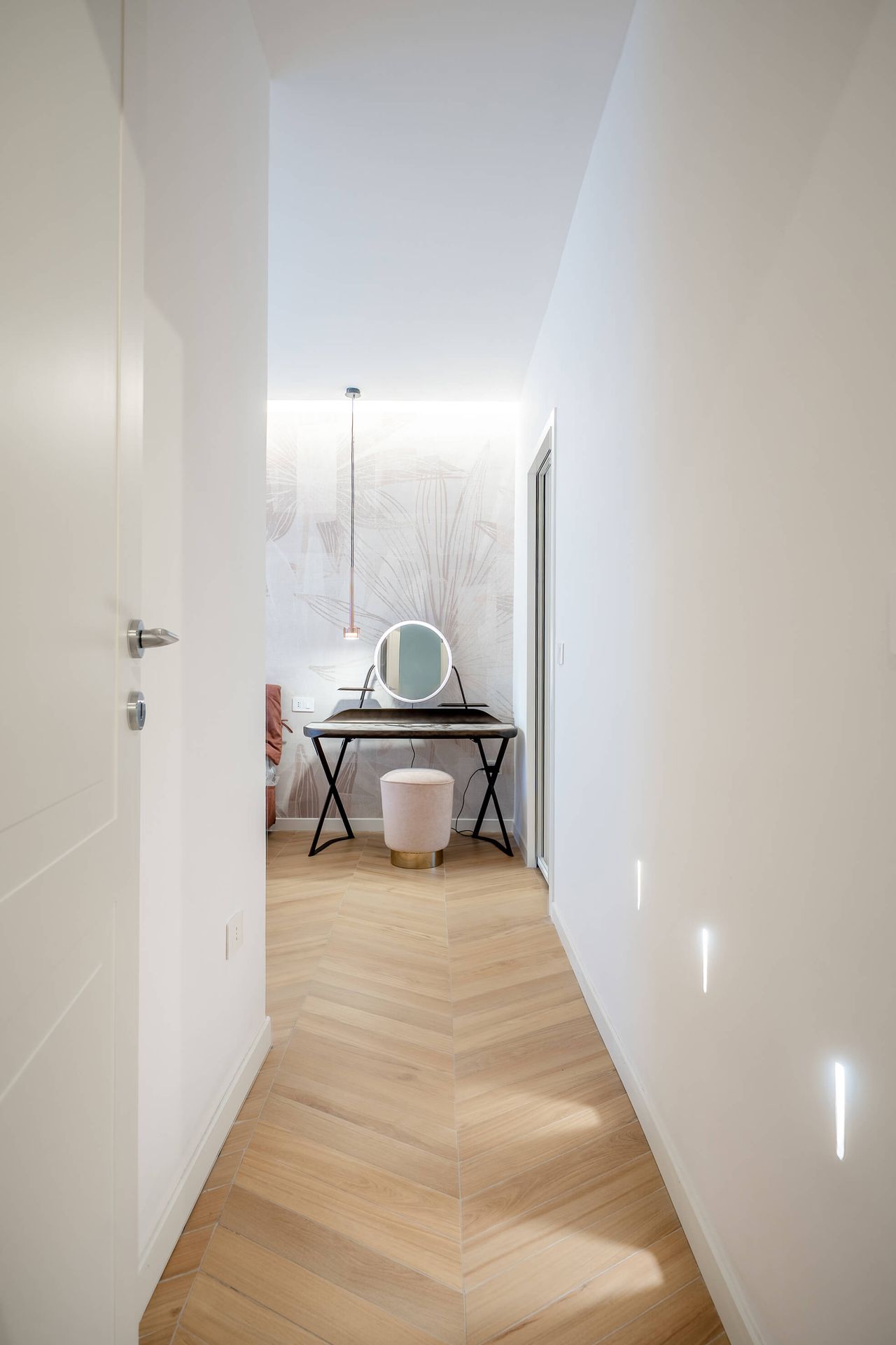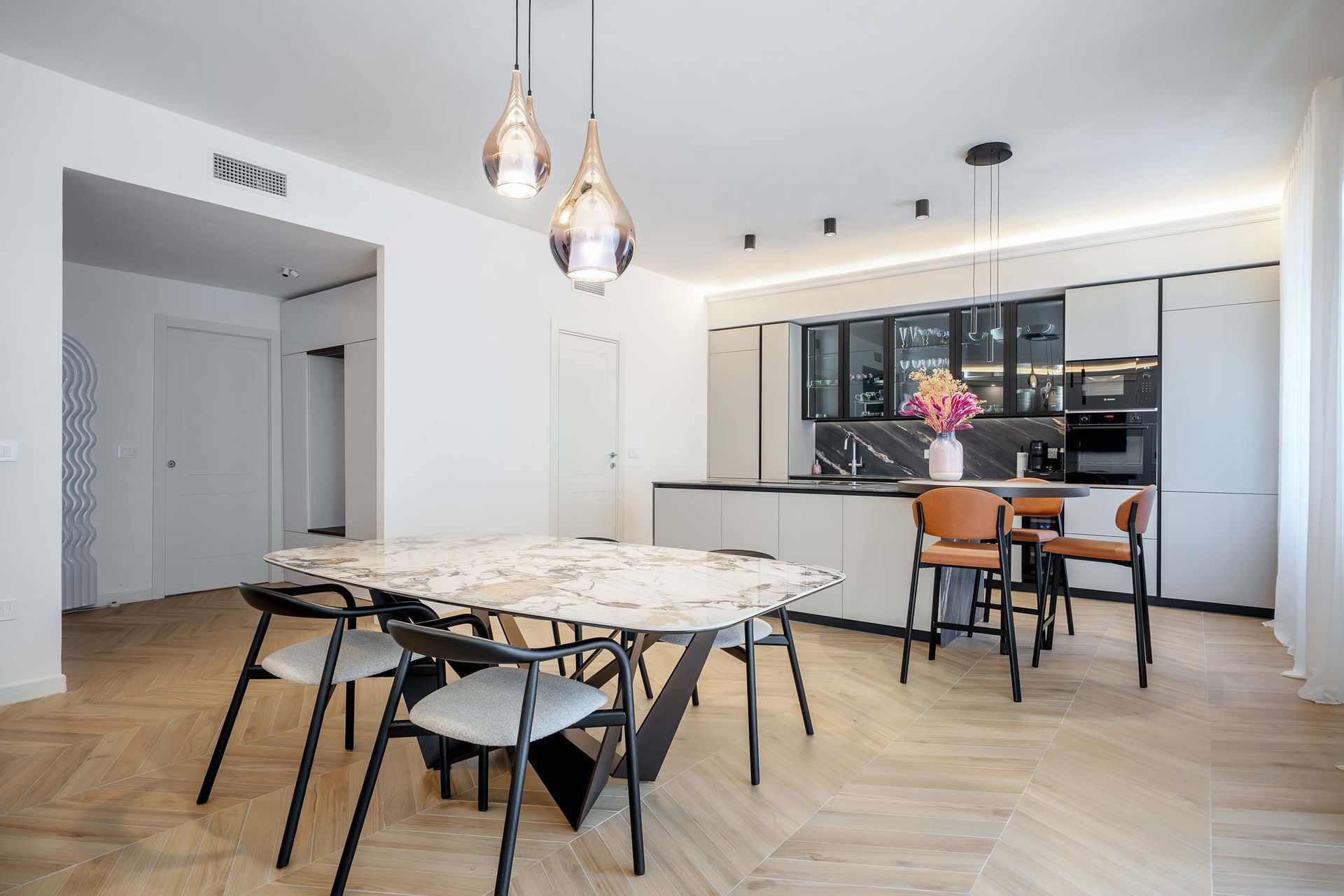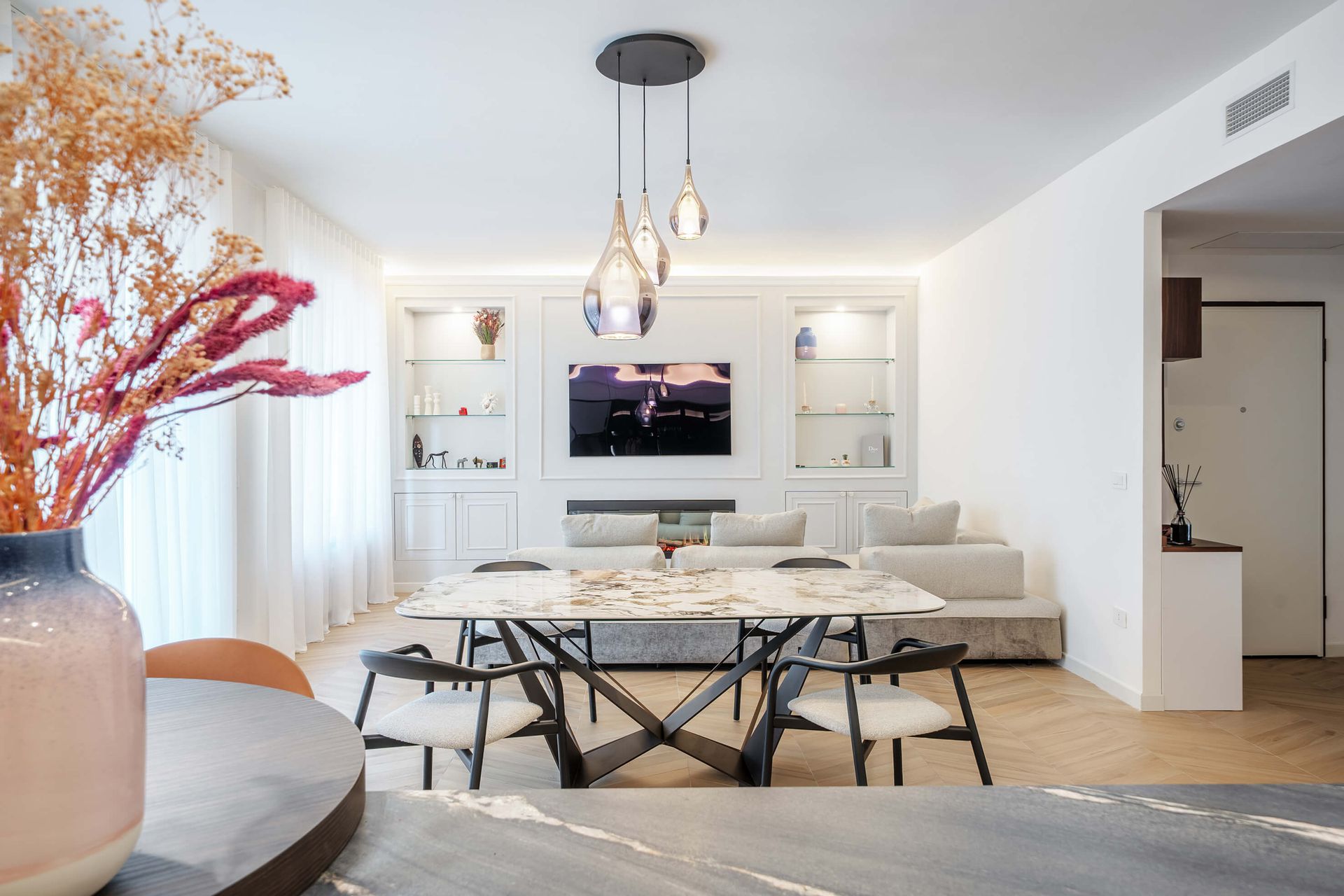 Nel cuore di Milano, questo intervento di ristrutturazione completa ha trasformato un appartamento di 120 mq in uno spazio contemporaneo, funzionale e perfettamente calibrato sulle esigenze della cliente.Il progetto è nato dall’esigenza di ridefinire completamente la distribuzione interna, superando una configurazione ormai datata per dare vita a un’abitazione più fluida, luminosa e coerente con uno stile di vita moderno. Il fulcro dell’intervento è stato lo sviluppo di una grande zona giorno open space, dove cucina e living dialogano in modo armonico, creando un ambiente conviviale e accogliente. A caratterizzare lo spazio, un camino in bioetanolo, elemento scenografico e funzionale che contribuisce a definire l’atmosfera dell’intero ambiente.Particolare attenzione è stata dedicata alla zona notte, progettata come un’area intima e riservata. Qui è stata realizzata una camera padronale con bagno ensuite e una cabina armadio su misura, pensata per rispondere alle esigenze organizzative della cliente senza rinunciare all’eleganza e alla pulizia formale.L’intervento ha incluso anche un completo ammodernamento dello stile, attraverso la scelta di materiali contemporanei, palette cromatiche neutre e dettagli progettuali capaci di valorizzare ogni ambiente, mantenendo un equilibrio tra estetica e funzionalità.In qualità di interior designer e progettista, ho seguito l’intero processo: dalla fase di concept e progettazione preliminare, alla gestione delle pratiche edilizie, fino alla direzione lavori in cantiere. Un approccio integrato che ha garantito coerenza progettuale, controllo dei tempi e cura del dettaglio in ogni fase realizzativa.Il risultato è un appartamento che unisce estetica, comfort e personalizzazione, riflettendo pienamente lo stile e le esigenze di chi lo abita.
