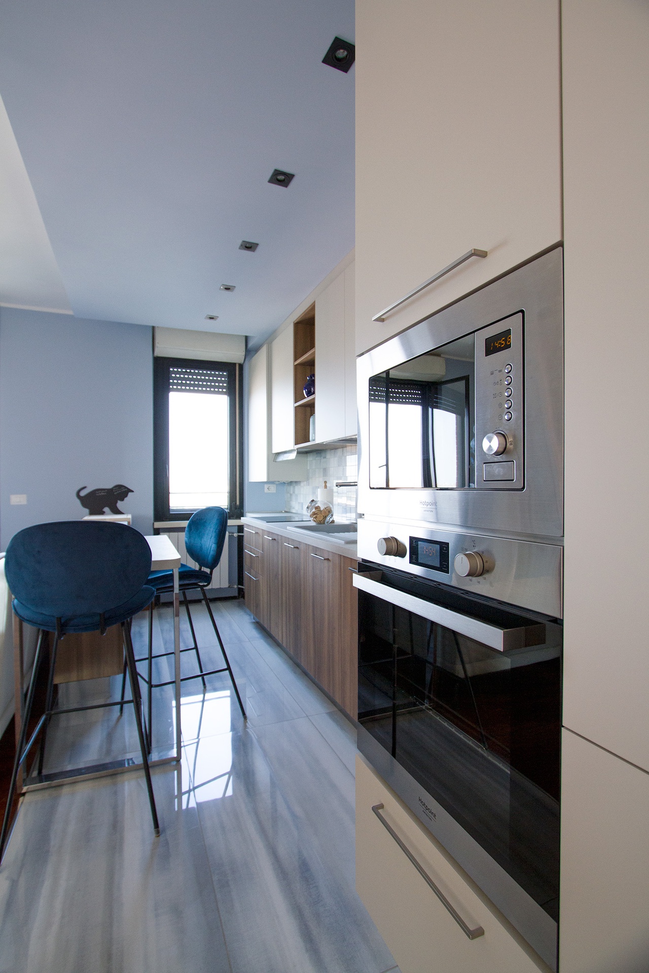 Proprietario ci ha messo quattro obiettivi:- avere un ambiente comfortevole dove ognuno ha la sua stanza e la zona comune che unisce interessi di entrambi.- ricavare lo spazio per i moduli contenitori a scomparsa e avere più armadi. - conservare il pavimento.- nel bagno posizionare un lavabo pratico, profondo.
