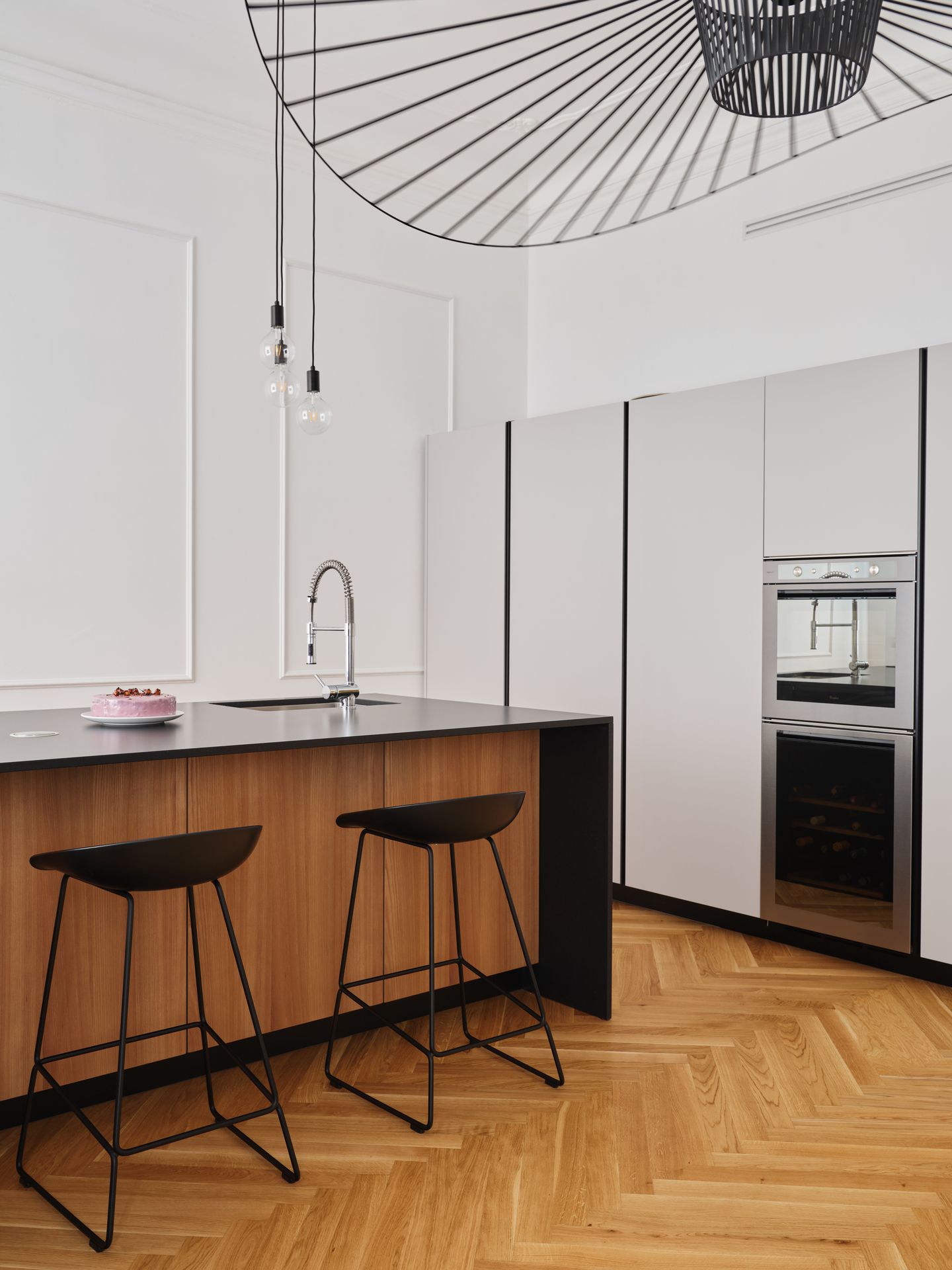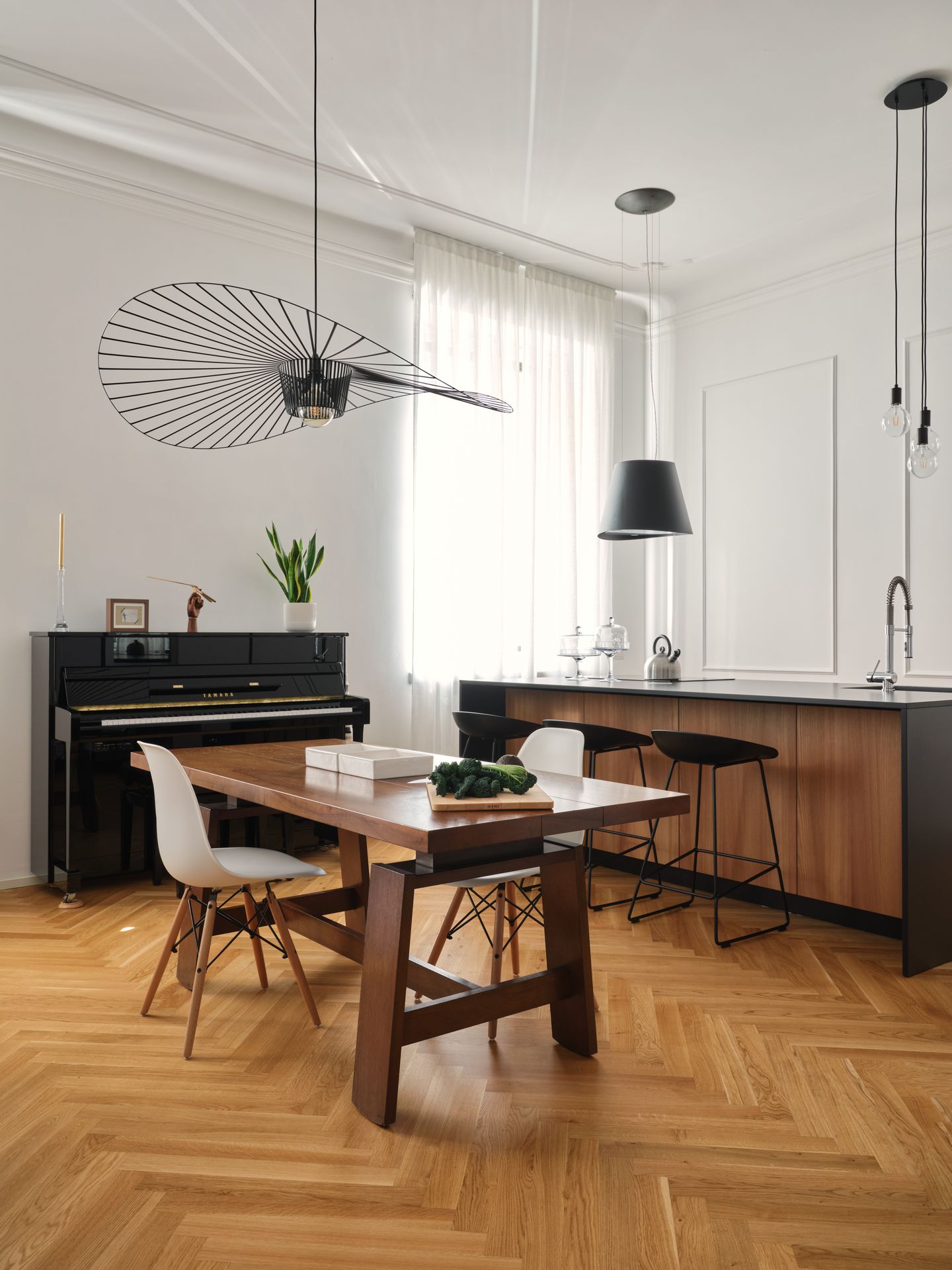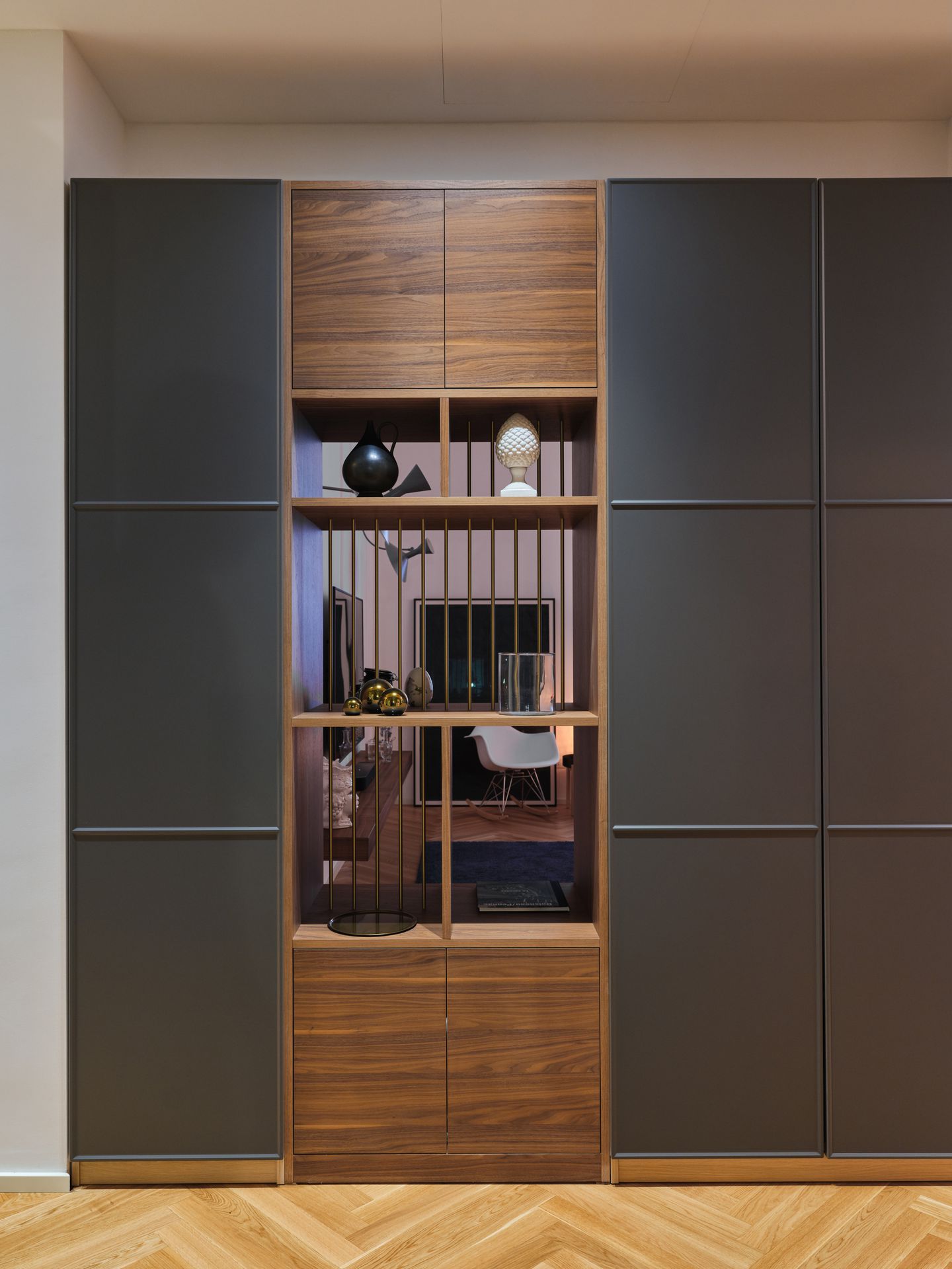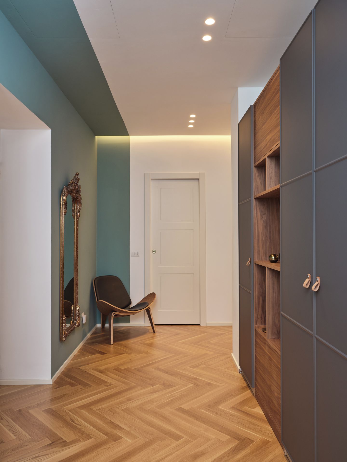 Situato al primo piano di un palazzo di inizio Novecento in zona Città Studi a Milano, Blush Noisette è un progetto di trasformazione che converte un ex ufficio in abitazione, riorganizzando gli spazi in modo più armonico ed equilibrato. La vecchia sala riunioni diventa il cuore della casa, accogliendo living e cucina in un unico ambiente ampio e luminoso, valorizzato dalle grandi altezze, dalla luce naturale e dai decori originali preesistenti.L’ingresso si apre su un corridoio-filtro parzialmente connesso alla zona giorno, da cui si accede anche alla zona notte, allo studio e al bagno ospiti. Un mobile libreria realizzato su disegno definisce il passaggio tra ingresso e soggiorno, introducendo una soglia permeabile che garantisce continuità visiva senza frammentare lo spazio. Anche altri elementi divisori sono concepiti come quinte leggere, capaci di separare mantenendo la percezione di un ambiente unitario.Il progetto si costruisce sul dialogo tra antico e contemporaneo: il pavimento in rovere posato a spina italiana attraversa senza interruzioni tutti gli ambienti, diventando elemento di connessione e continuità, mentre le cornici in gesso a soffitto conservano la memoria storica dell’appartamento. Su questo impianto si inseriscono arredi su misura, superfici essenziali e rivestimenti lignei che definiscono con precisione le diverse funzioni della casa.Nella camera da letto, una parete rivestita in listelli integra e nasconde cabina armadio e bagno padronale, comportandosi più come una quinta architettonica che come un semplice divisorio. Nel bagno ospiti, l’uso di pochi materiali e di un disegno essenziale amplifica la percezione dello spazio e rafforza l’idea di un interno coerente, continuo e misurato.