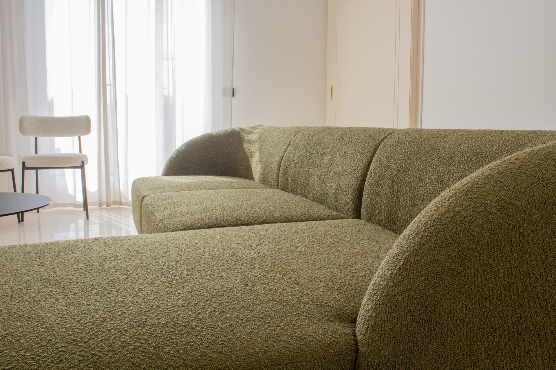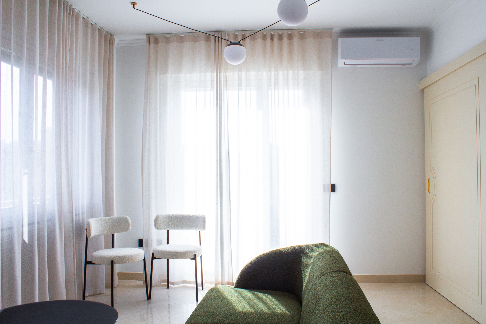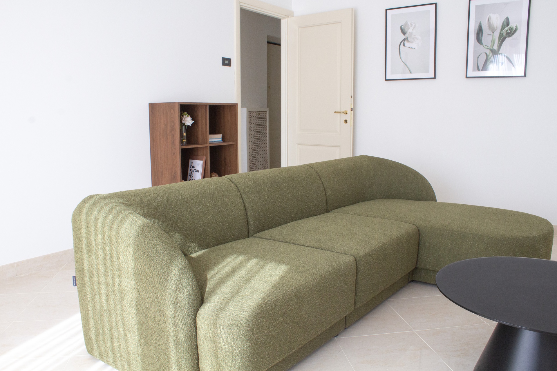 Il progetto di questo appartamento inizia dalla cucina. Cucinare e invitare ospiti per pranzi e cene in compagnia è infatti una delle attività preferite di questi proprietari di casa, durate il loro tempo libero. Si tratta infatti di una casa per le vacanze.Tornando alla cucina, ci siamo ispirati al meraviglioso paesaggio che si gode dalla terrazza: l'entroterra collinare di Bordighera. Da qui la scelta di utilizzare il verde come colore principale della palette colori, insieme al nero per creare un forte contrasto e al bianco per portare luce e quiete in tutti gli spazi. La cucina dal forte gusto classico è stata fornita da Aster su mio disegno, mentre il top è stato realizzato su misura scegliendo un gres Marazzi. Le basi sono in noce canaletto, mentre i pensili sono bianchi e intelaiati. Si è scelto di mantenere la sala minimale per ridurre al minimo le pulizie ogni volta che si decide di tornare a Bordighera. In questo spazio infatti troviamo solo un ampio e comodo divano verde in lana riccia di Micadoni. Uno spazio a lato tra divano e portafinestra permette di collocare il tavolo allungabile della cucina e portarlo in sala per accogliere ospiti. Viene così giustificato anche il lampadario con due punti luce di Faro Barcellona: uno illumina in maniera generale la sala, l'altro in maniera puntuale la zona sopra il tavolo all'occasione.
