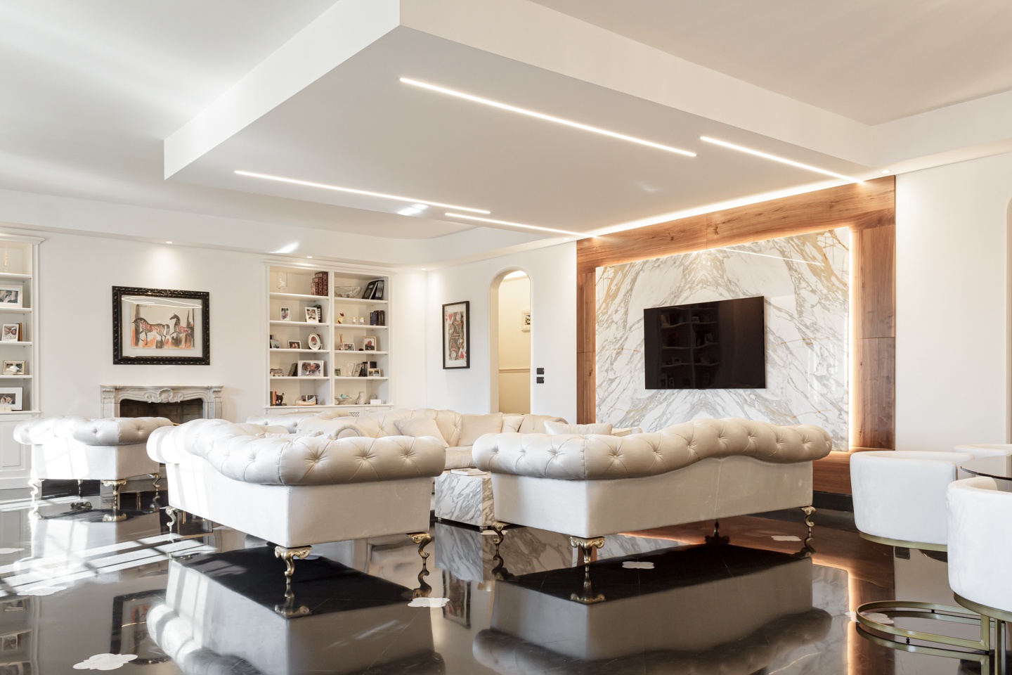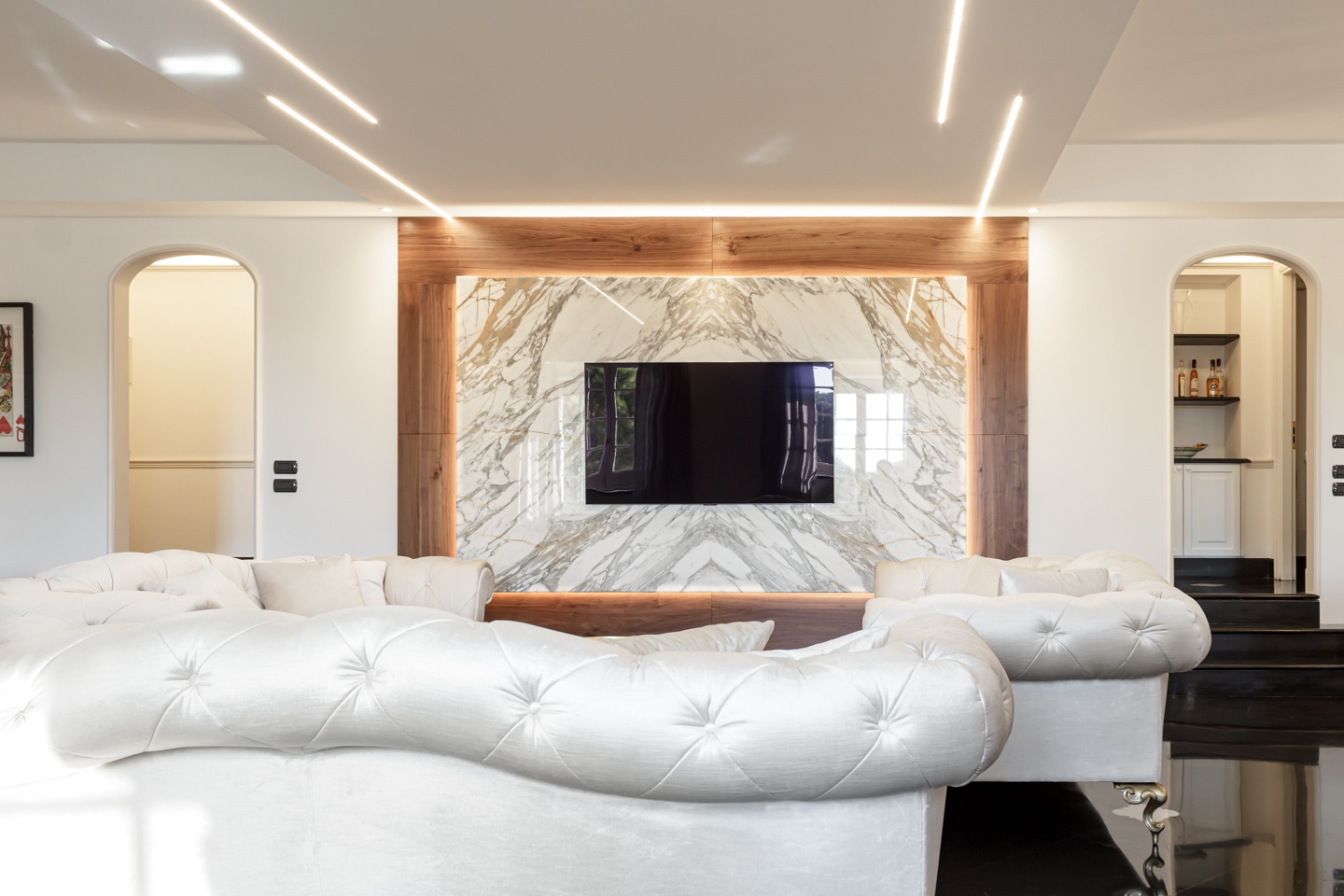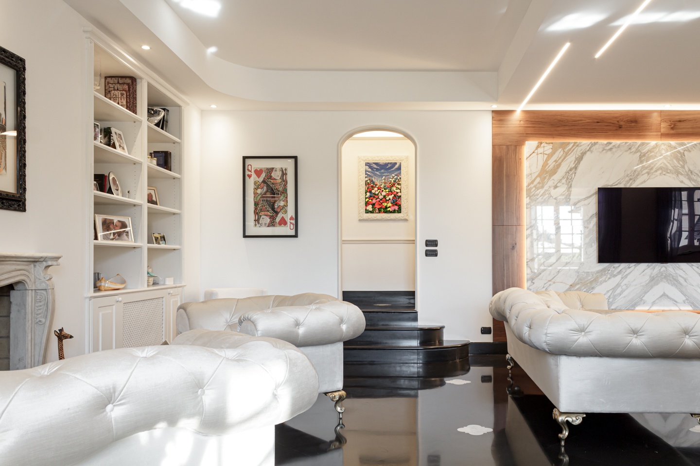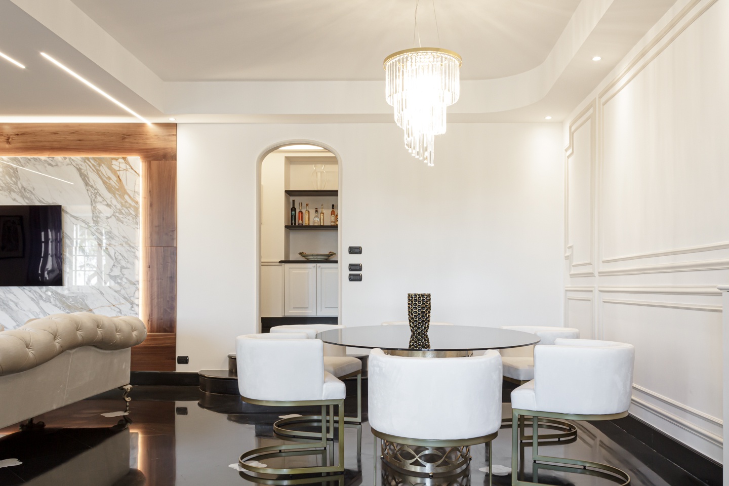 Questo progetto è iniziato con una richiesta ben precisa da parte della committenza, una giovane coppia, che ha espresso delle idee ben chiare fin dal primo momento: arredamento di lusso classico.Un appartamento nel cuore di Genova dal living spazioso, luminoso e con finiture di pregio ha fatto da base alla realizzazione di tutto il resto!Lo stile non poteva che essere il più adatto per questo tipo di appartamento e infatti ne ha valorizzato i dettagli con l’aggiunta di cornici in gesso, colori neutri e pochi arredi, ma di alta qualità come quelli forniti dal brand Cantori. Siamo dunque partiti da una base classica e abbiamo aggiunto influenze parigine, come i dettagli in oro, per impreziosire i punti focali delle varie parti della casa.Non ci siamo solo limitati alla scelta degli arredi come tavoli, divani, lampadari, carte da parati e tendaggi… Ma abbiamo studiato in tutta la sua totalità anche l’illuminazione creando delle velette su cui far correre streap led e faretti.Mentre tutte le varie stanze della casa sono pensate per essere intime e riservate, il grande salone gioca un ruolo di rappresentanza. Per questo motivo la parete centrale del living è stata rivestita interamente in marmo di Calacatta Oro e incorniciata con pannelli in noce canaletto. Questa è la zona tv, attorno alla quale sono stati disposti anche 3 grandi divani.Il richiamo delle finiture color oro è il fil rouge che lega tutti gli ambienti della casa con arredamento di lusso classico.