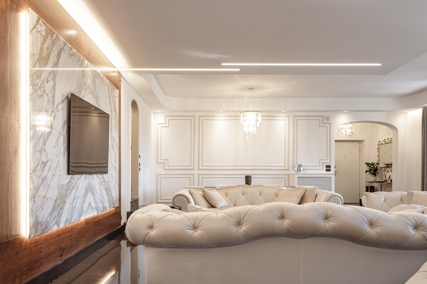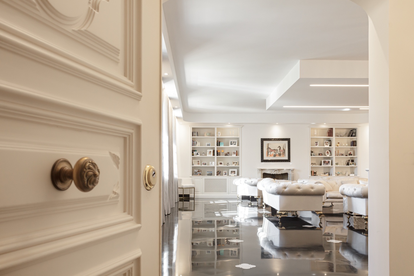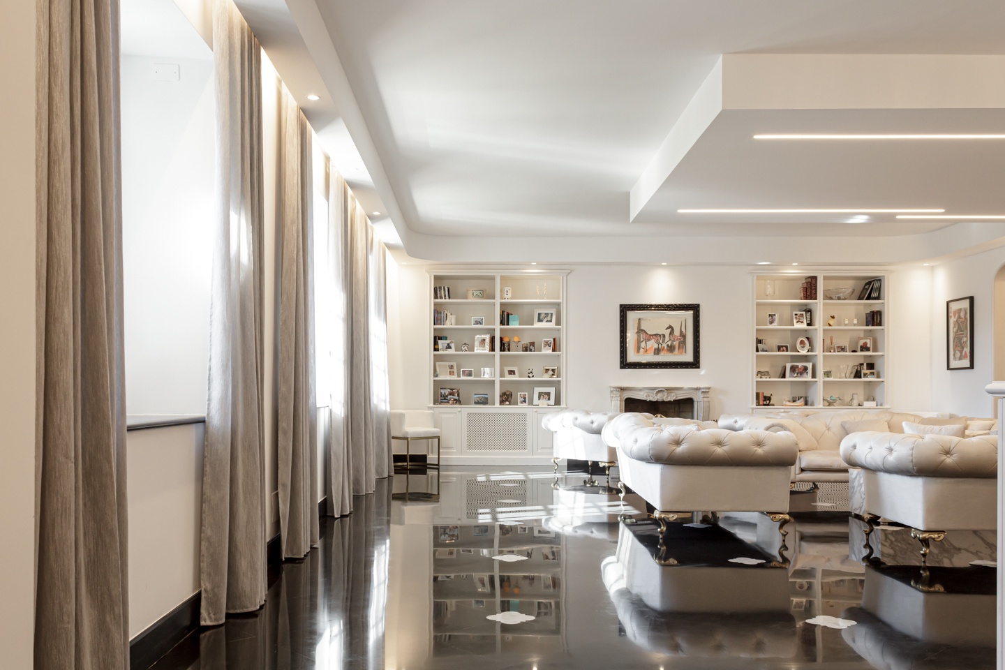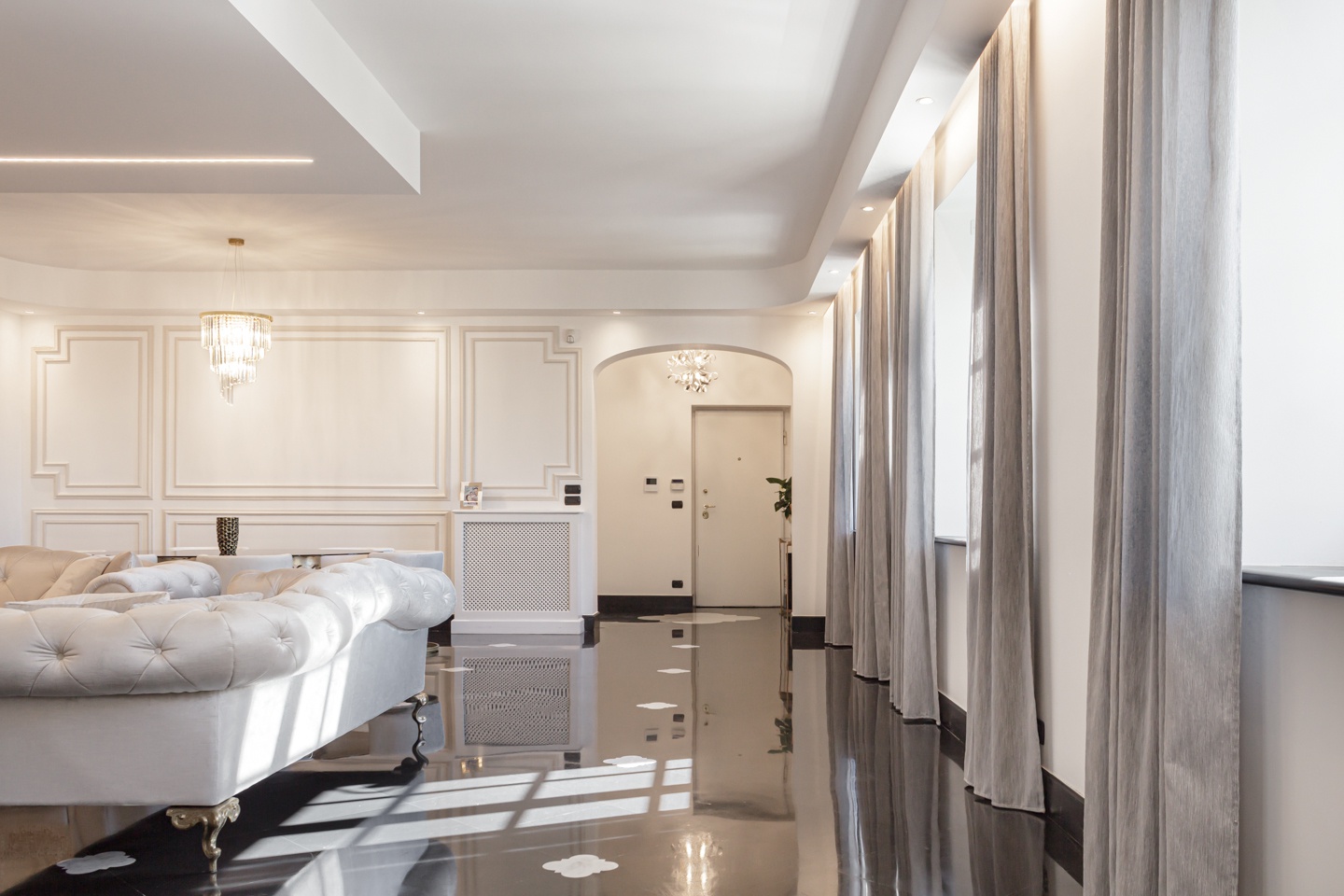 Questo progetto è iniziato con una richiesta ben precisa da parte della committenza, una giovane coppia, che ha espresso delle idee ben chiare fin dal primo momento: arredamento di lusso classico.Un appartamento nel cuore di Genova dal living spazioso, luminoso e con finiture di pregio ha fatto da base alla realizzazione di tutto il resto!Lo stile non poteva che essere il più adatto per questo tipo di appartamento e infatti ne ha valorizzato i dettagli con l’aggiunta di cornici in gesso, colori neutri e pochi arredi, ma di alta qualità come quelli forniti dal brand Cantori. Siamo dunque partiti da una base classica e abbiamo aggiunto influenze parigine, come i dettagli in oro, per impreziosire i punti focali delle varie parti della casa.Non ci siamo solo limitati alla scelta degli arredi come tavoli, divani, lampadari, carte da parati e tendaggi… Ma abbiamo studiato in tutta la sua totalità anche l’illuminazione creando delle velette su cui far correre streap led e faretti.Mentre tutte le varie stanze della casa sono pensate per essere intime e riservate, il grande salone gioca un ruolo di rappresentanza. Per questo motivo la parete centrale del living è stata rivestita interamente in marmo di Calacatta Oro e incorniciata con pannelli in noce canaletto. Questa è la zona tv, attorno alla quale sono stati disposti anche 3 grandi divani.Il richiamo delle finiture color oro è il fil rouge che lega tutti gli ambienti della casa con arredamento di lusso classico.