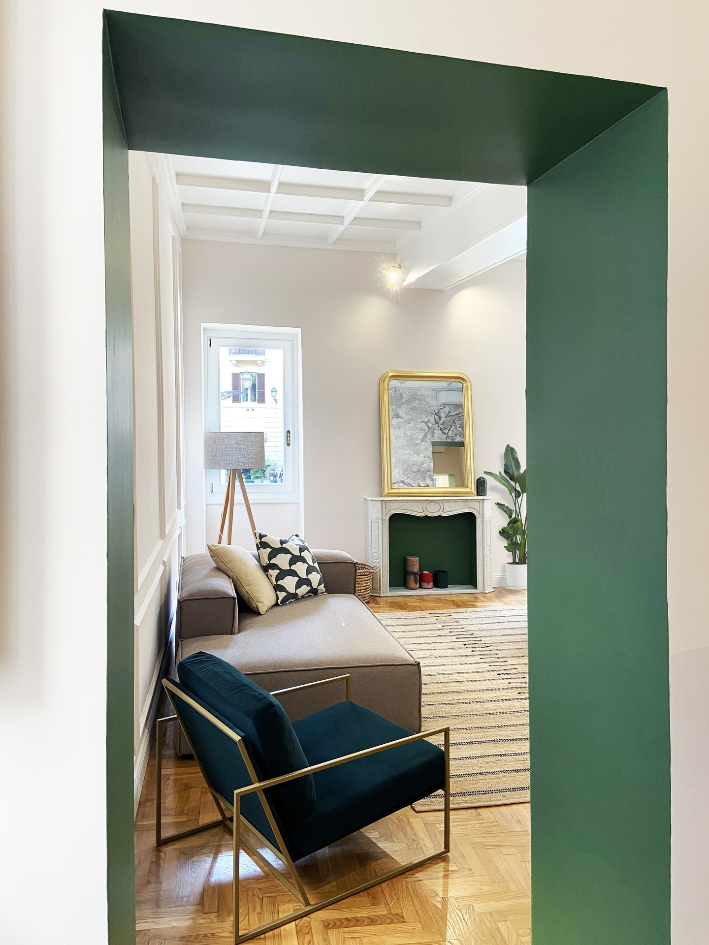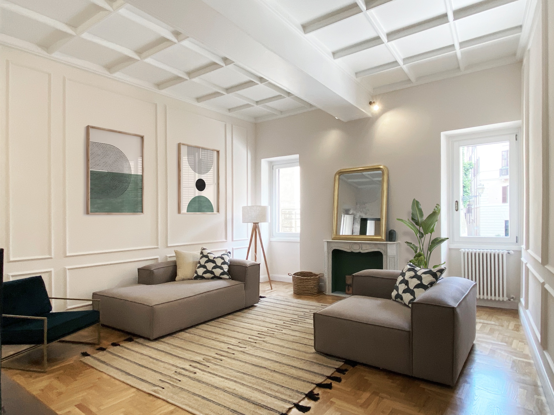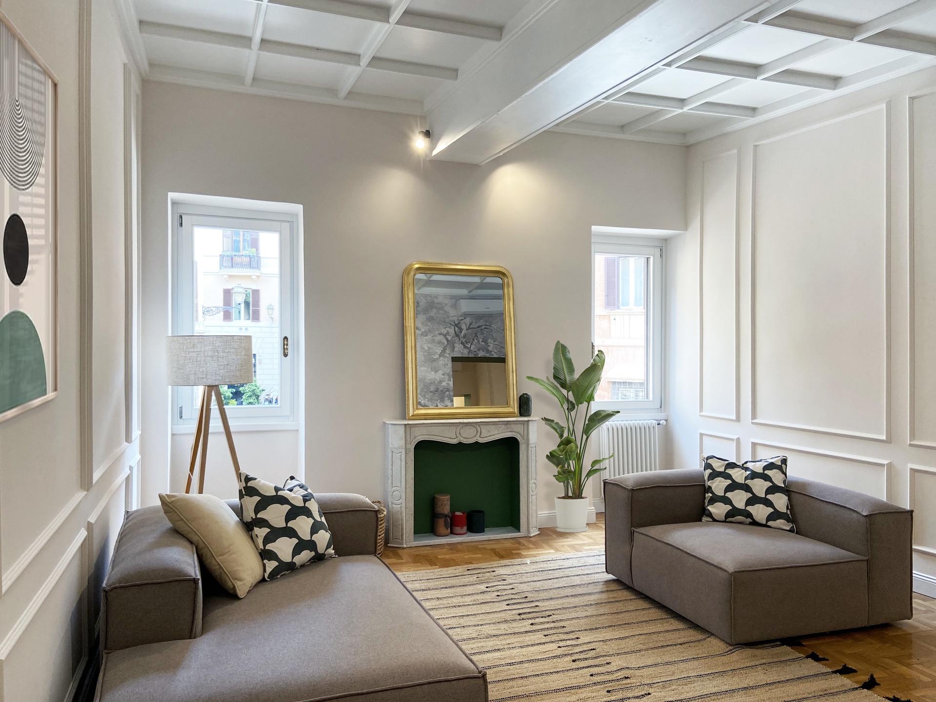 Un appartamento romano nel cuore della città storica, ospitato in uno stabile seicentesco, dove eleganza e carattere si intrecciano in un raffinato dialogo tra classicità e contemporaneità.Le pareti, animate da profili decorativi, scandiscono gli ambienti con ritmo e profondità, mentre il camino originale in marmo diventa il fulcro emotivo e stilistico della zona giorno: un frammento autentico di storia che dona identità e calore.L’ampia area living si apre con naturale fluidità sulla cucina a isola attraverso due portali valorizzati da un intenso verde, creando un ambiente aperto e conviviale. Al centro, un’isola su misura in pietra, affiancata da un piano in legno sospeso che si trasforma in tavolo, assume il ruolo di elemento scultoreo e materico, perfettamente integrato nell’insieme. Lo spazio diventa così un vero palcoscenico di convivialità.La luce naturale avvolge ogni superficie, esaltando una palette calda e neutra, mentre tocchi di ottone spazzolato regalano bagliori eleganti e misurati, contribuendo a un’atmosfera sofisticata e accogliente.La zona notte è un’oasi di quiete: carte da parati delicate, tonalità morbide e un attento studio della luce costruiscono un ambiente intimo e rilassante. Ogni dettaglio, dal più architettonico al più funzionale, è stato progettato per elevare la qualità dell’abitare e rendere unico ogni momento vissuto all’interno della casa.Questo progetto non è soltanto un appartamento: è un nuovo modo di vivere lo spazio, dove emozione, estetica e benessere si fondono in un equilibrio armonioso.