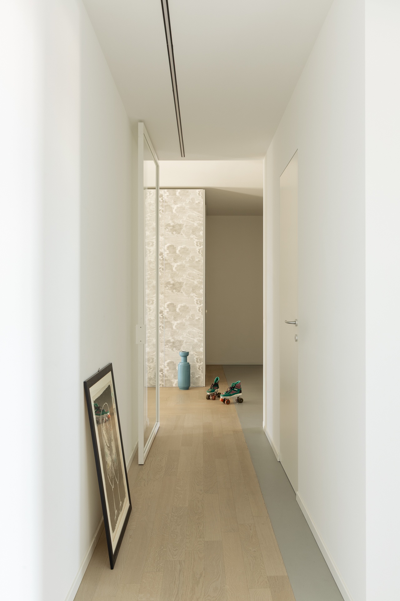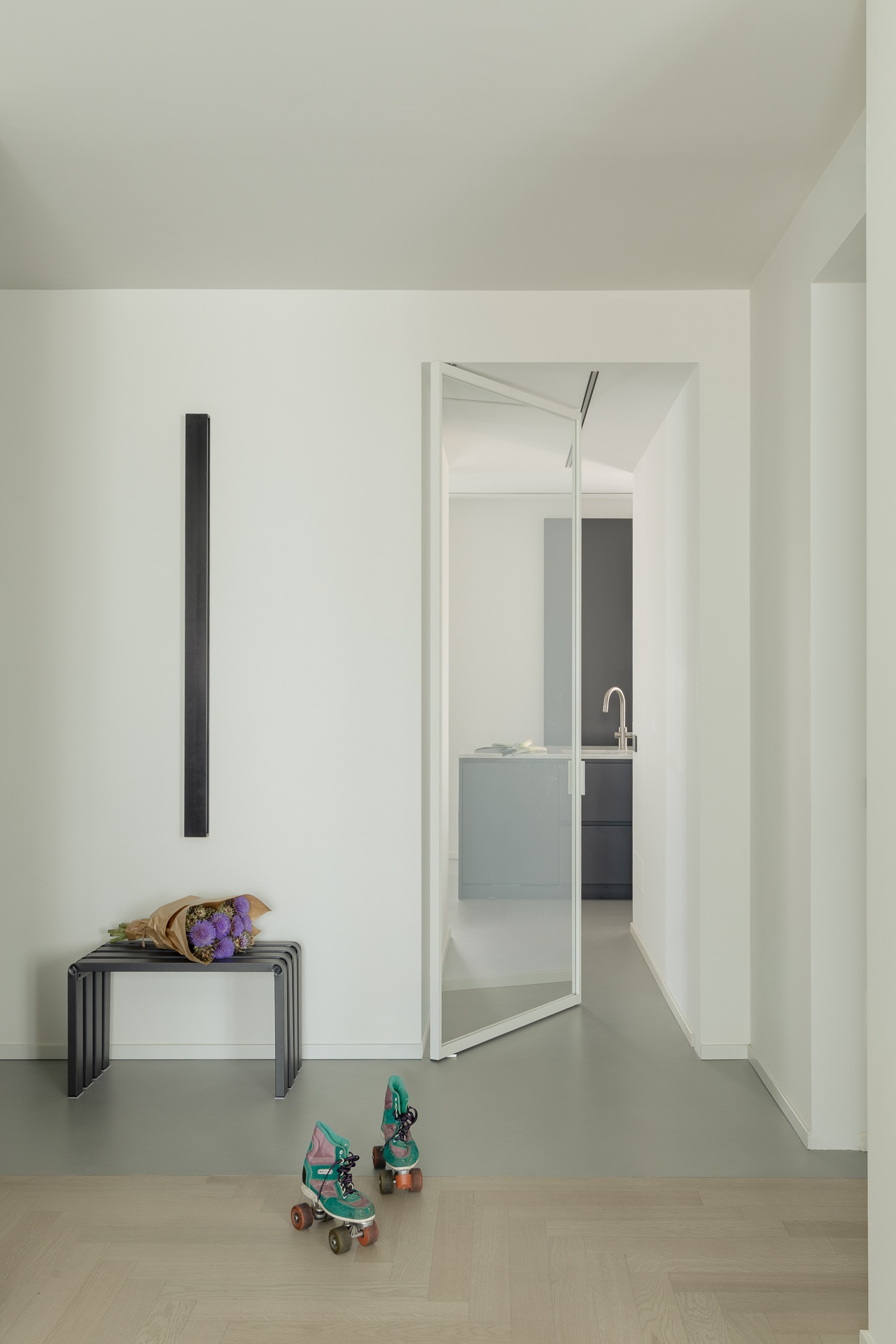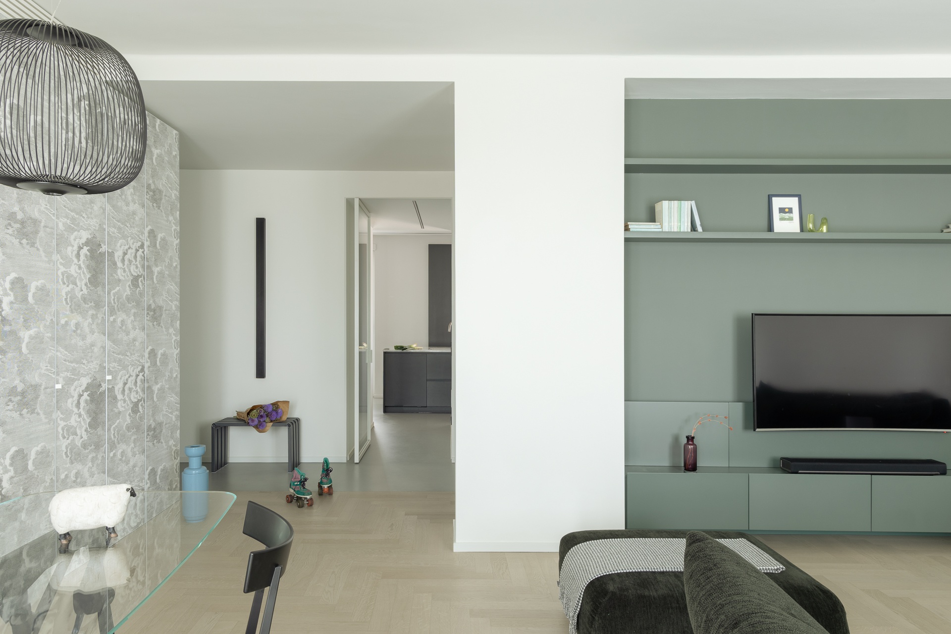 Questo appartamento milanese è stato ristrutturato per una famiglia di tre persone.Lo stato di fatto aveva un ingresso angusto ed una grande superficie destinata alla distribuzione; inoltre, la cucina era piccola per le esigenze della famiglia.Abbiamo scelto di aprire l’ingresso sul soggiorno e completarlo con un grande armadio.Dall’ingresso si accede ora alla zona notte ed alla nuova cucina, ampliata annettendo una camera da letto che non serviva.Le camere da letto erano adeguate alle esigenze e non le abbiamo modificate, mentre dal disimpegno abbiamo ricavato una comoda cabina armadio ed un nuovo bagno, oltre che ampliare e riorganizzare quello esistente.