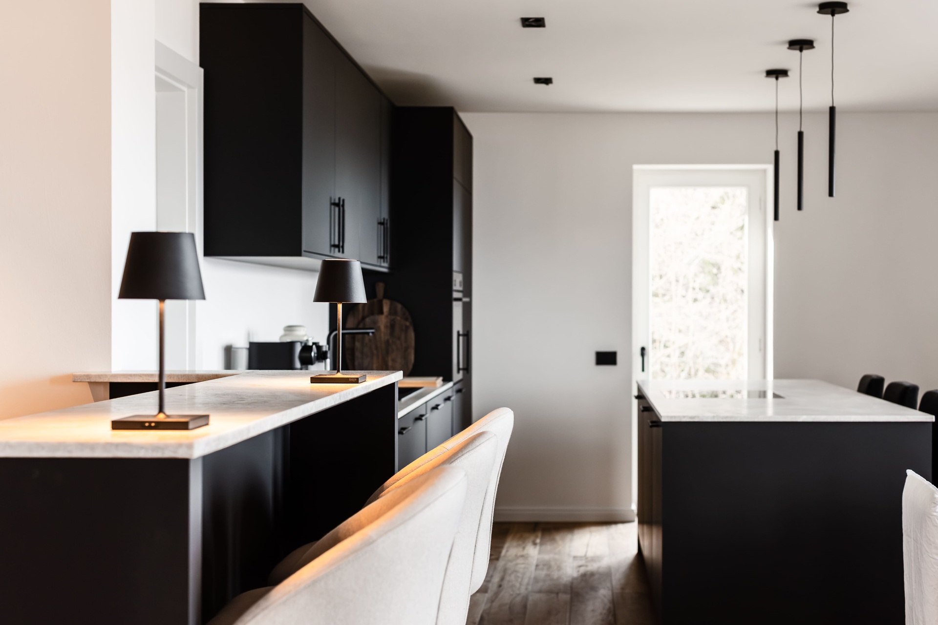 l progetto tratta un appartamento di circa 140mq situato nell'altopiano del Nevegal (comune di belluno); un appartamento acquistato da una coppia proveniente da Brema e che utilizzerà come casa vacanza, soprattutto nel periodo invernale.L'appartamento si caratterizza per una grandissima zona giorno, dove su di un lato abbiamo cucina, bar e tavolo da pranzo, tutto in nero di grandissima elegenza, mentre dall'altro la zona soggiorno dai colori più luminosi, dove il cliente si può rilassare ed ammirare la bellissima vista esterna (infatti non è stata neanche installata una televisione, in quanto la volontà è quella di immergersi più possibile nella natura e staccare dalla vita quotidiana).Una grande camera da letto matrimoniale, bagno privato (munito di doccia walk-in e sauna, con una porta finestra per il percorso caldo-freddo tipico dei centri benessere) ed una piccola cabina armadio completano l'ala di destra dell'appartamento.Mentre la cameretta per la figlia, un bagno ospiti (dello stesso stile del privati, ma privo della sauna), ed una camera per gli ospiti, completano l'ala di sinistra.La forza del progetto credo vivamente sia la sua capacità di legare prodotti provenienti da mondi completamente diversi, abbiamo infatti la cucina ed il bar realizzati da un falegname da Brema, tavolo e sedie della zona giorno come prodotto di design italiano (sedie Ghost di Gervasoni e tavolo in legno carbonizzato di Cazzaniga per MDF) fino anche a prodotti provenienti da grandi catene; simbolo a mio avviso di come si possa ottenere ottimi risultati anche con prodotti più comuni.Lo stile della casa è il risultato di due culture, quella nordica dei clienti e quella italiana (con un occhio di riguardo alla montagna) del progettista; quindi abbiamo diversi elementi in legno (pavimento, davanzali, tavolo) che richiamano la natura del posto, il top in pietra naturale per la cucina ed il bar, oppure l'effetto pietra dei bagni e l'eleganza-freddezza tipica dei paesi nordici.