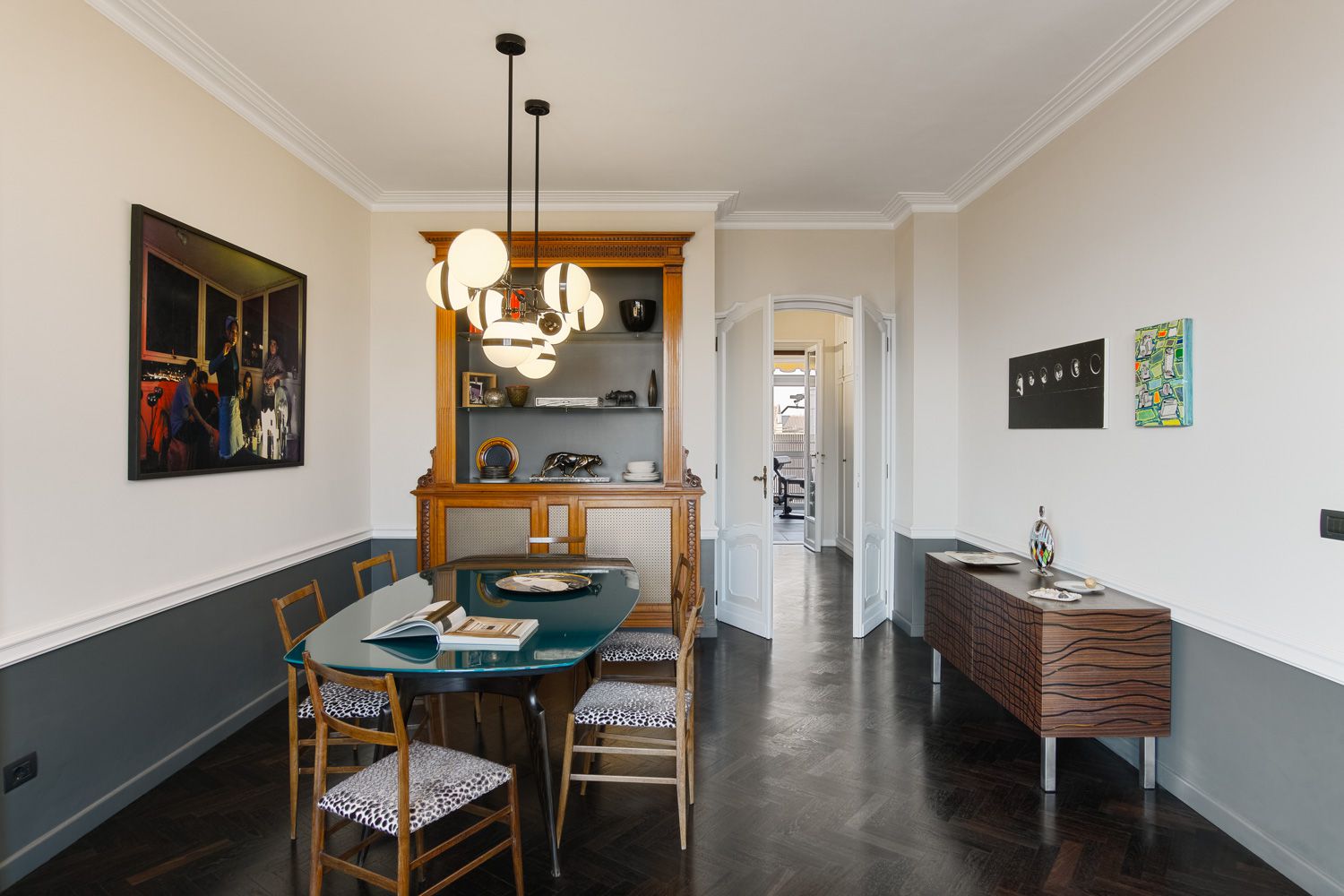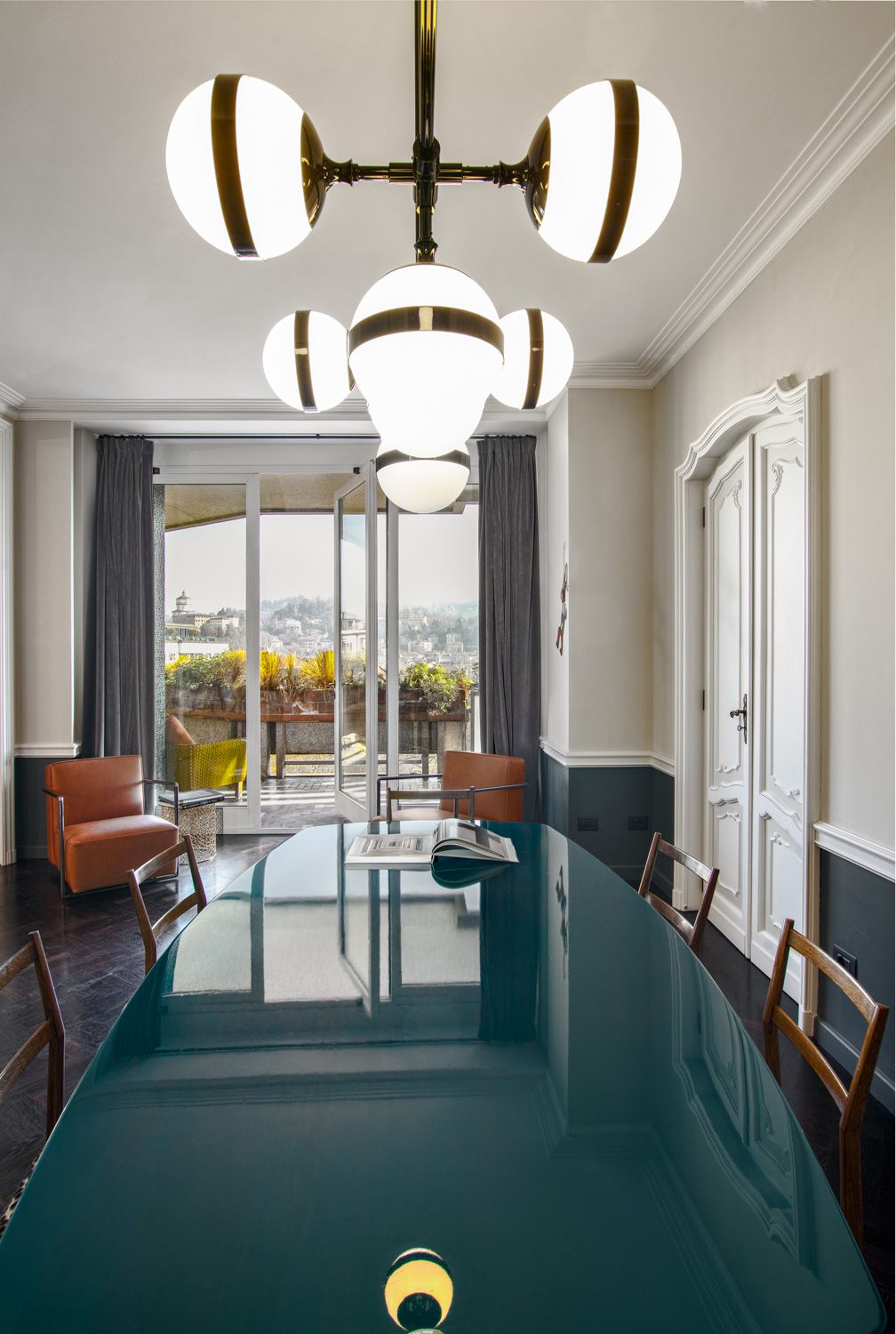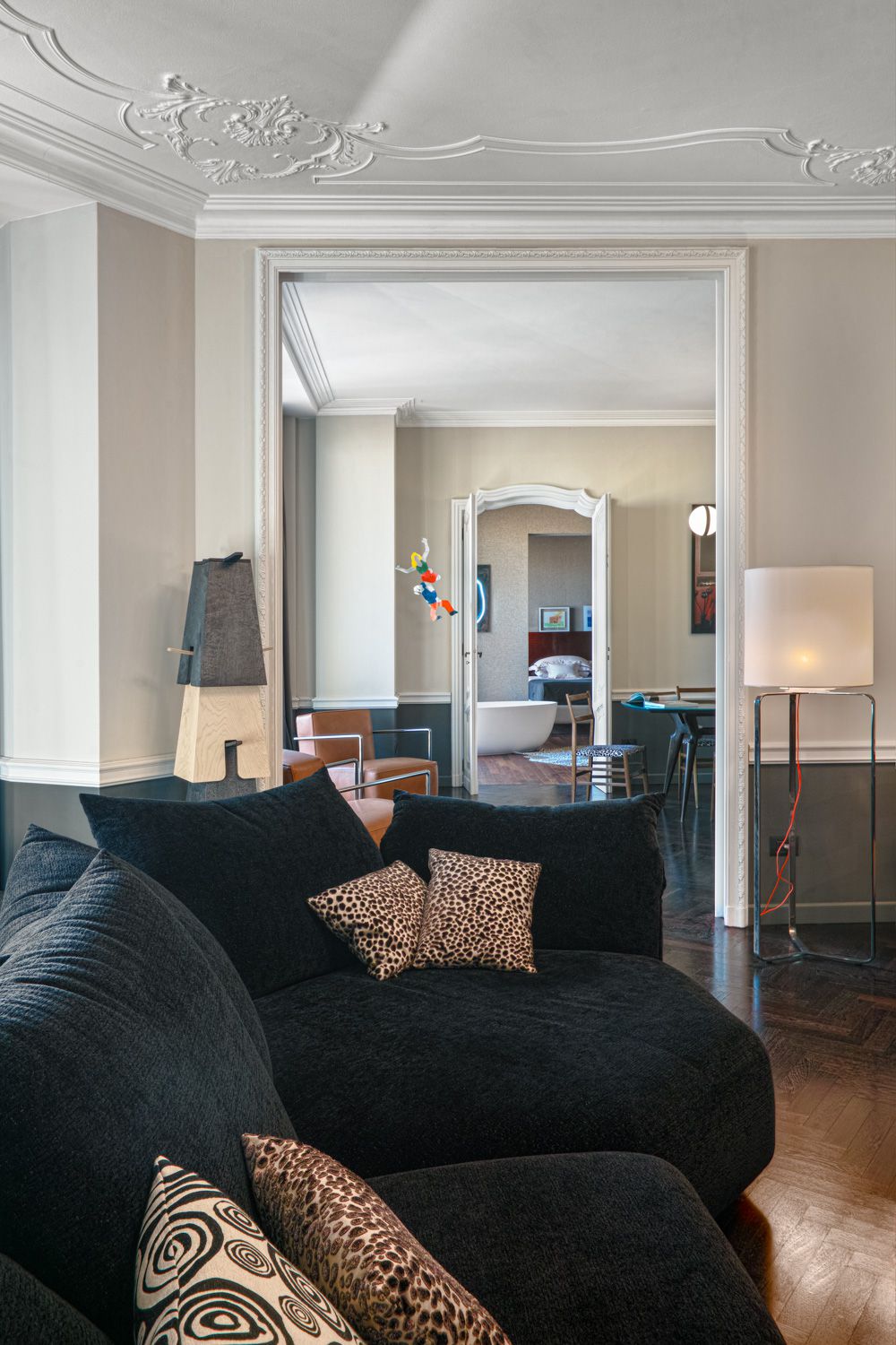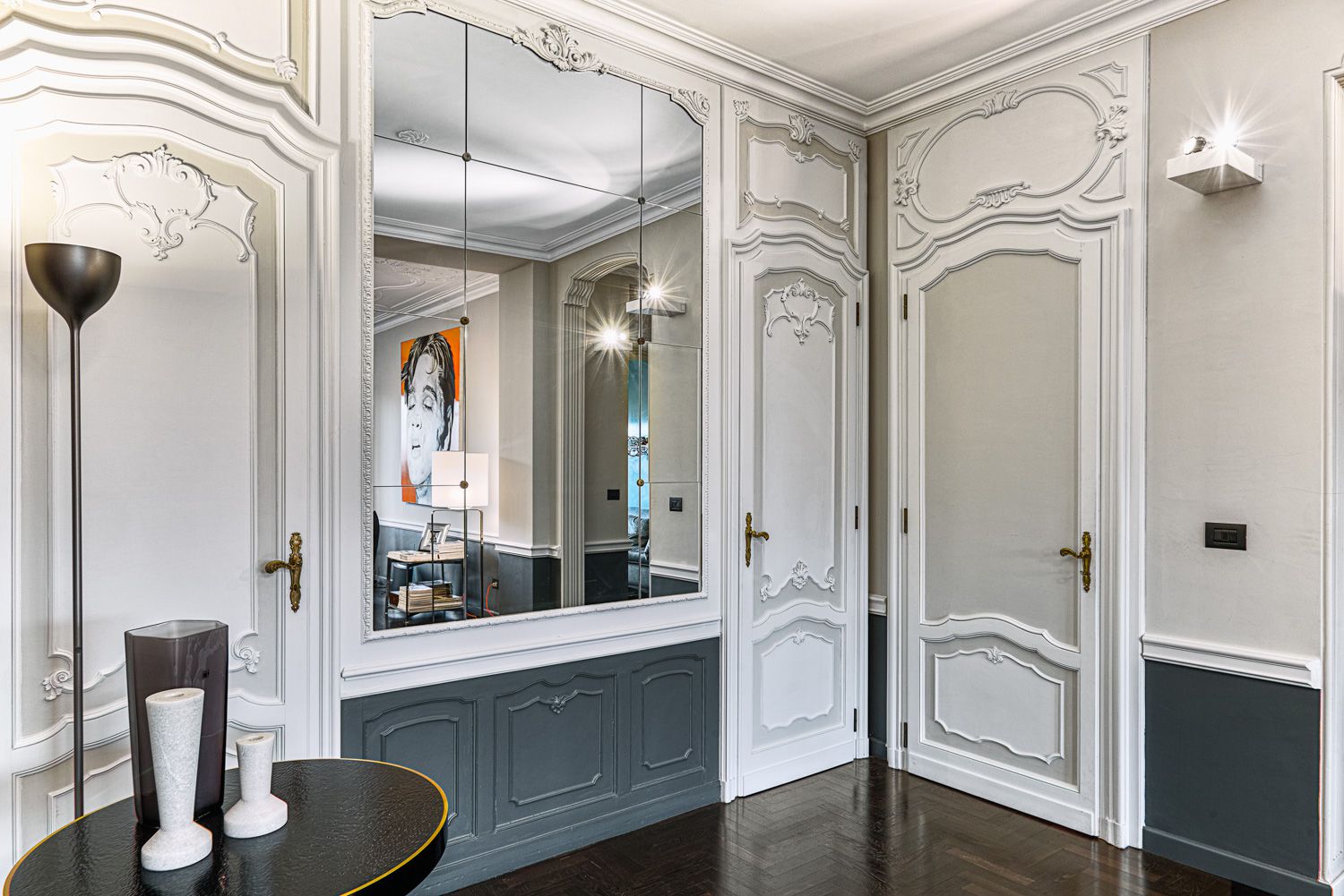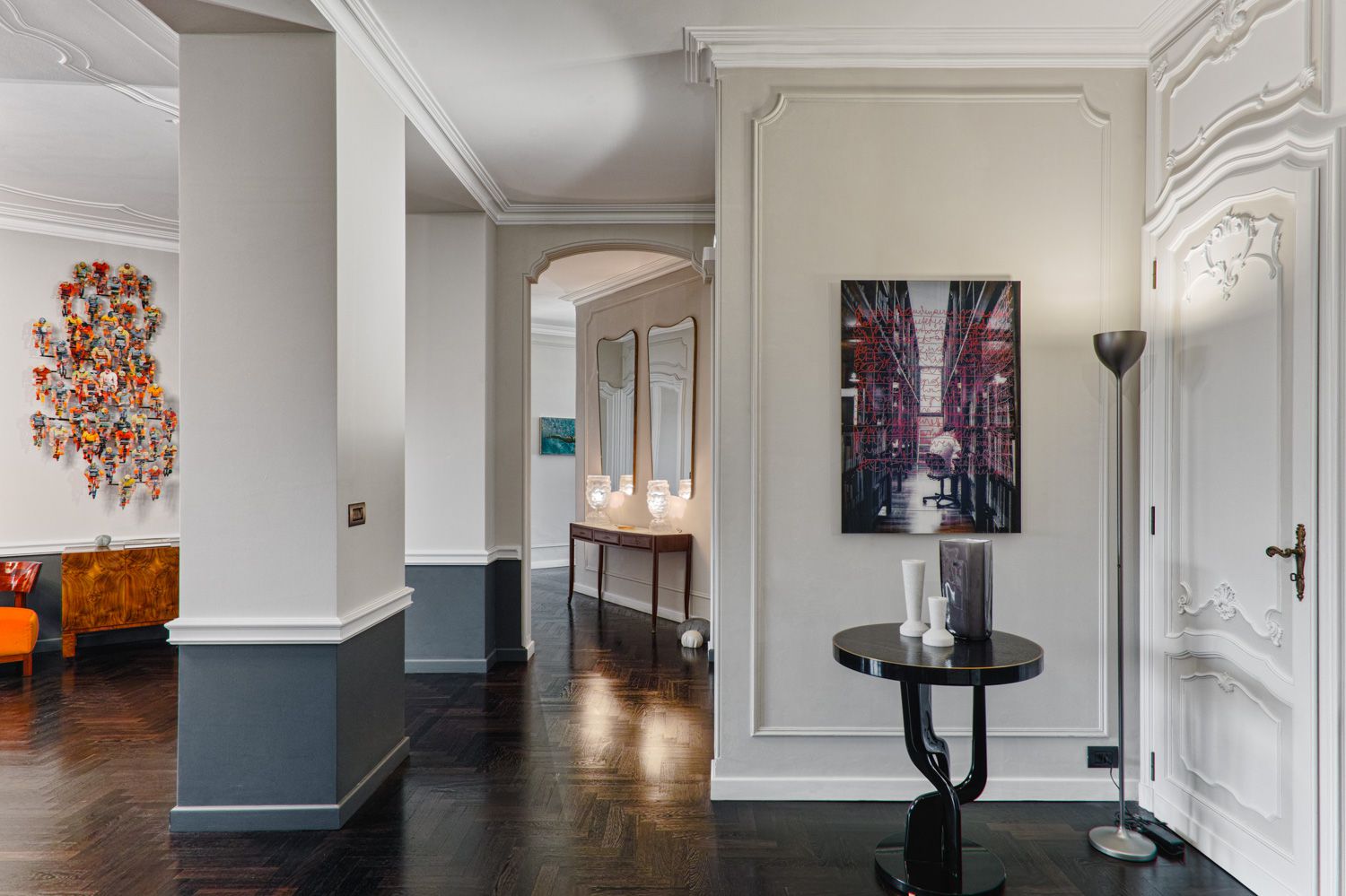 Manhattan a Torino: L’Equilibrio tra Storia e Contemporaneità | b5 art Arch StudioNel cuore di Torino, in un edificio iconico che rappresenta l’eccellenza della qualità progettuale degli anni ’60, l’intervento firmato da b5 art Arch Studio trasforma un appartamento affacciato sul Parco del Valentino in un teatro di dialogo tra epoche. Il progetto, denominato simbolicamente “Manhattan a Torino”, ricerca una sintesi perfetta tra l’eleganza della tradizione borghese locale e l’estetica cosmopolita ispirata al dinamismo della New York di metà secolo.Visione Architettonica e PreesistenzeL’immobile sorge in un contesto residenziale di lusso risalente a un periodo d’oro per l’architettura torinese, epoca di grandi contaminazioni stilistiche. L’approccio di b5 art Arch Studio è stato rigorosamente conservativo, mirato a far evolvere le preesistenze verso un linguaggio contemporaneo senza alterarne l'essenza.Contrasti Iconici: Gli interni originali si distinguevano per la convivenza tra elementi classici (porte in stile rococò, modanature elaborate e boiserie teatrali) e innovazioni tecniche d'avanguardia come le ampie finestre pivotanti.Distribuzione Spaziale: L’impianto distributivo originale è stato rispettato per garantire continuità visiva; la sequenzialità degli ambienti favorisce un flusso armonioso che amplifica la luce naturale e la percezione dello spazio.Scelte Materiche e Dettagli ProgettualiUn ruolo centrale nel rinnovamento è affidato alla ridefinizione delle superfici e degli arredi, curata meticolosamente per rafforzare l'identità del progetto:La Pavimentazione: Un intervento chiave ha riguardato la sostituzione del marmo originale con un parquet in legno scuro posato a spina di pesce. Questa scelta reinterpreta il linguaggio geometrico degli anni '60 attraverso una palette cromatica contemporanea, creando un contrasto raffinato con le pareti chiare e donando agli ambienti una nuova intimità.Interior Design e Arte: Gli arredi sono stati selezionati per dialogare con gli elementi storici preesistenti. Mobili di design contemporaneo convivono con pezzi vintage, mentre le pareti accolgono opere d'arte ispirate alla Pop Art, che evocano l'energia dinamica della Manhattan di quegli anni.Il risultato finale è un racconto visivo stratificato dove il valore testimoniale dell'arredamento borghese torinese degli anni '60 incontra una visione internazionale, definendo un equilibrio perfetto tra memoria e modernità.
