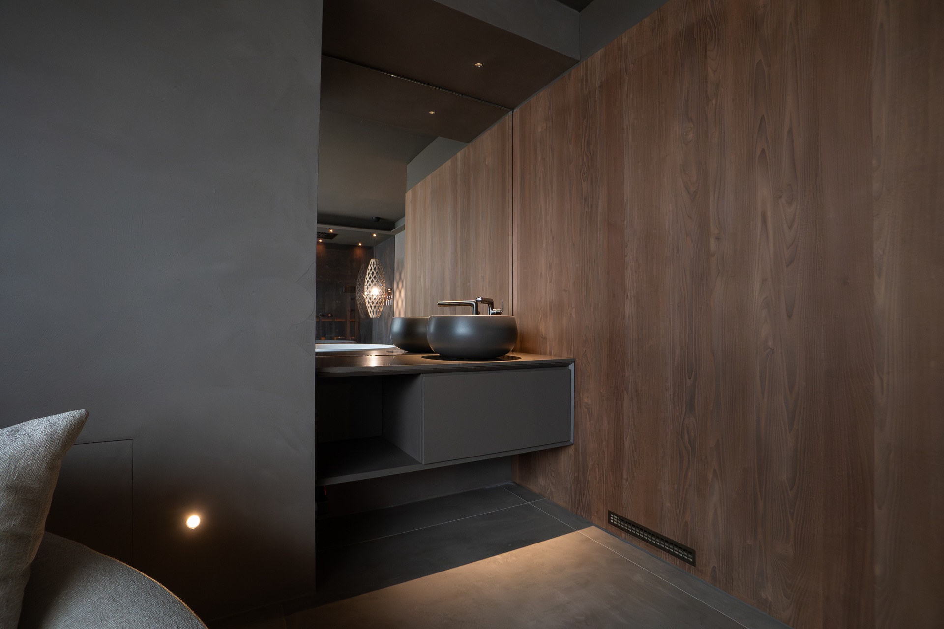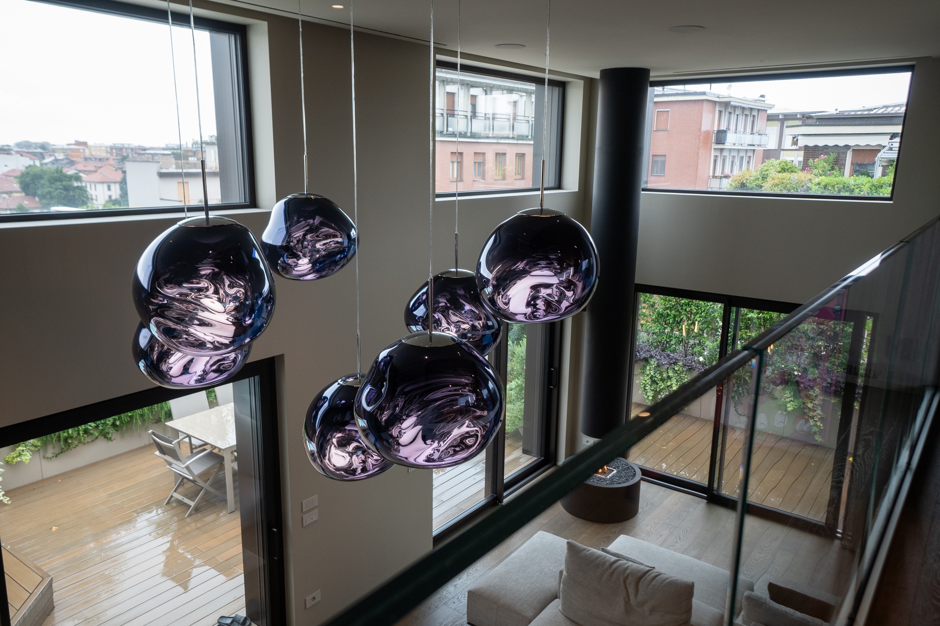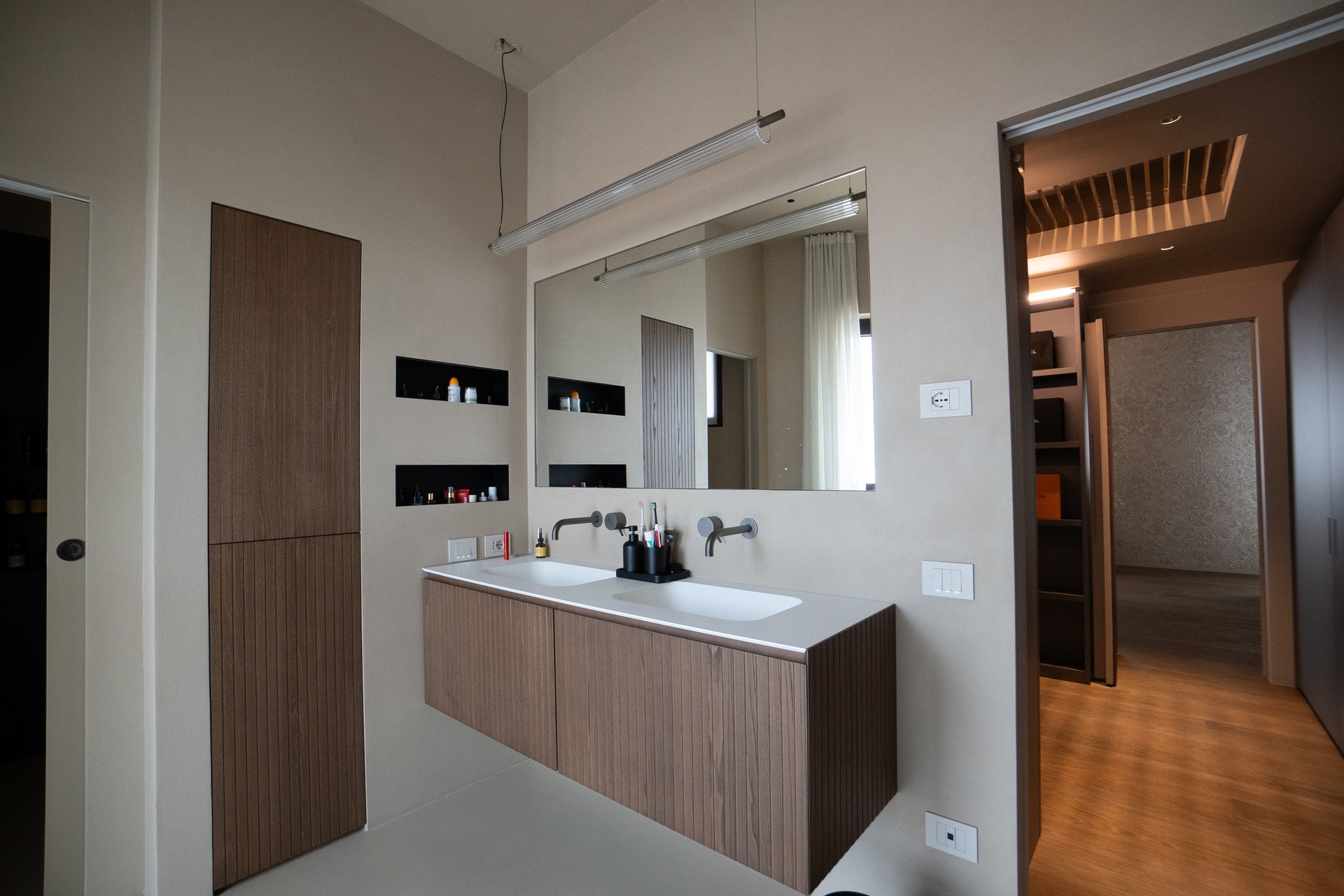 L'abitazione è composta da un primo appartamento situato al quinto piano, che comprende una zona benessere con spa, un bagno annesso e una palestra. Questa zona si collega alla zona notte, dove troviamo due camere da letto: la camera del figlio con bagno privato e cabina armadio, e una camera destinata agli ospiti, oltre a uno studio. Risalendo, si accede al sesto piano, che rappresenta l'attico. Questo spazio è costituito da un ampio open-space alto 4,80 m che include una cucina, una sala da pranzo e un accogliente salotto. Proseguendo, si accede alla zona notte, dove si trova un bagno di servizio, una lavanderia, e la camera master, anch'essa con un'altezza di 4,80 m; dotata di una cabina armadio su due piani, bagno privato e zona beauty.L'ultimo piano include un soppalco, uno spazio dedicato allo svago, con grande tavolo da bigliardo e videogiochi retrò con vista sul soggiorno; Nel soppalco troviamo anche la zona cinema e il locale hobbies, divisi dal resto della casa da una grande porta in tessuto. L'attico è avvolto da un grande terrazzo con vasca idromassaggio, zona pranzo, zona conversazione e una cucina esterna per barbeque e forno pizza.Tutto l'appartamento si declina sui colori neutri, con gioco di chiari e scuri. I clienti ci hanno permesso di spaziare molto con texture e finiture pregiate, che hanno reso il loro appartamento davvero unico.
