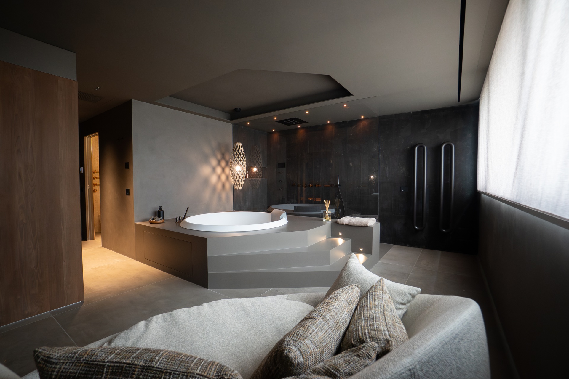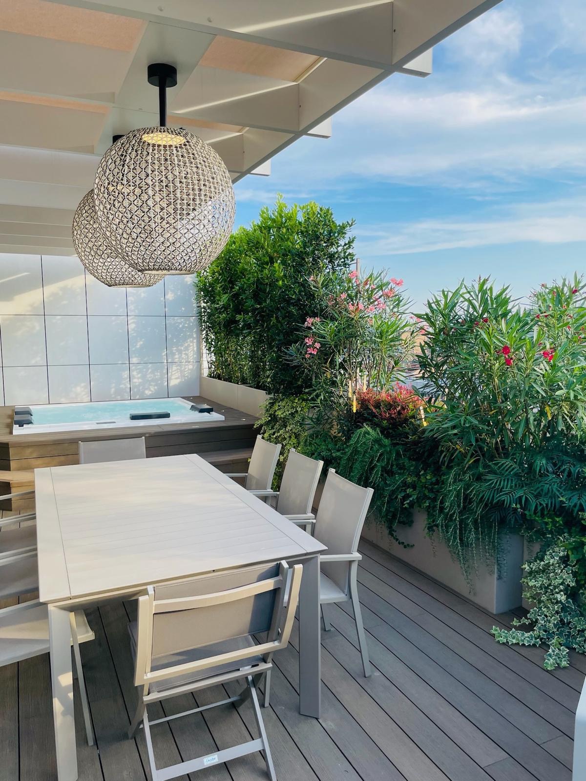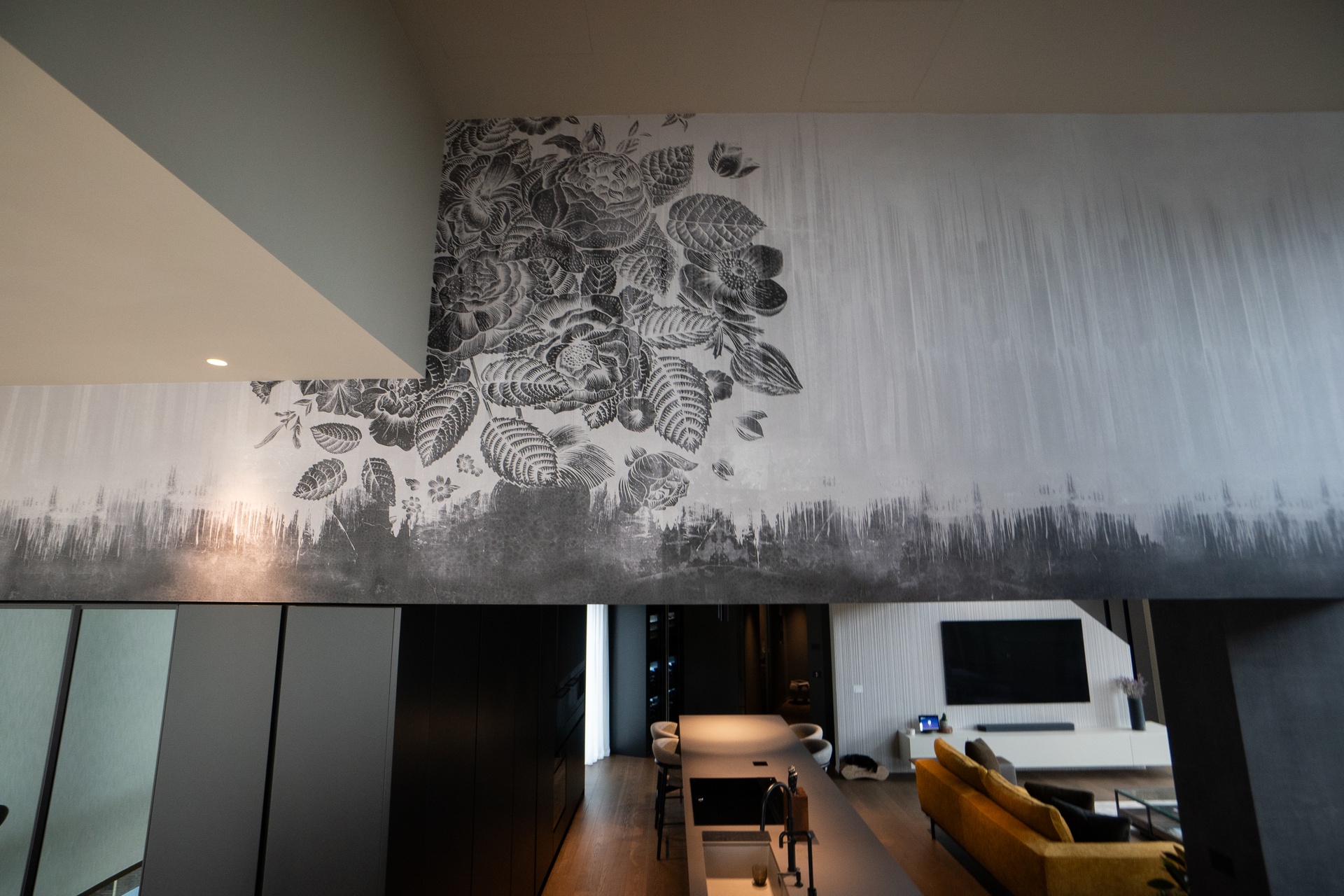 L'abitazione è composta da un primo appartamento situato al quinto piano, che comprende una zona benessere con spa, un bagno annesso e una palestra. Questa zona si collega alla zona notte, dove troviamo due camere da letto: la camera del figlio con bagno privato e cabina armadio, e una camera destinata agli ospiti, oltre a uno studio. Risalendo, si accede al sesto piano, che rappresenta l'attico. Questo spazio è costituito da un ampio open-space alto 4,80 m che include una cucina, una sala da pranzo e un accogliente salotto. Proseguendo, si accede alla zona notte, dove si trova un bagno di servizio, una lavanderia, e la camera master, anch'essa con un'altezza di 4,80 m; dotata di una cabina armadio su due piani, bagno privato e zona beauty.L'ultimo piano include un soppalco, uno spazio dedicato allo svago, con grande tavolo da bigliardo e videogiochi retrò con vista sul soggiorno; Nel soppalco troviamo anche la zona cinema e il locale hobbies, divisi dal resto della casa da una grande porta in tessuto. L'attico è avvolto da un grande terrazzo con vasca idromassaggio, zona pranzo, zona conversazione e una cucina esterna per barbeque e forno pizza.Tutto l'appartamento si declina sui colori neutri, con gioco di chiari e scuri. I clienti ci hanno permesso di spaziare molto con texture e finiture pregiate, che hanno reso il loro appartamento davvero unico.