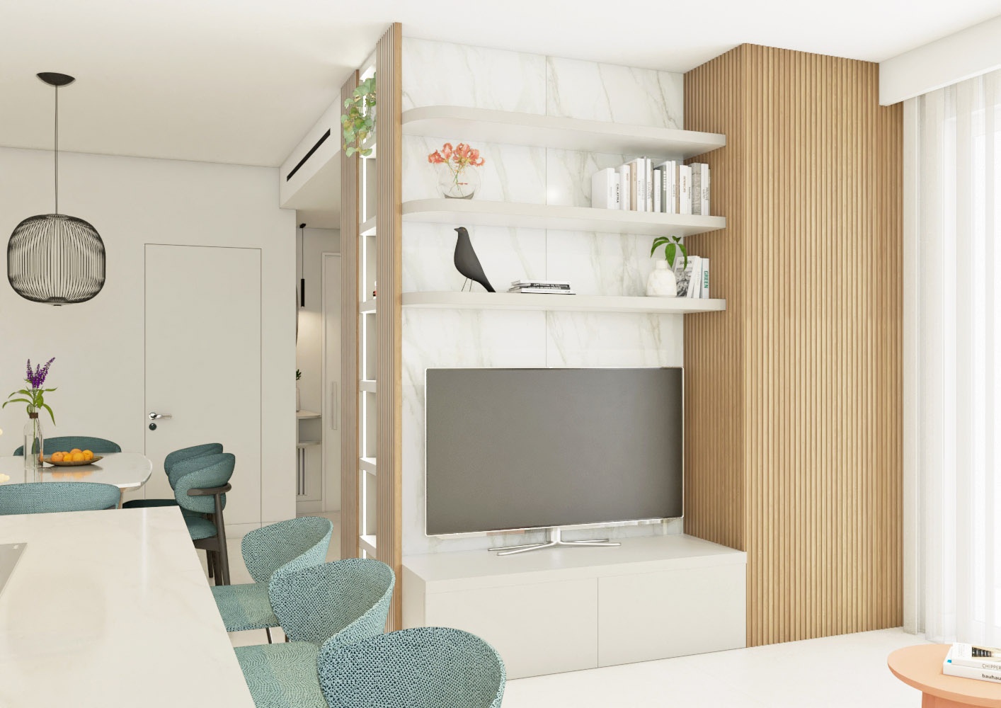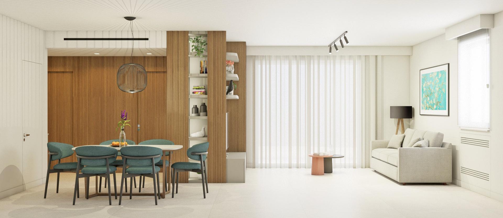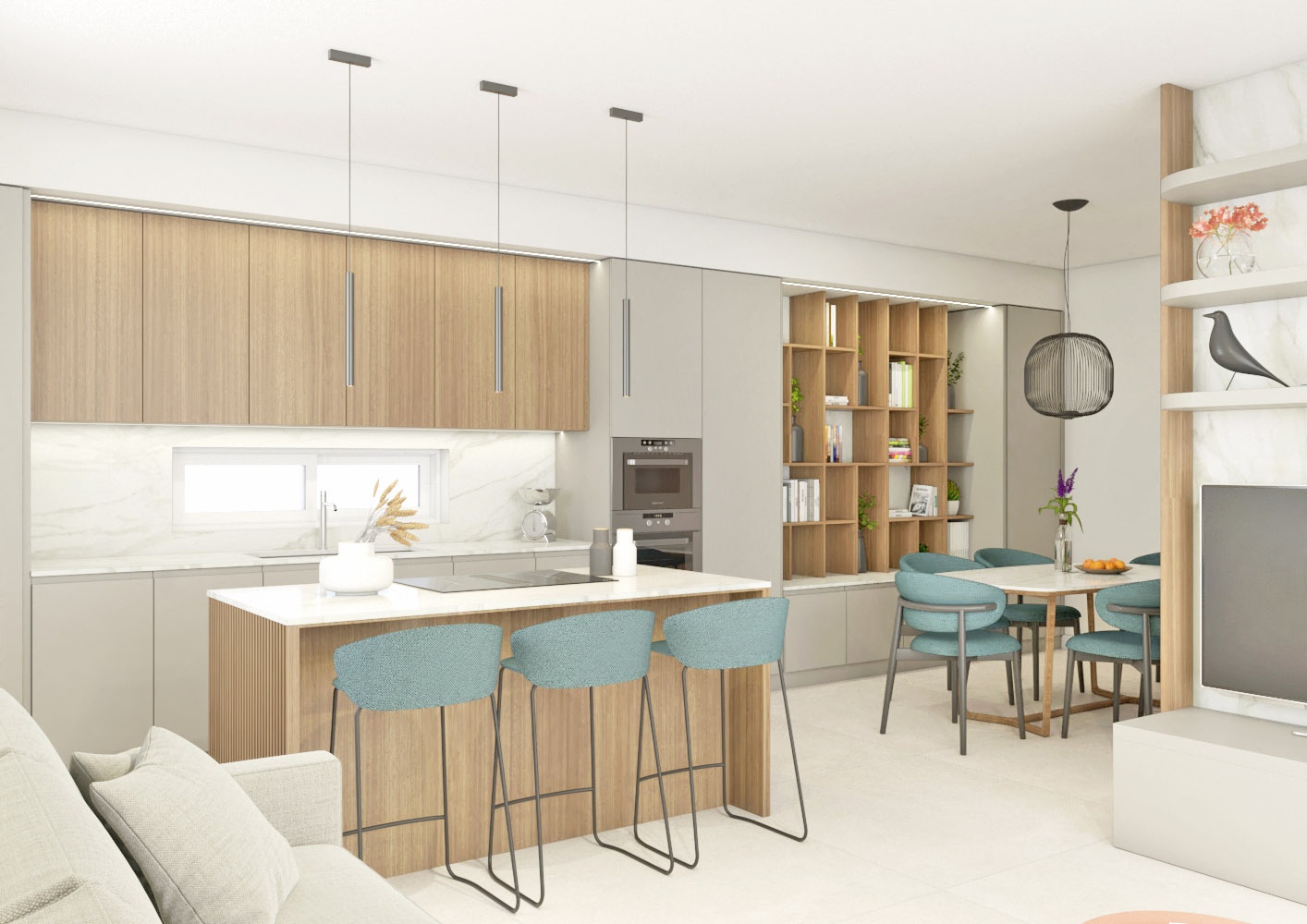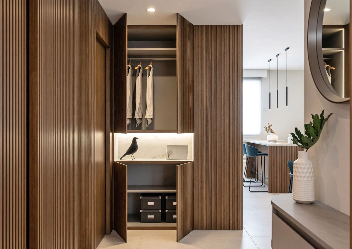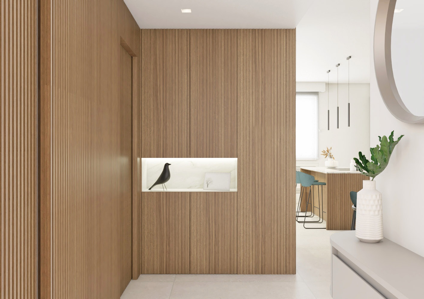 Una volta varcata la soglia di questo appartamento di circa 90 mq, ci si ritrova di fronte un armadio guardaroba caratterizzato da un effetto cannettato che nasconde un pilastro e nasconde la porta del bagno di servizio e della zona notte sulla sinistra. L' ingresso anticipa un' ampia zona giorno che comprende la zona pranzo, cucina con isola e piano snack e la zona living con un' ampia vetrata che affaccia sul terrazzo esterno. La zona notte è divisa in due parti, quella che comprende la camera matrimoniale con bagno in camera e spogliatoio e l' altra anticipata da un bagno accessibile dal disimpegno.