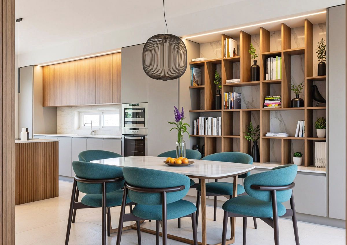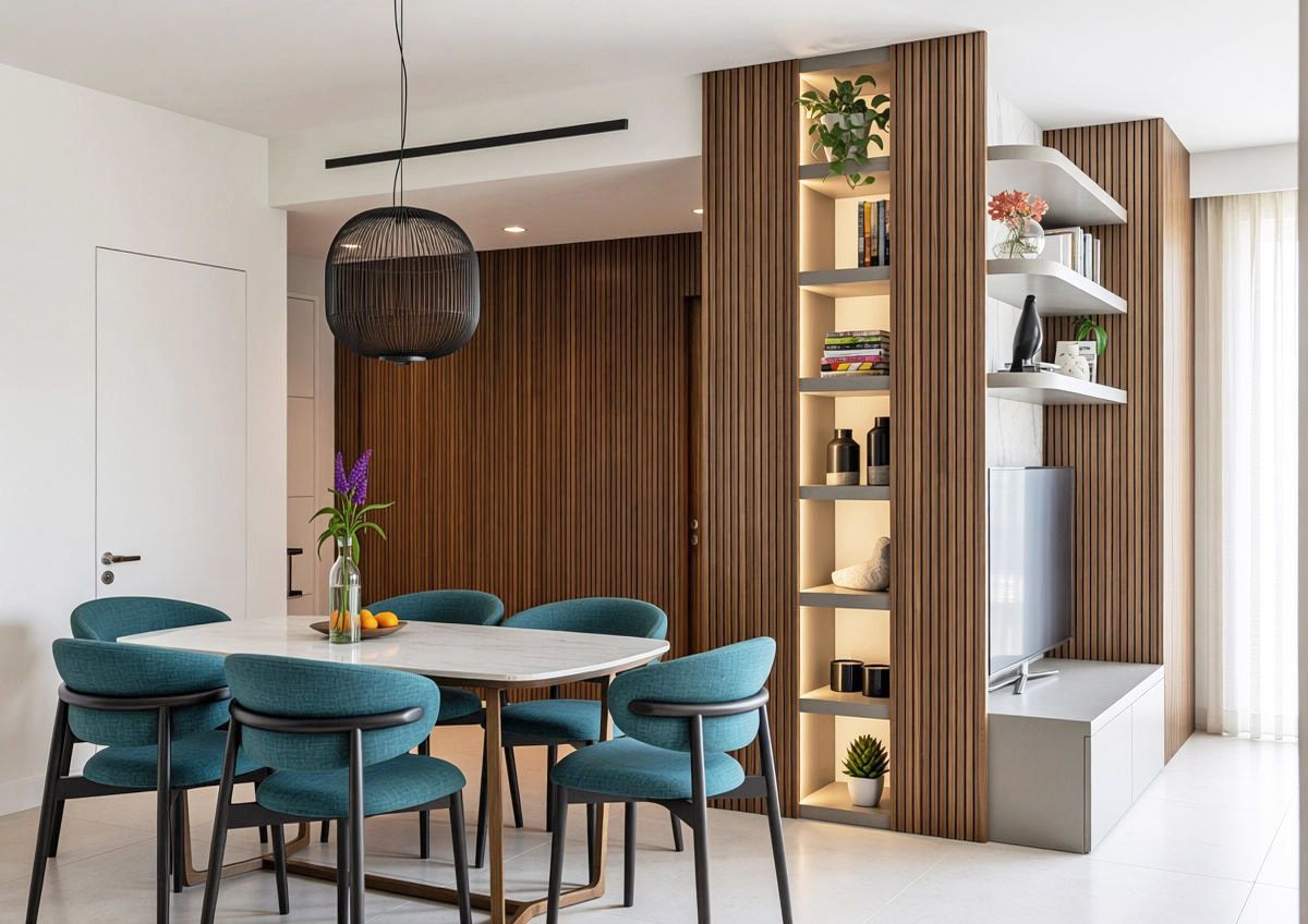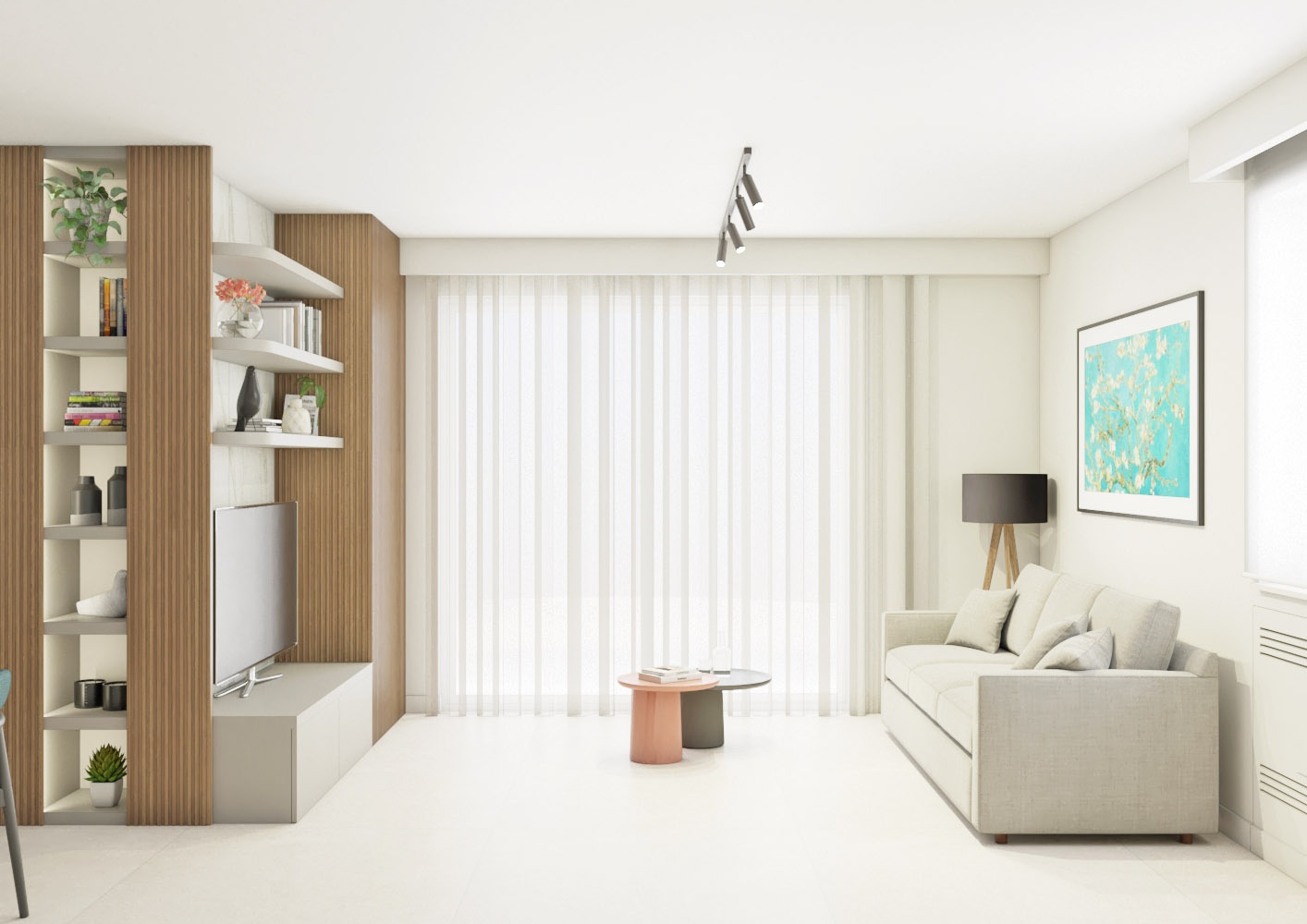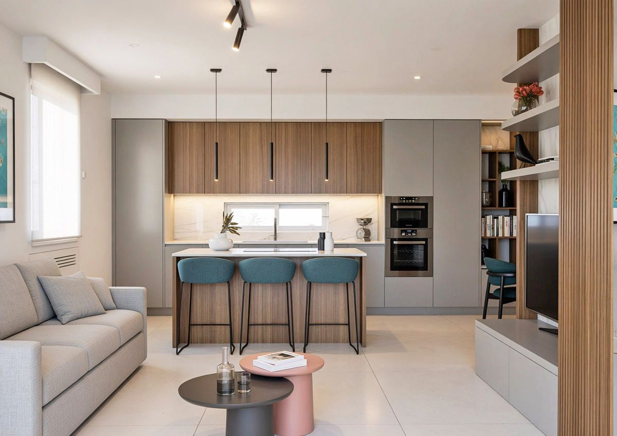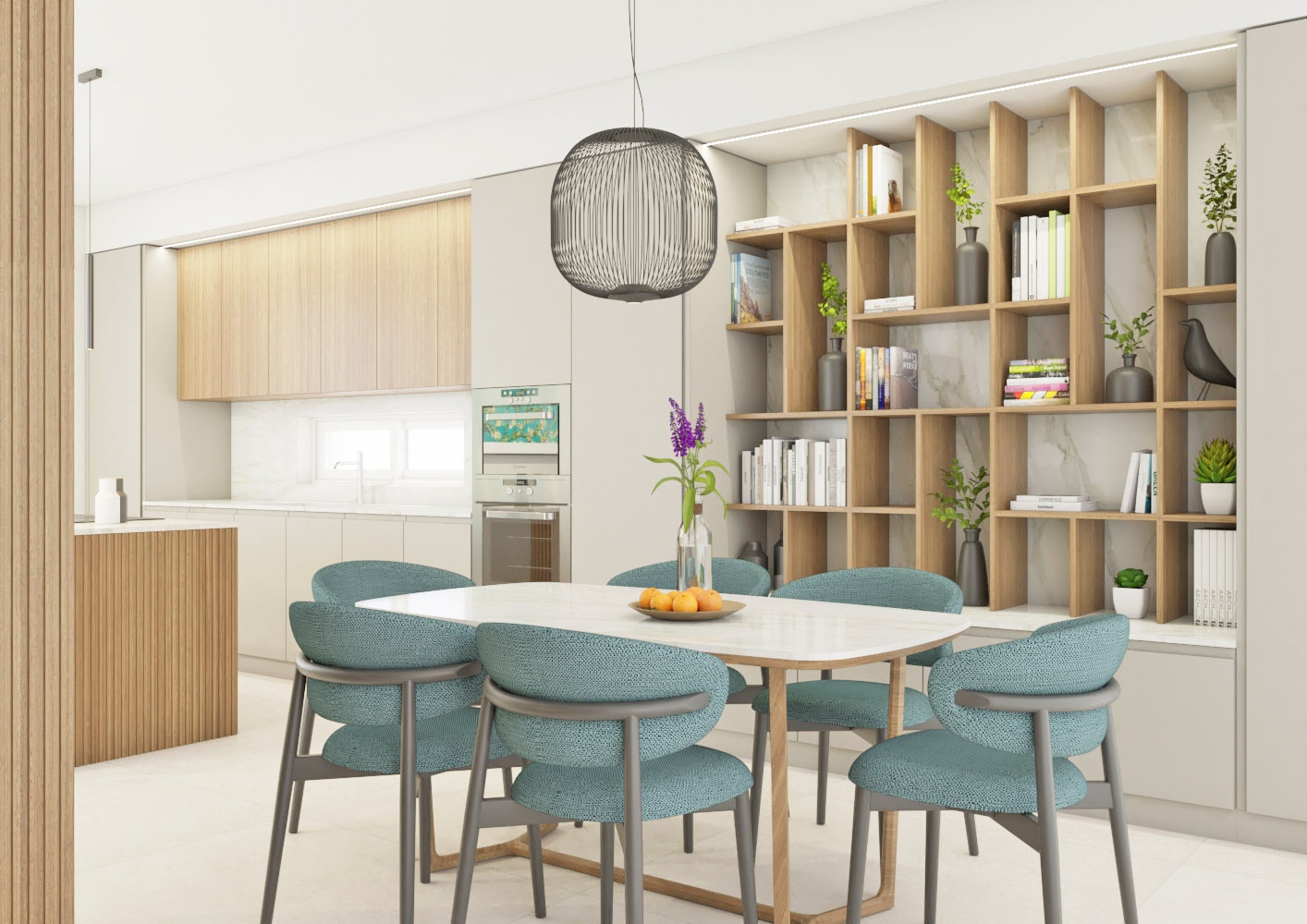 Una volta varcata la soglia di questo appartamento di circa 90 mq, ci si ritrova di fronte un armadio guardaroba caratterizzato da un effetto cannettato che nasconde un pilastro e nasconde la porta del bagno di servizio e della zona notte sulla sinistra. L' ingresso anticipa un' ampia zona giorno che comprende la zona pranzo, cucina con isola e piano snack e la zona living con un' ampia vetrata che affaccia sul terrazzo esterno. La zona notte è divisa in due parti, quella che comprende la camera matrimoniale con bagno in camera e spogliatoio e l' altra anticipata da un bagno accessibile dal disimpegno.
