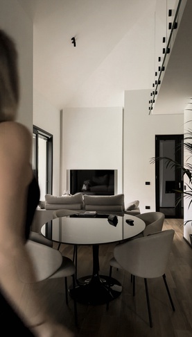 La casa dei sogni per i miei clienti: una giovane coppia che ha il desiderio di andare via da Roma e stabilirsi in una casa con giardino a Fiano Romano.L'acquisto avviene su carta e il progetto realizzato dall'impresa non li soddisfa e per questo e decidono di contattare il mio studio per farsi seguire in tutto evitando scelte sbagliate.L'immobile è ubicato all'interno di una bifamiliare in classe A in cui il fabbricato è interamente coperto da una struttura in legno lamellare a vista. La sproporzione tra le dimensioni in pianta e le altezze impongono al progetto di ristabilire un equilibrio spaziale che si ritrova per mezzo di "lame galleggianti" che hanno la funzione di ricucire l'intero progetto e di assolvere l'importante funzione di contenere al loro interno gran parte dell'illuminazione a led idonea per spazi cosi alti . La distribuzione in pianta parte da una ampia zona soggiorno in cui trova collocazione anche la penisola della cucina direttamente collegata alla zona pranzo a se stante. Dal soggiorno, per mezzo di una porta a bilico, parte un disimpegno contraddistinto da una boiserie a tutta altezza che nasconde armadi contenitori a misura. Il disimpegno distribuisce una zona notte costituita da una padronale con bagno incluso, due camere da letto singole e un bagno. La palette colori appositamente studiata e combinata nell'intero progetto trova la sua espressione in ogni elemento ed in ogni finitura in cui l'attenzione per i materiali e la loro texture ha costituito elemento di grande attenzione.