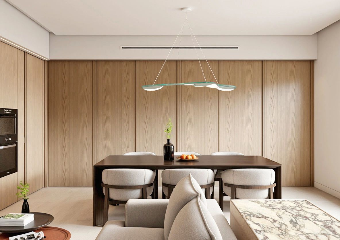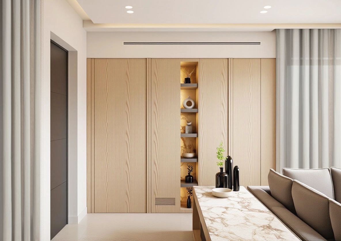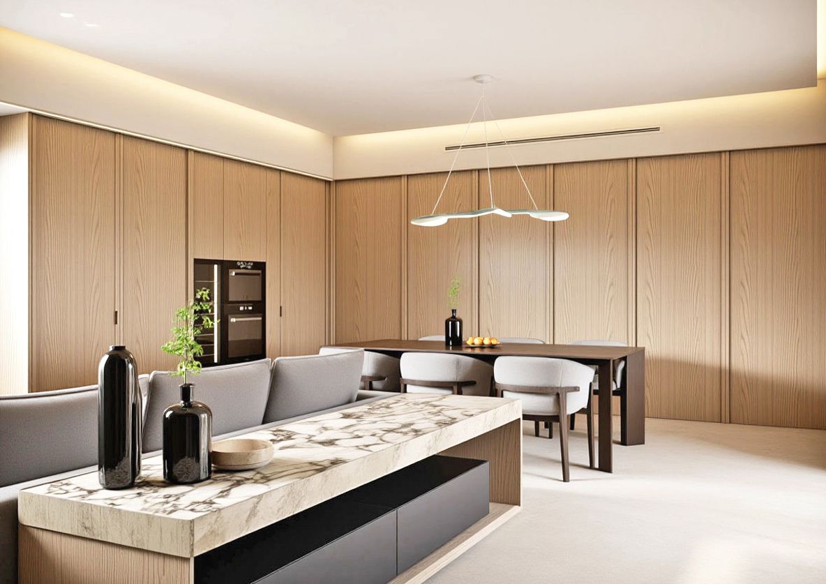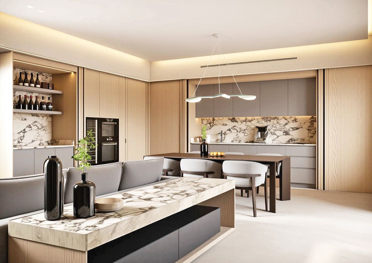 La pannellatura in legno chiaro disegna l' intera parete della cucina che fa da sfondo all' open- space. Le ante rientranti della cucina si confondonono con le porte che conducono alla zona notte e alla dispensa. Un angolo bar chiude l' angolo cucina segnando l' inizio del mobile tv con caminetto annesso. L' ingresso è completato da una cappottiera trattata allo stesso modo della cucina.