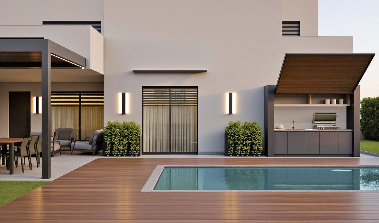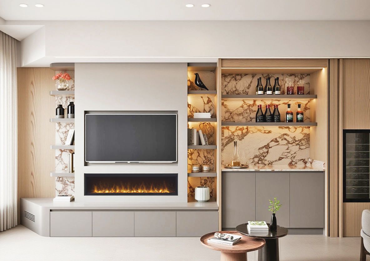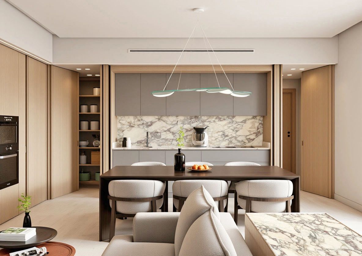 La pannellatura in legno chiaro disegna l' intera parete della cucina che fa da sfondo all' open- space. Le ante rientranti della cucina si confondonono con le porte che conducono alla zona notte e alla dispensa. Un angolo bar chiude l' angolo cucina segnando l' inizio del mobile tv con caminetto annesso. L' ingresso è completato da una cappottiera trattata allo stesso modo della cucina.