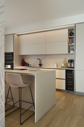 Il progetto della ristrutturazione dell’appartamento sito nel quartiere “Colli Portuensi” a Roma, ha ruotato intorno alla volontà da parte dei suoi proprietari, Beatrice e Giovanni, di ripensare lo spazio al fine di dare massima vivibilità alla cucina e dotarla di ampio spazio contenitivo. L’aspettativa dei futuri fruitori era quella di avere una cucina a penisola, idonea alle abitudini quotidiane della giovane coppia. Ovvero quella di poter vivere momenti conviviali durante la preparazione dei pasti. L’abitazione aveva nel suo stato di fatto ambienti spaziosi ma non distribuiti correttamente per soddisfare tale esigenza.Nel nuovo layout, l’ingresso è il primo ambiente della casa a subire una trasformazione, infatti una scelta cardine del progetto è ribaltare la posizione della cucina spostandola all’ingresso e sfruttando quello che era un disimpegno eccessivamente ampio.Vengono demoliti i vani di distribuzione collocati al centro della planimetria e ottimizzati, realizzando un secondo bagno ed eliminando nicchie non funzionali.All’ingresso il pensile ponte assolve il ruolo di spazio filtro accompagnando l’ingresso in casa e contribuendo ad assolvere le volontà dei proprietari di avere molto spazio contenitivo.Ridisegnare lo spazio ha comportato la possibilità di realizzare un secondo bagno, per gli ospiti e una lavanderia nascosta organizzata su ripiani.Tramite un attento studio dello stato di fatto è stato possibile individuare una seconda colonna di scarico che risultava celata dalle pareti, così da permettere la realizzazione del secondo bagno e attaccarvi l’impianto.La lavanderia è nascosta da un’anta a tutta altezza alle spalle del nuovo bagno e si colloca in modo invisibile nel soggiorno/salone. Il nuovo bagno doveva essere funzionale e al tempo stesso avere un carattere architettonico deciso, in questo caso caratterizzato dal colore.Lo spostamento della cucina ha permesso la piena valorizzazione e le giuste proporzioni della zona soggiorno salone, l’ambiente appare come un open space sviluppato secondo il lato lungo e termina nel punto focale del terrazzo. il progetto di illuminazione rafforza il gioco prospettico, il binario delle luci corre sopra la penisola della cucina, dal quale scendono luci pendenti e prosegue lungo il soffitto del salone terminando verticalmente sulla parete di fondo. Lo sguardo di chi entra in casa viene rapito dalla linea nera luminosa. L’input progettuale del bagno degli ospiti è stato il colore, rendendo lo spazio elegante e di grande impatto, grazie alla cromia blu la geometria dell’armadiatura di cartongesso realizzata sulla parete di fondo prende forza e personalità.Il progetto architettonico ha previsto anche il completo restyling del bagno esistente e della camera da letto patronale.Il progetto si è sviluppato sulle orme delle azioni quotidiane e disegna lo spazio sulle aspettative dei suoi fruitori conferendo energia e funzionalità. Il colore ha tenuto le redini di questo vortice emotivo.