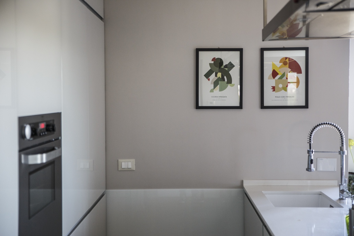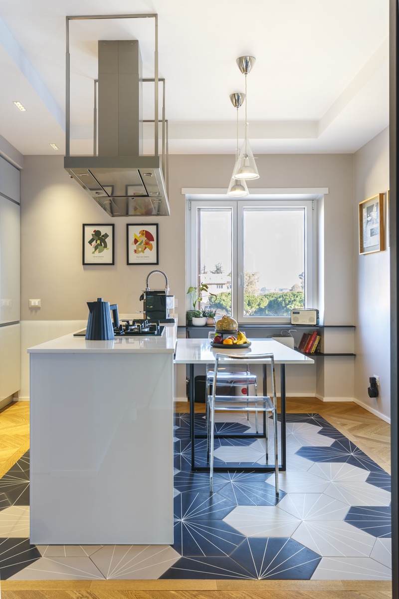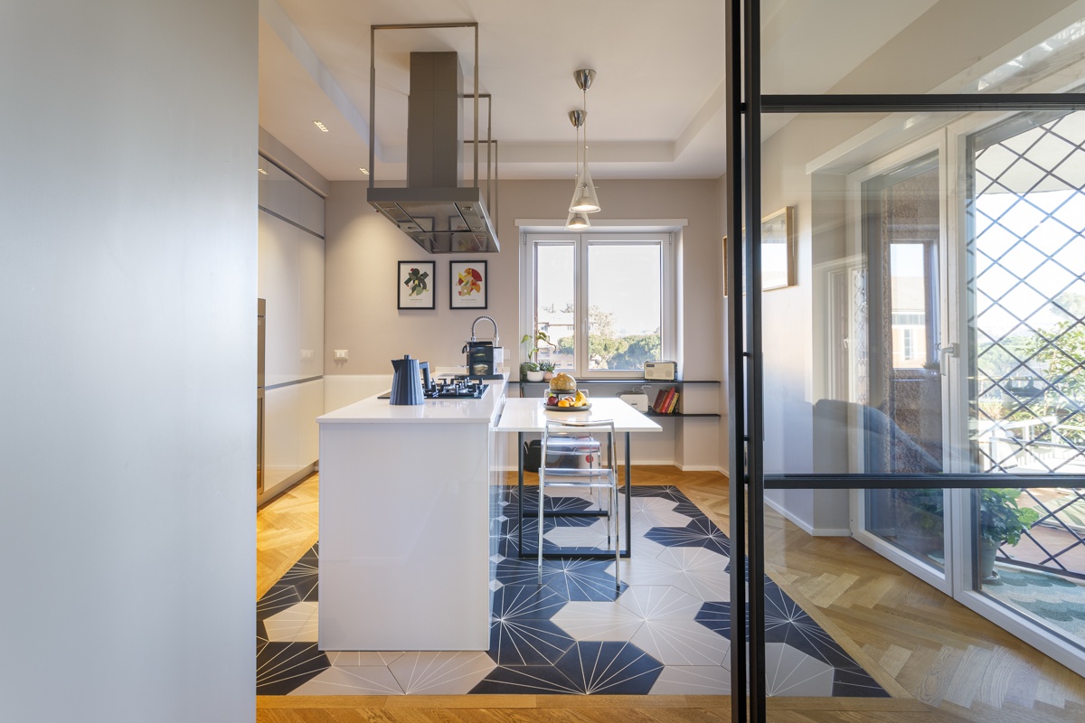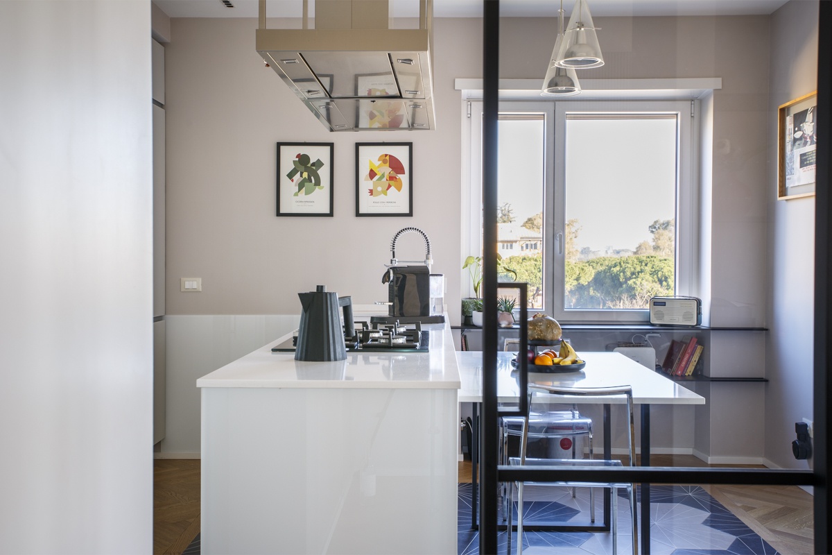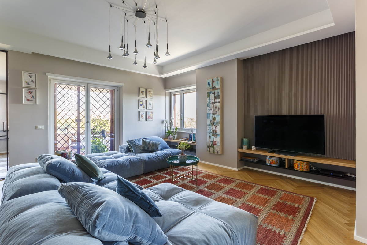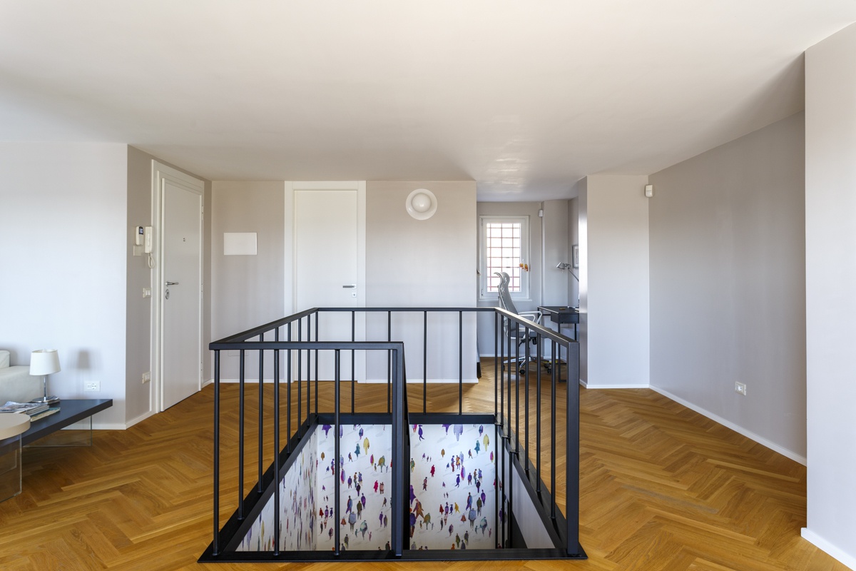 L'appartamento costituito da un attico di 160 mq e un superattico di 50 mq, è stato completamento ristrutturato, cambiandone radicalmente la distribuzione degli ambienti. Al piano principale è stato spostata la cucina, ampliando così zona living e zona pranzo. La camera padronale è una vera e propria suite con una zona dedicata agli armadi, e un bagno privato en suite. Le camere dei ragazzi hanno comodi letti e scrivanie e condividono un'ampia stanza guardaroba. Sono presenti 3 bagni, di cu uno per ospiti con carta da parati e arredo bagno di design. Al piano superiore si accede attraverso una scala in ferro nero progettata e realizzata su misura. Il piano superiore ospita un secondo soggiorno, uno studio, un quarto bagno completo di doccia e una seconda cucina a servizio dell'ampia terrazza con vista sui castelli e sul Parco dell'Appia Antica
