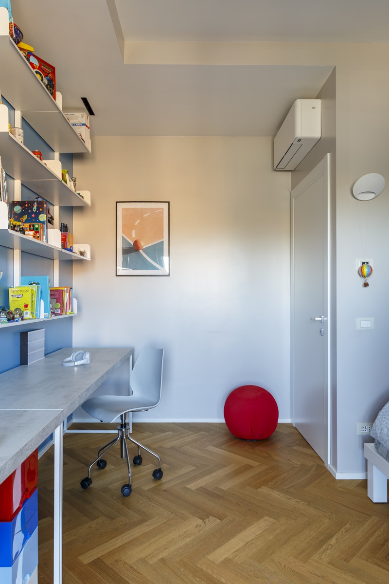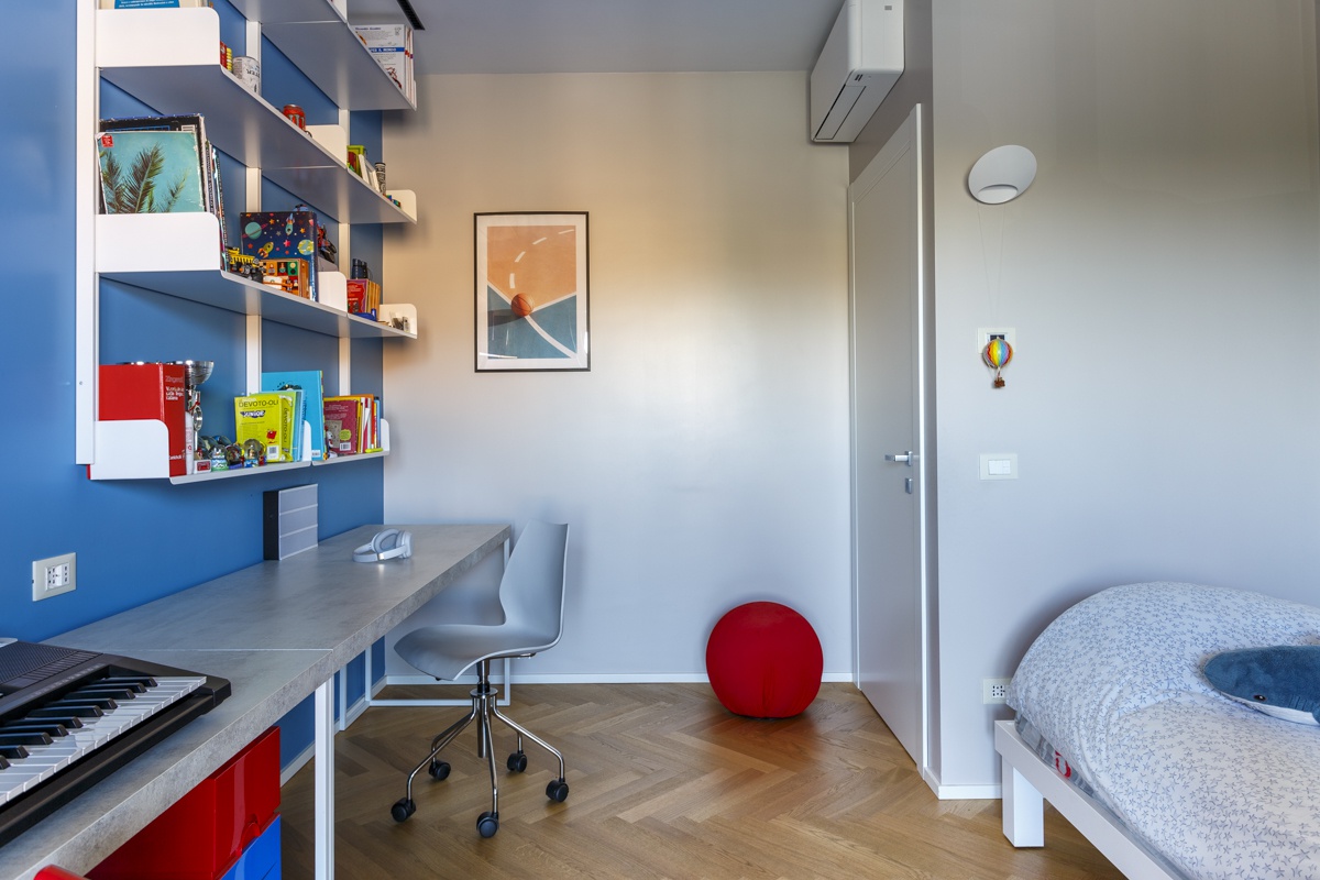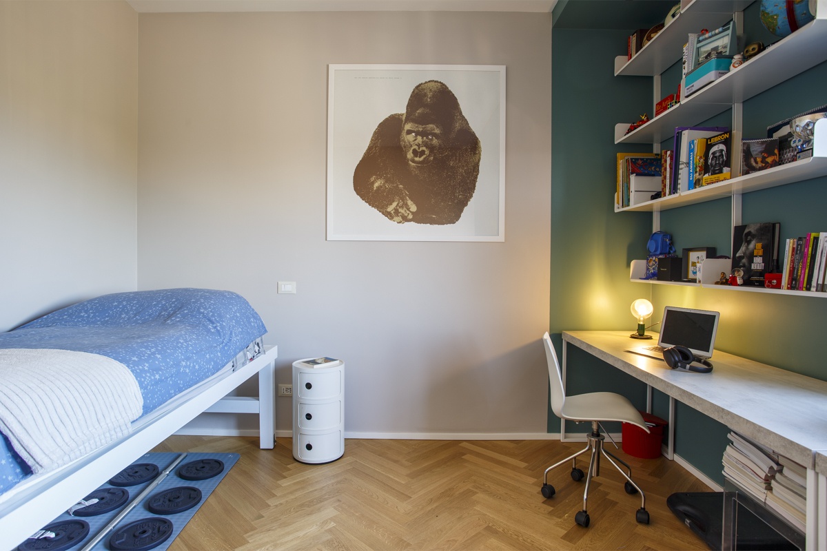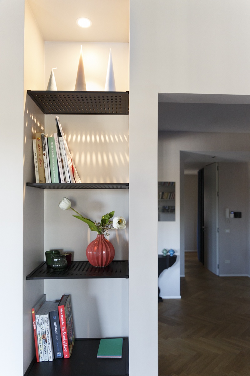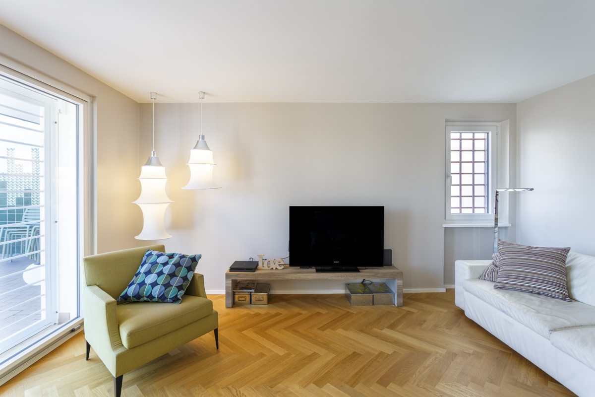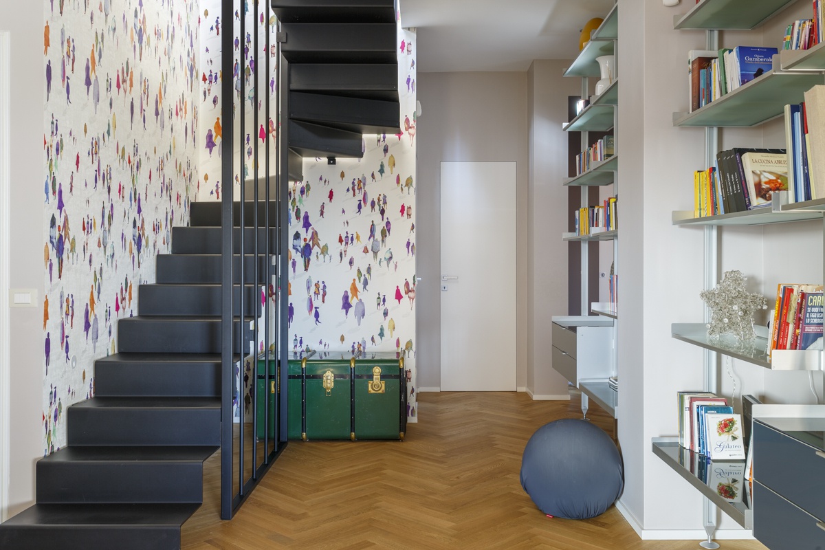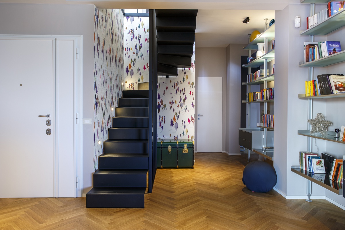 L'appartamento costituito da un attico di 160 mq e un superattico di 50 mq, è stato completamento ristrutturato, cambiandone radicalmente la distribuzione degli ambienti. Al piano principale è stato spostata la cucina, ampliando così zona living e zona pranzo. La camera padronale è una vera e propria suite con una zona dedicata agli armadi, e un bagno privato en suite. Le camere dei ragazzi hanno comodi letti e scrivanie e condividono un'ampia stanza guardaroba. Sono presenti 3 bagni, di cu uno per ospiti con carta da parati e arredo bagno di design. Al piano superiore si accede attraverso una scala in ferro nero progettata e realizzata su misura. Il piano superiore ospita un secondo soggiorno, uno studio, un quarto bagno completo di doccia e una seconda cucina a servizio dell'ampia terrazza con vista sui castelli e sul Parco dell'Appia Antica