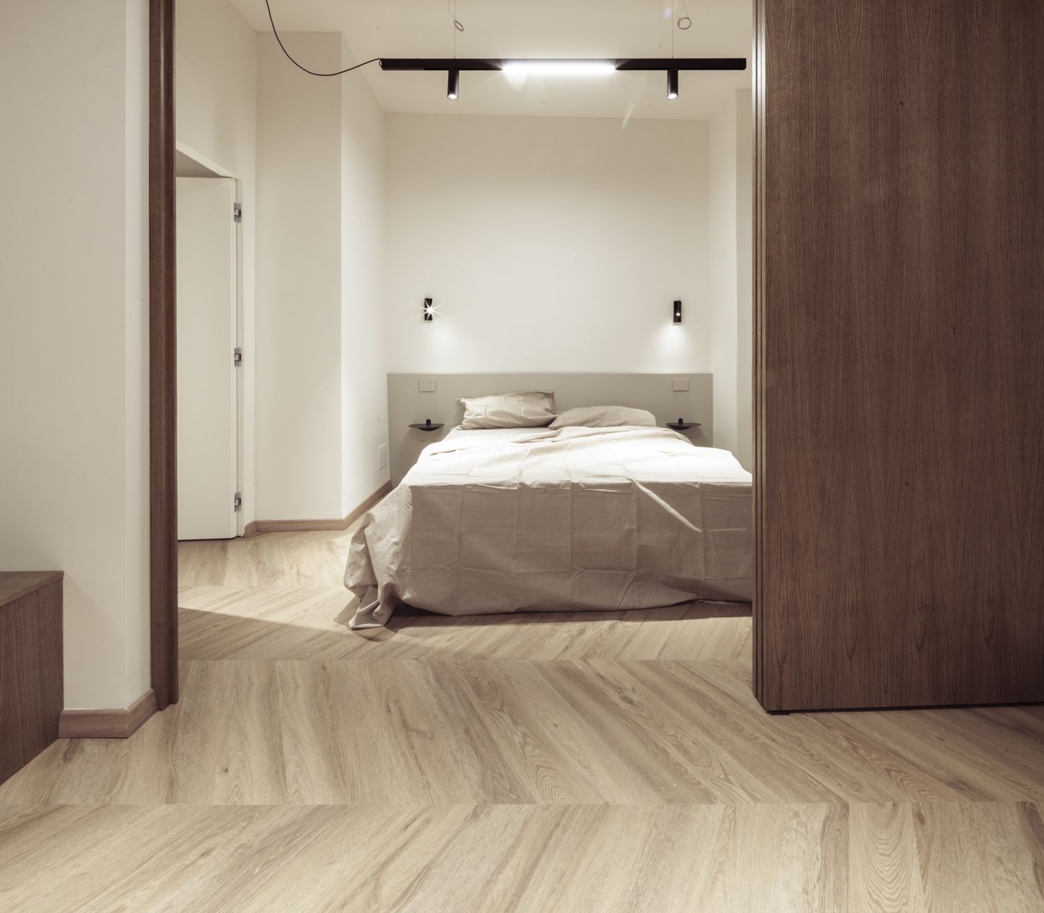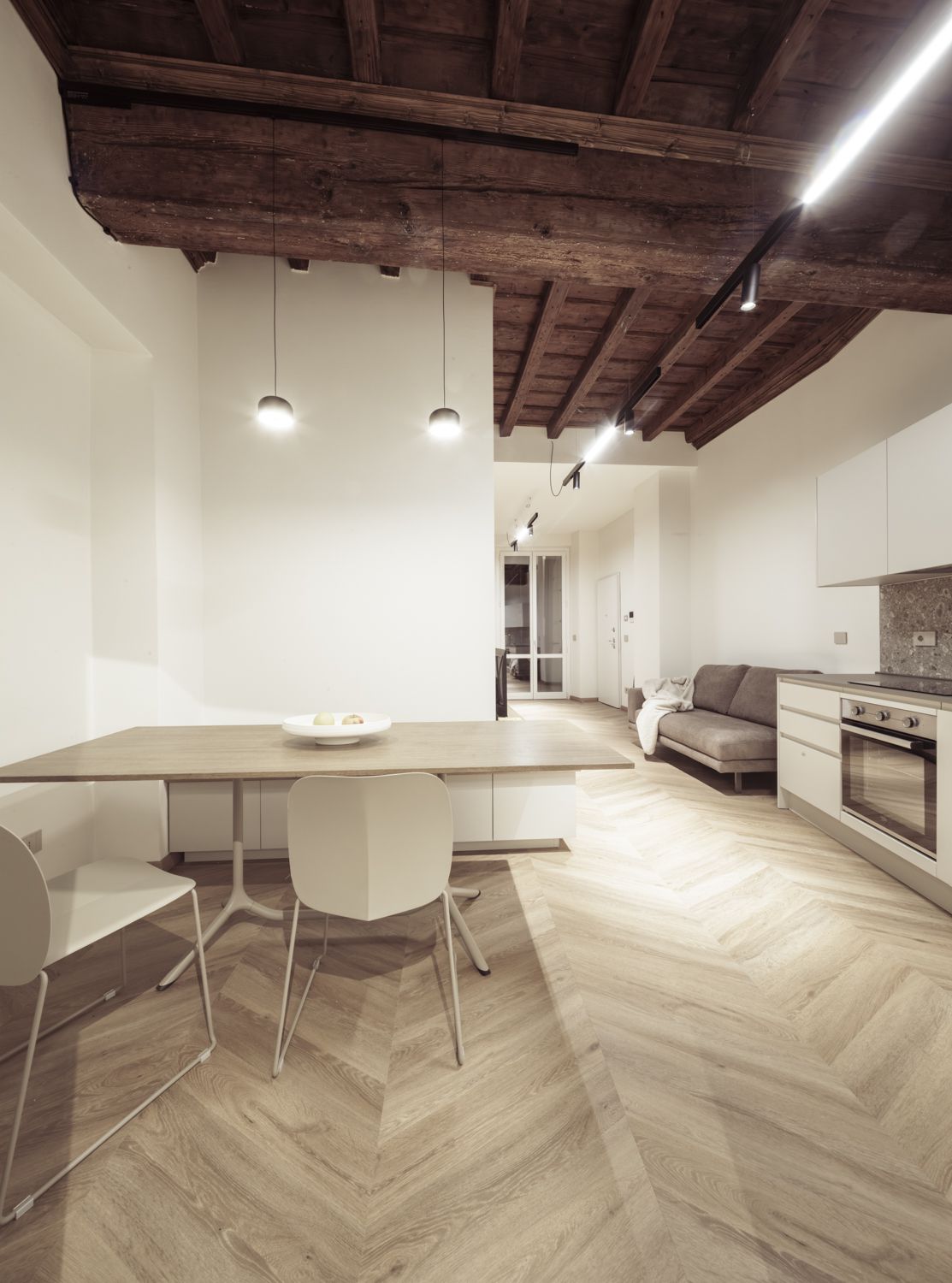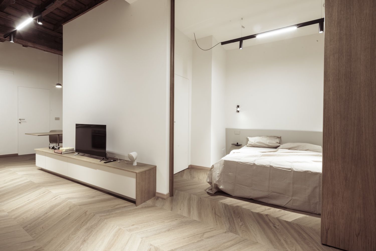 Un rifugio silenzioso. Uno spazio funzionale affacciato sulla quiete del cortile interno. La riqualificazione di due piani di un edificio storico nel centro pedonale del centro storico di Cuneo nasce dalla volontà di superare la frammentazione dei volumi originali. L'intervento ha riguardato un intero piano e si è esteso specularmente al piano superiore, dove sono stati realizzati due ulteriori appartamenti che ricalcano la stessa organizzazione degli spazi e la medesima filosofia progettuale. L’appartamento Casa Corte, affacciato sul cortile interno, è caratterizzato da un’atmosfera raccolta e silenziosa, che dialoga con la dimensione più privata dell’edificio. La distribuzione degli spazi è stata pensata per garantire continuità e flessibilità anche all’interno di superfici contenute, con soluzioni capaci di accompagnare i percorsi e amplificare la percezione dello spazio.Elemento centrale del progetto è una porta scorrevole in legno a tutta altezza, suddivisa in tre parti, che consente di separare o mettere in relazione la zona giorno e la zona notte, modulando luce, privacy e percezione spaziale in base alle diverse esigenze dell’abitare quotidiano.Un mobile su misura avvolge la cabina armadio come un elemento continuo, trasformandosi lungo il suo sviluppo e assumendo funzioni diverse: sul lato cucina diventa panchina per il tavolo, contribuendo a ottimizzare le superfici e rafforzando l’idea di un arredo integrato, concepito come parte integrante dell’architettura.Il risultato è un’abitazione compatta ma accuratamente progettata, in cui ogni scelta nasce dal confronto tra funzionalità, uso quotidiano e qualità dello spazio, restituendo un ambiente intimo e coerente con il contesto storico in cui si inserisce.