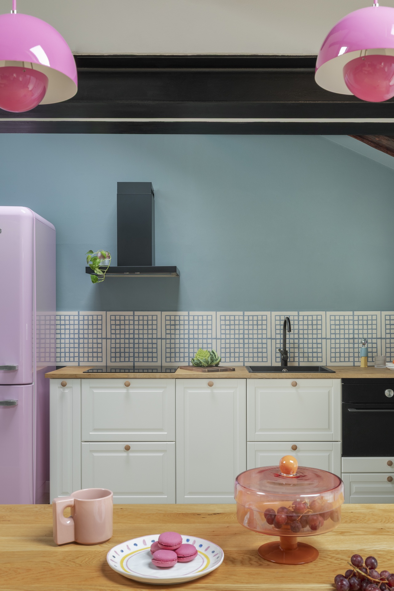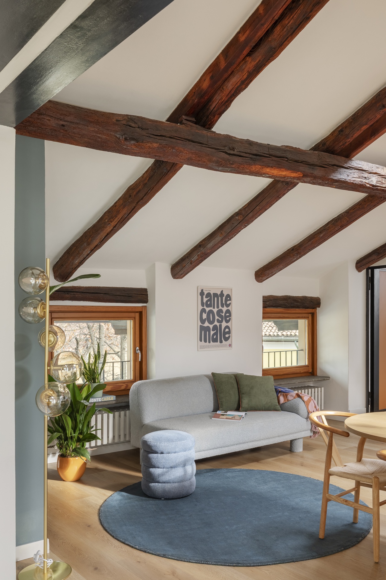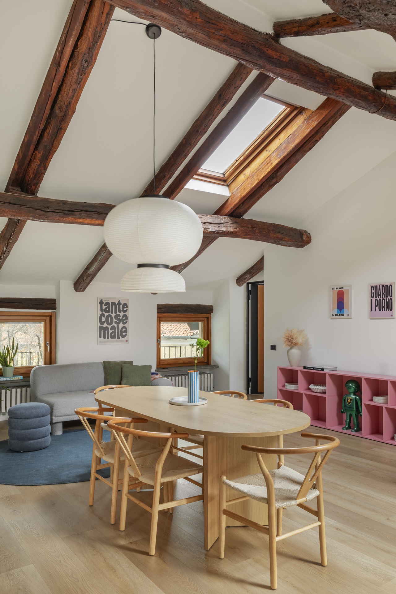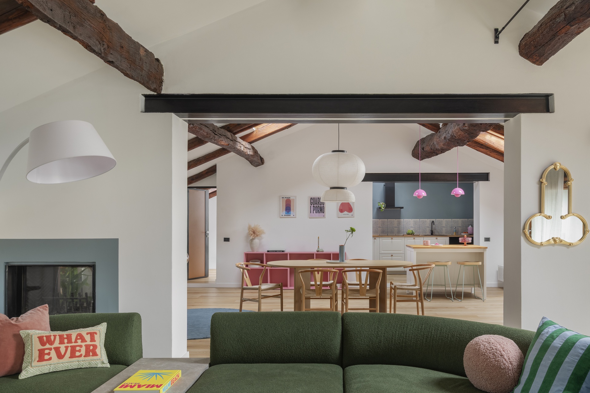 Un’architettura familiare, tradizionale e suggestiva.Le travi a vista scandiscono lo spazio e raccontano una casa che aveva già una propria anima, forte e riconoscibile.Il progetto nasce proprio da qui: dall’ascolto dell’esistente e dal desiderio di metterlo in dialogo con chi la abita.All’interno di questa struttura abbiamo inserito la personalità di Francesca Biella, interpretandola nel suo contesto più autentico: la famiglia.Uno spazio che riflette il suo carattere fresco e contemporaneo, con una vena giocosa e provocatoria, mai eccessiva.I cani diventano parte attiva della casa, presenze quotidiane che influenzano scelte e funzioni.Colori pop e frizzanti, linee morbide e soluzioni progettuali pensate per rendere ogni angolo vissuto e funzionale.La casa è stata progettata non solo come luogo da abitare, ma anche come spazio di lavoro.Essendo Francesca un’influencer, ogni ambiente è stato pensato anche come possibile set: sfondi riconoscibili, angoli narrativi, palette cromatiche capaci di dialogare con la luce e con l’obiettivo.Una casa che si vive quotidianamente, ma che allo stesso tempo si presta a essere raccontata, fotografata, condivisa, senza perdere autenticità.La convivialità resta uno dei temi centrali del progetto: il grande divano, il tavolo, gli spazi pensati per accogliere.Accanto a questa dimensione più aperta, emergono però anche momenti di intimità: il camino, gli angoli più raccolti, le zone dedicate alla parte più personale e privata.Un equilibrio costante tra comfort ed espressione, tra vita privata e lavoro.I dettagli diventano racconto.Le piastrelle della cucina si trasformano in un vero e proprio diario, richiamando l’idea delle pagine di un quaderno.Le lampade iconiche accompagnano gli spazi come segni riconoscibili, chiudendo il progetto con accenti decisi e consapevoli.Una casa da abitare, lavorare e raccontare.Un progetto che parla di identità, prima ancora che di stile.