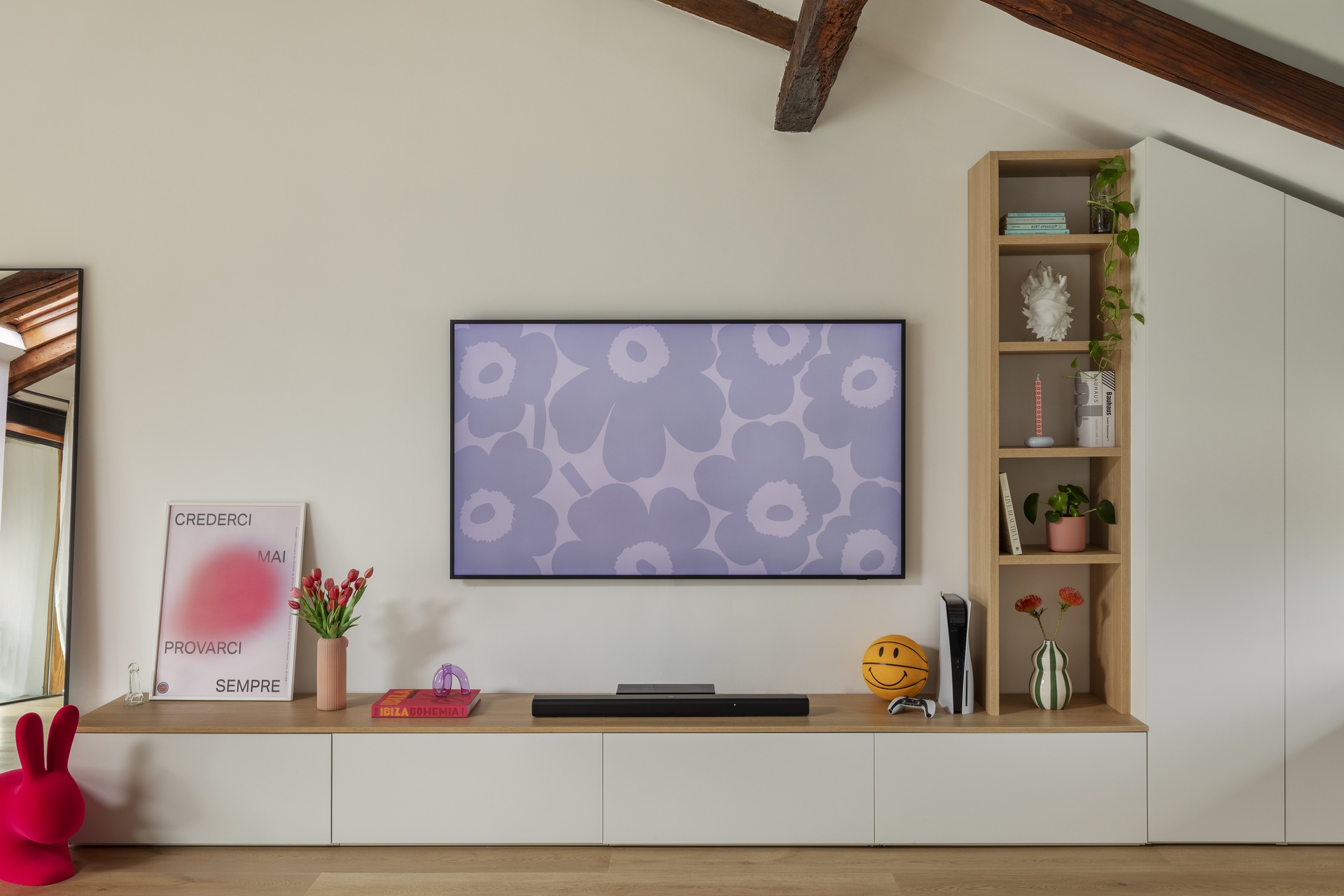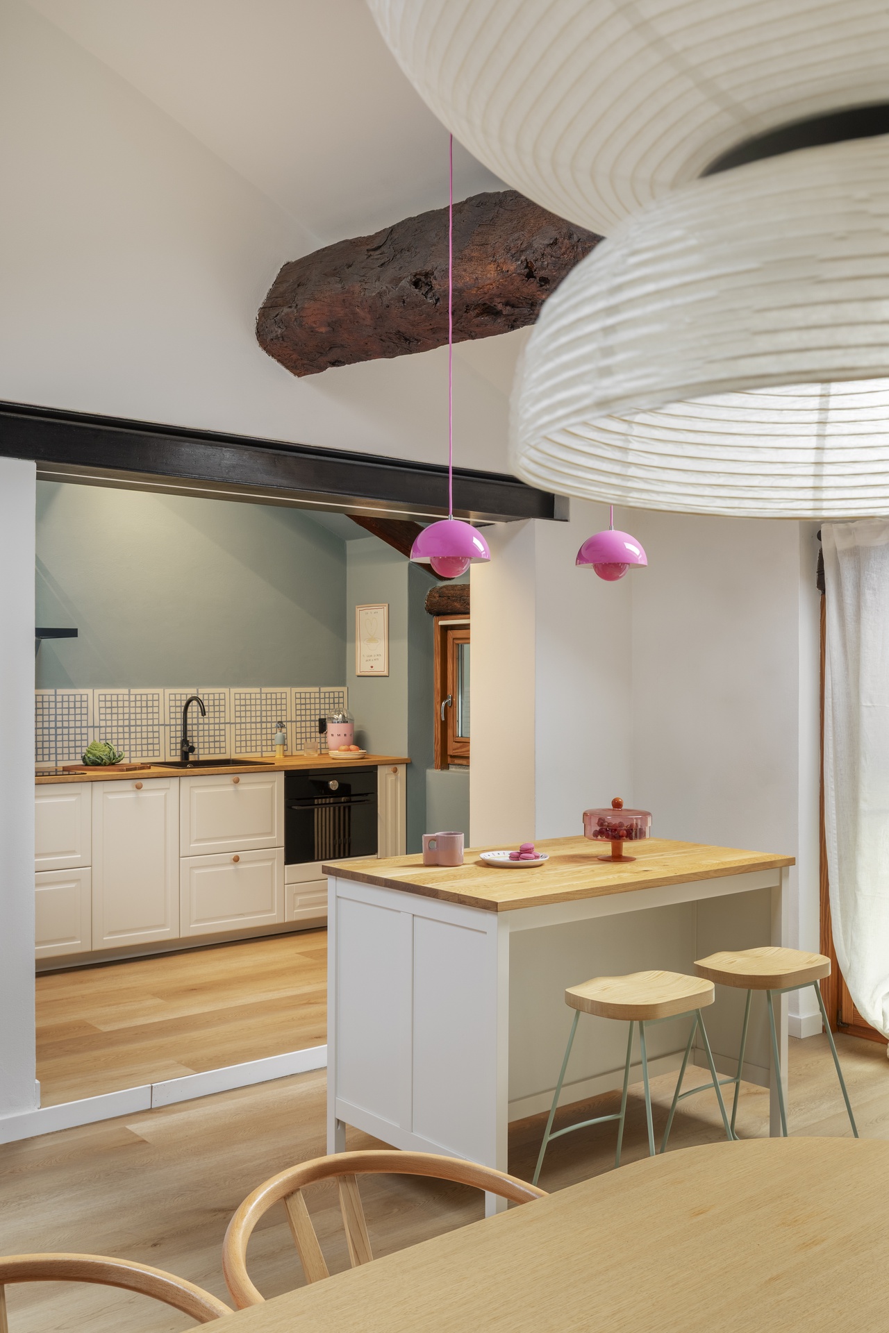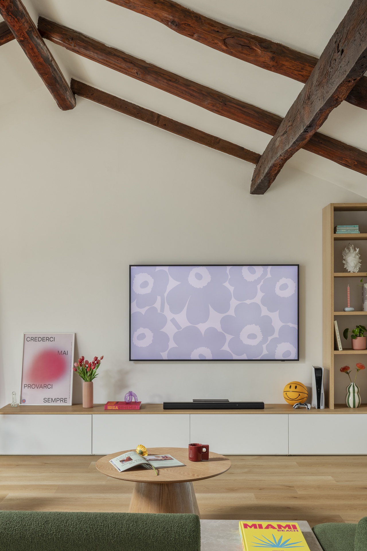 Un’architettura familiare, tradizionale e suggestiva.Le travi a vista scandiscono lo spazio e raccontano una casa che aveva già una propria anima, forte e riconoscibile.Il progetto nasce proprio da qui: dall’ascolto dell’esistente e dal desiderio di metterlo in dialogo con chi la abita.All’interno di questa struttura abbiamo inserito la personalità di Francesca Biella, interpretandola nel suo contesto più autentico: la famiglia.Uno spazio che riflette il suo carattere fresco e contemporaneo, con una vena giocosa e provocatoria, mai eccessiva.I cani diventano parte attiva della casa, presenze quotidiane che influenzano scelte e funzioni.Colori pop e frizzanti, linee morbide e soluzioni progettuali pensate per rendere ogni angolo vissuto e funzionale.La casa è stata progettata non solo come luogo da abitare, ma anche come spazio di lavoro.Essendo Francesca un’influencer, ogni ambiente è stato pensato anche come possibile set: sfondi riconoscibili, angoli narrativi, palette cromatiche capaci di dialogare con la luce e con l’obiettivo.Una casa che si vive quotidianamente, ma che allo stesso tempo si presta a essere raccontata, fotografata, condivisa, senza perdere autenticità.La convivialità resta uno dei temi centrali del progetto: il grande divano, il tavolo, gli spazi pensati per accogliere.Accanto a questa dimensione più aperta, emergono però anche momenti di intimità: il camino, gli angoli più raccolti, le zone dedicate alla parte più personale e privata.Un equilibrio costante tra comfort ed espressione, tra vita privata e lavoro.I dettagli diventano racconto.Le piastrelle della cucina si trasformano in un vero e proprio diario, richiamando l’idea delle pagine di un quaderno.Le lampade iconiche accompagnano gli spazi come segni riconoscibili, chiudendo il progetto con accenti decisi e consapevoli.Una casa da abitare, lavorare e raccontare.Un progetto che parla di identità, prima ancora che di stile.