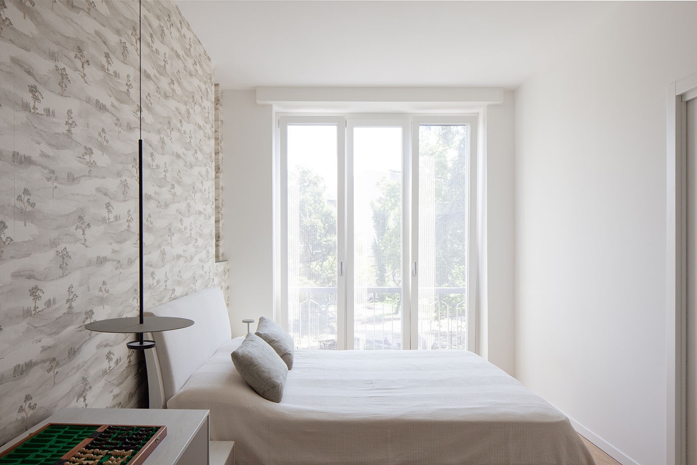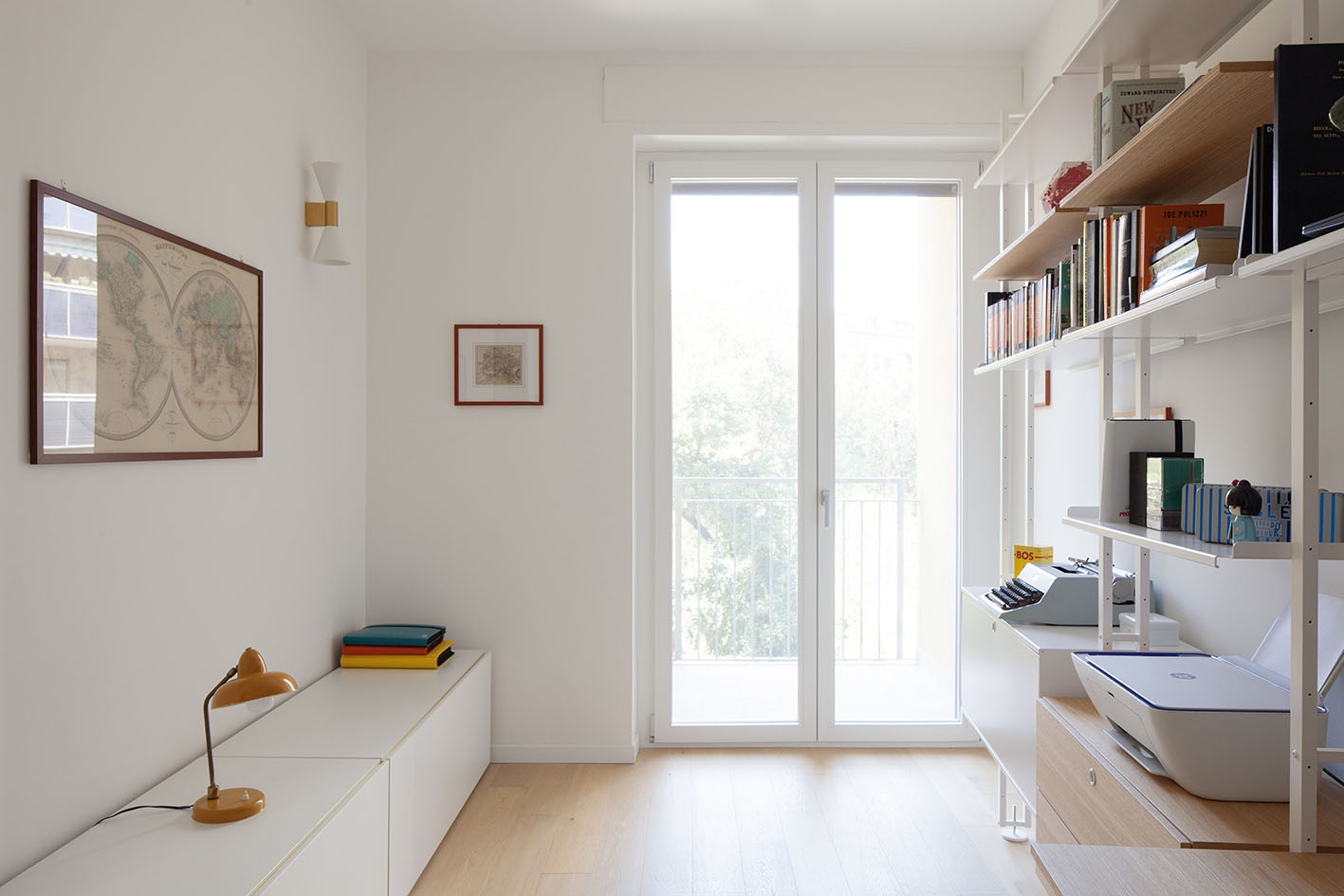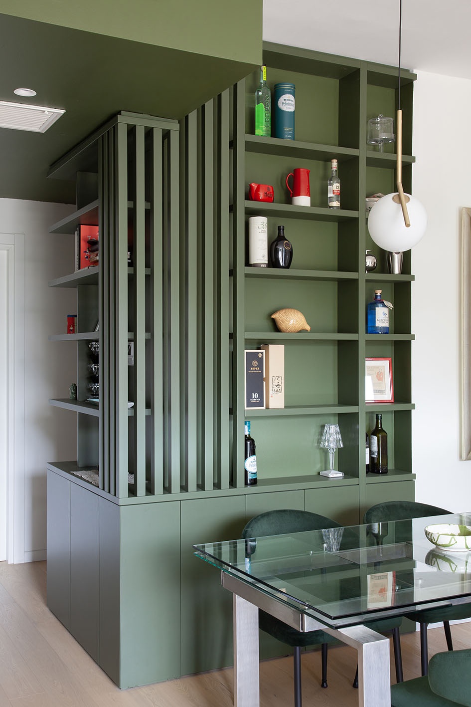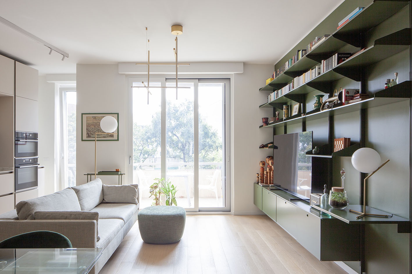 Una giovane coppia mi ha affidato un compito speciale: dare forma alla loro prima casa di famiglia. L’appartamento di 100 mq. situato in un palazzo degli anni ’70 dall’architettura razionalista, è stato recentemente oggetto di una profonda ristrutturazione. Ci troviamo in una zona centrale ma tranquilla, a pochi passi da Porta Venezia e dallo storico Bar Basso.Il progetto ruota intorno a un’ampia zona giorno con cucina a vista. Il muro che separa il soggiorno dalla camera da letto è stato dipinto di verde, una tonalità che prosegue lungo il corridoio e sul controsoffitto, creando un raffinato effetto color block. Lo stesso verde caratterizza anche la libreria Kriptonite montata sulla parete del soggiorno, dando continuità visiva agli ambienti.Dietro il tavolo da pranzo abbiamo progettato una libreria su misura, nata dall’esigenza di nascondere le botole d’ispezione collocate di fronte all’ingresso e sul lato soggiorno. Il mobile, realizzato su disegno e curato nei minimi dettagli, si sviluppa su tre lati: una libreria angolare con ante nella parte inferiore sul lato soggiorno e corridoio, e un vano dedicato ad asciugatrice e lavatrice.La cucina e il divano si distinguono per le tonalità chiare, in contrasto con il verde intenso della parete opposta. La cucina, funzionale e ben organizzata, si estende per oltre cinque metri lineari, sfruttando anche lo spazio accanto alla finestra per ottimizzare ogni centimetro disponibile. Un armadio con ante in vetro funge da vetrina per una preziosa collezione di piatti di famiglia dal forte valore affettivo: di sera, grazie all’illuminazione integrata, crea un’atmosfera calda e suggestiva accanto al tavolo dove si riuniscono amici e parenti.La camera da letto, accessibile tramite una porta filo muro rivestita con carta da parati raffigurante alberi di bonsai, è impreziosita dalle lampade Vibia che donano all’ambiente un’eleganza sobria e accogliente. Nell’ufficio trova posto un’altra libreria Kriptonite, questa volta bianca, che dialoga armoniosamente con il resto della casa. I proprietari, grandi viaggiatori e amanti del Giappone, hanno arricchito gli spazi con oggetti curiosi e una collezione di bambole Kokeshi, esposta su una mensola del soggiorno.Nei bagni abbiamo scelto un delicato pattern floreale per le pareti delle docce, lasciando le altre superfici bianche per creare un equilibrio luminoso e delicato.L’appartamento gode di una splendida vista sul parco che, grazie alle ampie finestre, diventa parte integrante degli interni, regalando ulteriori sfumature di verde e un piacevole senso di continuità con l’esterno.