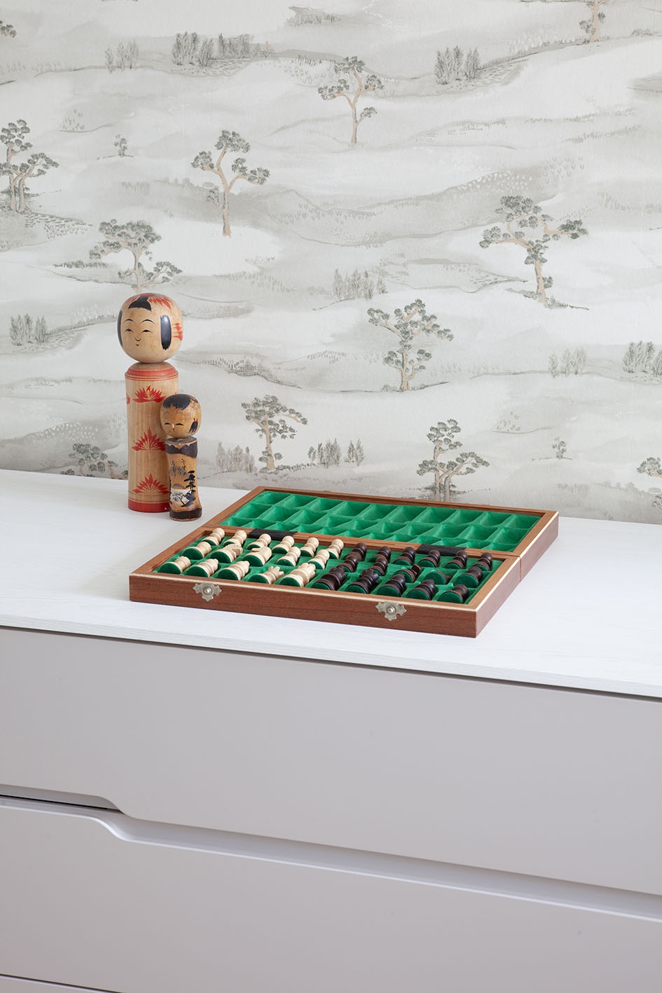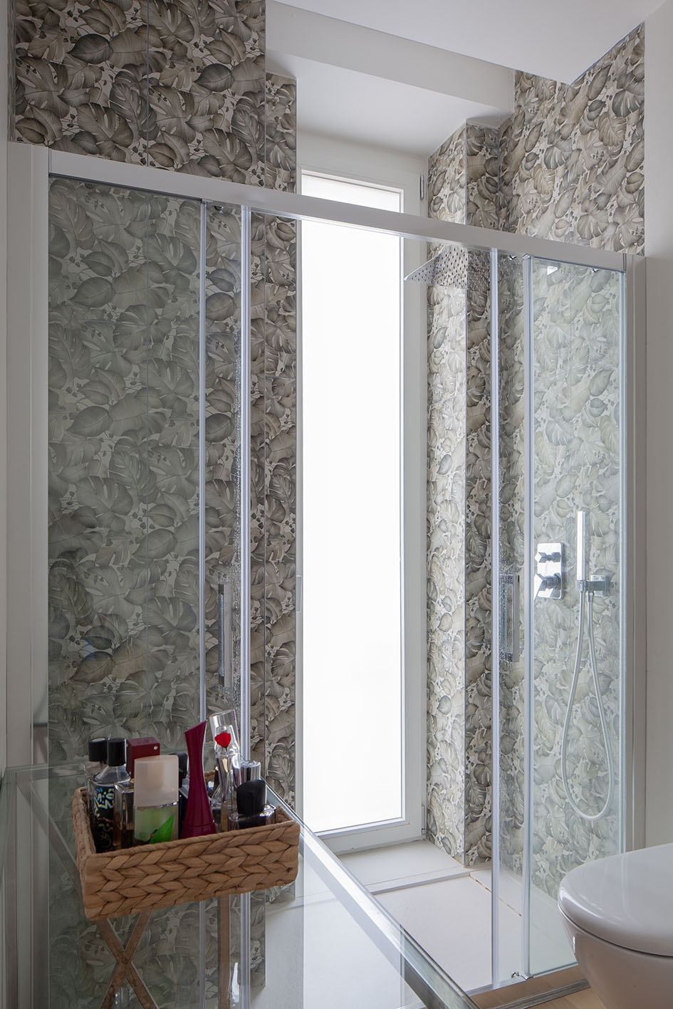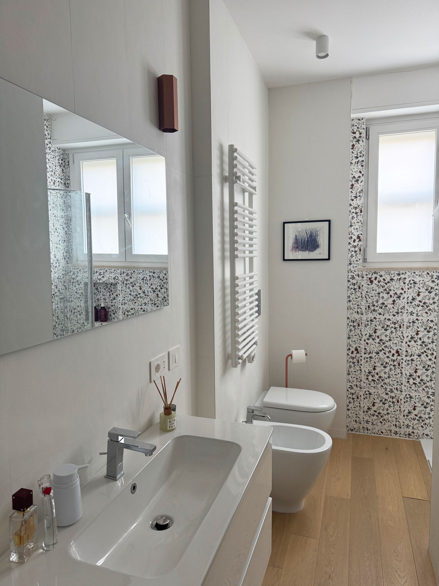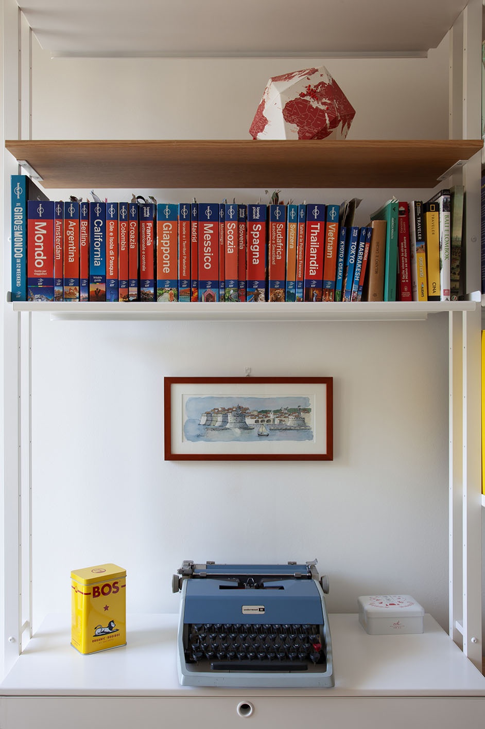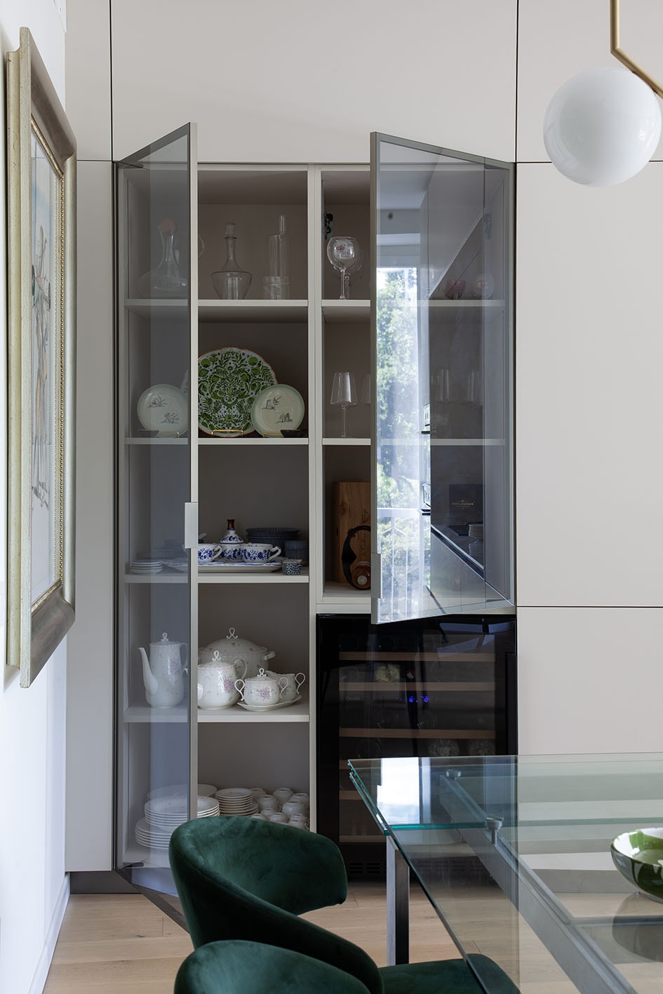 Una giovane coppia mi ha affidato un compito speciale: dare forma alla loro prima casa di famiglia. L’appartamento di 100 mq. situato in un palazzo degli anni ’70 dall’architettura razionalista, è stato recentemente oggetto di una profonda ristrutturazione. Ci troviamo in una zona centrale ma tranquilla, a pochi passi da Porta Venezia e dallo storico Bar Basso.Il progetto ruota intorno a un’ampia zona giorno con cucina a vista. Il muro che separa il soggiorno dalla camera da letto è stato dipinto di verde, una tonalità che prosegue lungo il corridoio e sul controsoffitto, creando un raffinato effetto color block. Lo stesso verde caratterizza anche la libreria Kriptonite montata sulla parete del soggiorno, dando continuità visiva agli ambienti.Dietro il tavolo da pranzo abbiamo progettato una libreria su misura, nata dall’esigenza di nascondere le botole d’ispezione collocate di fronte all’ingresso e sul lato soggiorno. Il mobile, realizzato su disegno e curato nei minimi dettagli, si sviluppa su tre lati: una libreria angolare con ante nella parte inferiore sul lato soggiorno e corridoio, e un vano dedicato ad asciugatrice e lavatrice.La cucina e il divano si distinguono per le tonalità chiare, in contrasto con il verde intenso della parete opposta. La cucina, funzionale e ben organizzata, si estende per oltre cinque metri lineari, sfruttando anche lo spazio accanto alla finestra per ottimizzare ogni centimetro disponibile. Un armadio con ante in vetro funge da vetrina per una preziosa collezione di piatti di famiglia dal forte valore affettivo: di sera, grazie all’illuminazione integrata, crea un’atmosfera calda e suggestiva accanto al tavolo dove si riuniscono amici e parenti.La camera da letto, accessibile tramite una porta filo muro rivestita con carta da parati raffigurante alberi di bonsai, è impreziosita dalle lampade Vibia che donano all’ambiente un’eleganza sobria e accogliente. Nell’ufficio trova posto un’altra libreria Kriptonite, questa volta bianca, che dialoga armoniosamente con il resto della casa. I proprietari, grandi viaggiatori e amanti del Giappone, hanno arricchito gli spazi con oggetti curiosi e una collezione di bambole Kokeshi, esposta su una mensola del soggiorno.Nei bagni abbiamo scelto un delicato pattern floreale per le pareti delle docce, lasciando le altre superfici bianche per creare un equilibrio luminoso e delicato.L’appartamento gode di una splendida vista sul parco che, grazie alle ampie finestre, diventa parte integrante degli interni, regalando ulteriori sfumature di verde e un piacevole senso di continuità con l’esterno.