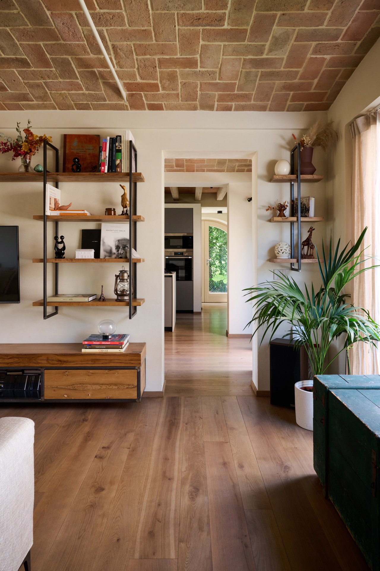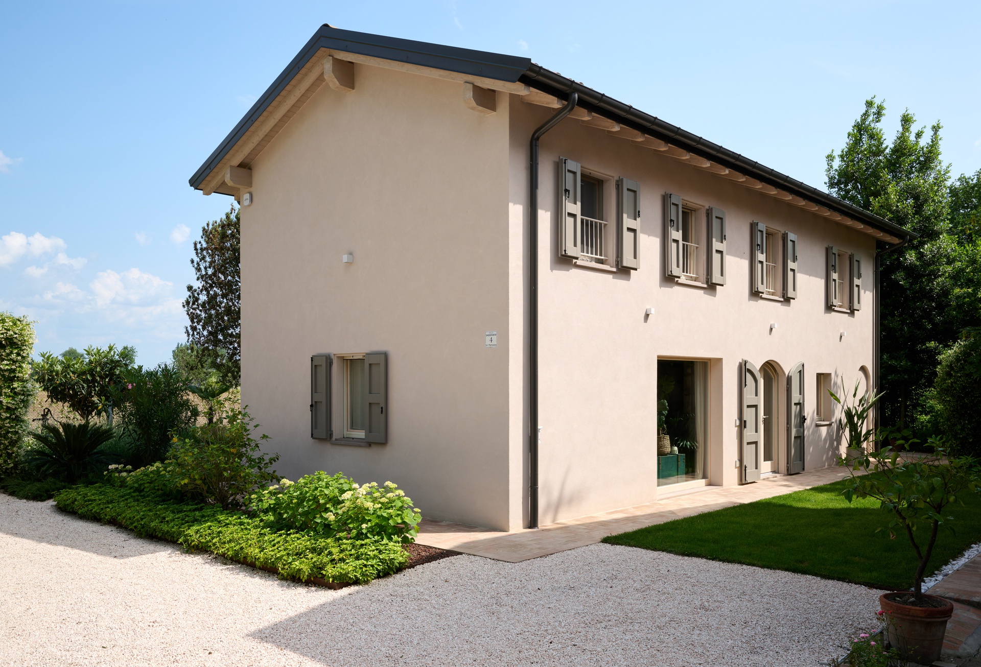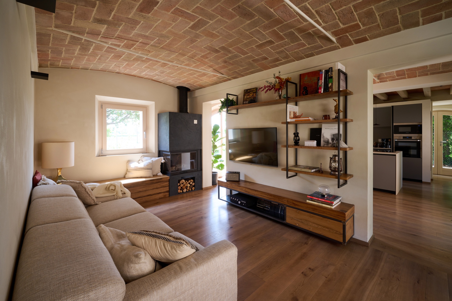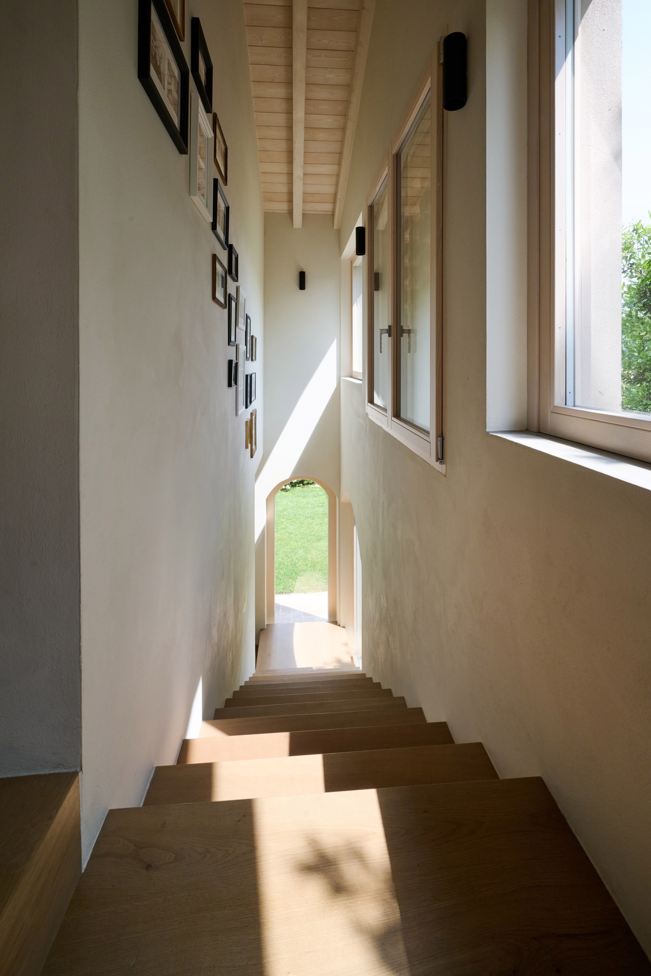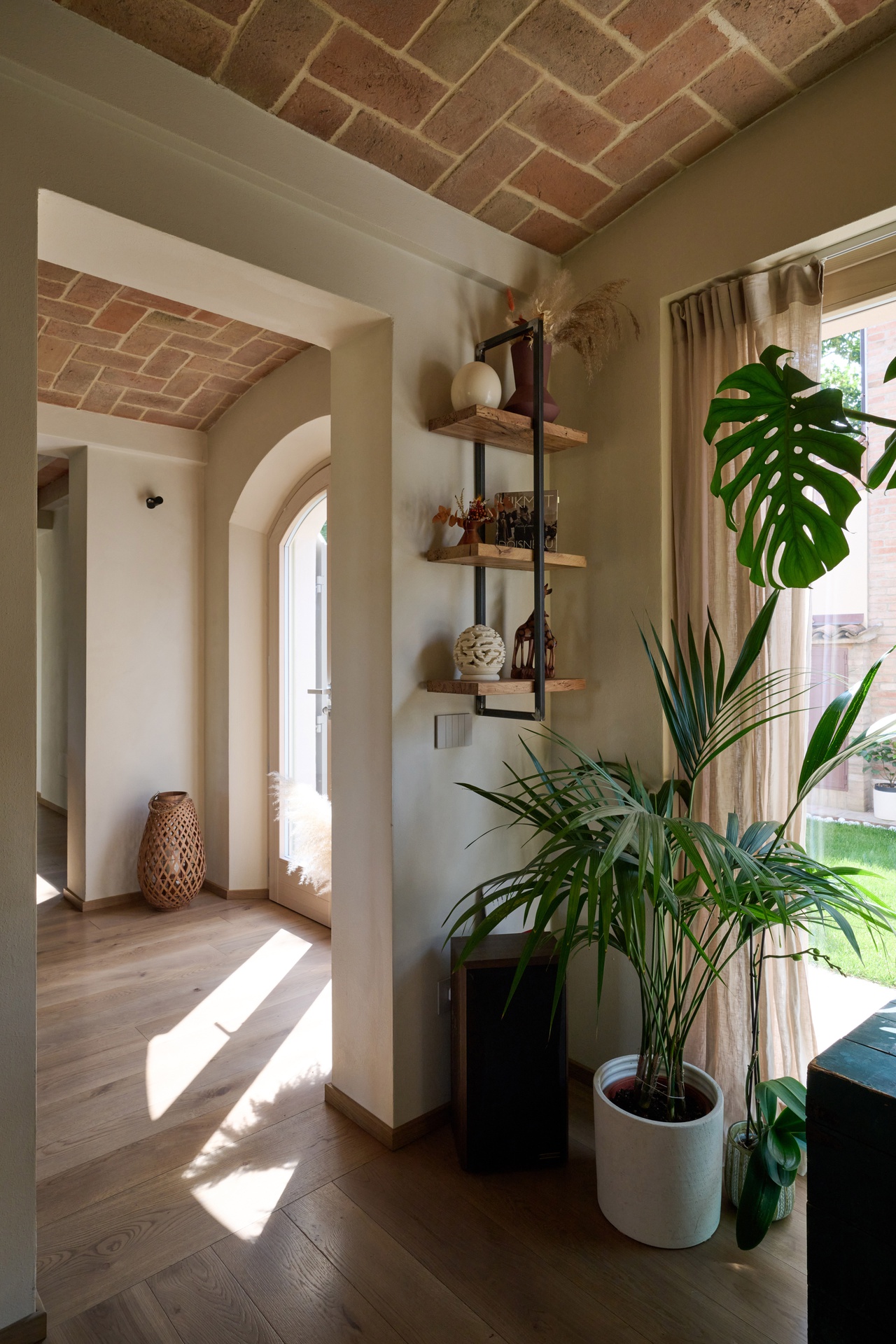 L’intervento ha avuto come obiettivo la ristrutturazione di una casa rurale con vincolo di restauro, risalente a fine ‘800 situata nella campagna modenese, composta da una abitazione al piano primo e magazzini e stalle al piano terra. Partendo dalla sagoma originale, si è ricavata un’unica abitazione disposta su due piani che ricerca l’armonia tra le forme della tradizione (soffitti voltati in pietra o in legno e tavelle di cotto, pareti tinteggiate a calce, infissi in legno) e il comfort della modernità, ripristinando l’atmosfera domestica di una volta e la tradizione del luogo.La pianta originaria dell’edificio risalente alla fine dell’800, è stata in parte modificata. Sono state mantenute e ampliate le aperture finestrate e gli accessi; le grandi bucature del piano primo, che in origine si affacciavano su una loggia aperta, oggi illuminano dall’alto la scala rivestita in rovere. Al piano terra, inizialmente adibito a magazzini e stalle, vi si accedeva tramite un locale voltato con due grandi aperture ad arco disposte frontalmente. Questo ingresso è stato valorizzato diventando il fulcro abitativo della casa con la zona pranzo e la cucina disposta ad isola da cui si osserva il soggiorno, esaltando la funzionalità e la convivialità del luogo.Ai colori e materiali che rimandano alla tipologia rurale, sono stati affiancati materiali nuovi come la pavimentazione in rovere, continua anche nella scala di collegamento tra i piani, il cemento ecologico per le superfici dei bagni, e arredi realizzati su disegno della progettista utilizzando il legno di recupero della demolizione, originario del ‘600. L’uso dei colori della terra, di materiali naturali, di forme organiche, di arredi realizzati su misura o vintage di recupero, rendono gli spazi accoglienti e in armonia tra loro, collegati da un filo invisibile creato dalla luce naturale proveniente dalle ampie vetrate e dalla matericità delle finiture. “L’intento è stato quello di trasformare l’abitazione in una casa moderna ma con il calore e l’accoglienza dell’antico. Una casa dal tempo indefinito, legata al passato e proiettata nel futuro che non invecchierà mai”
