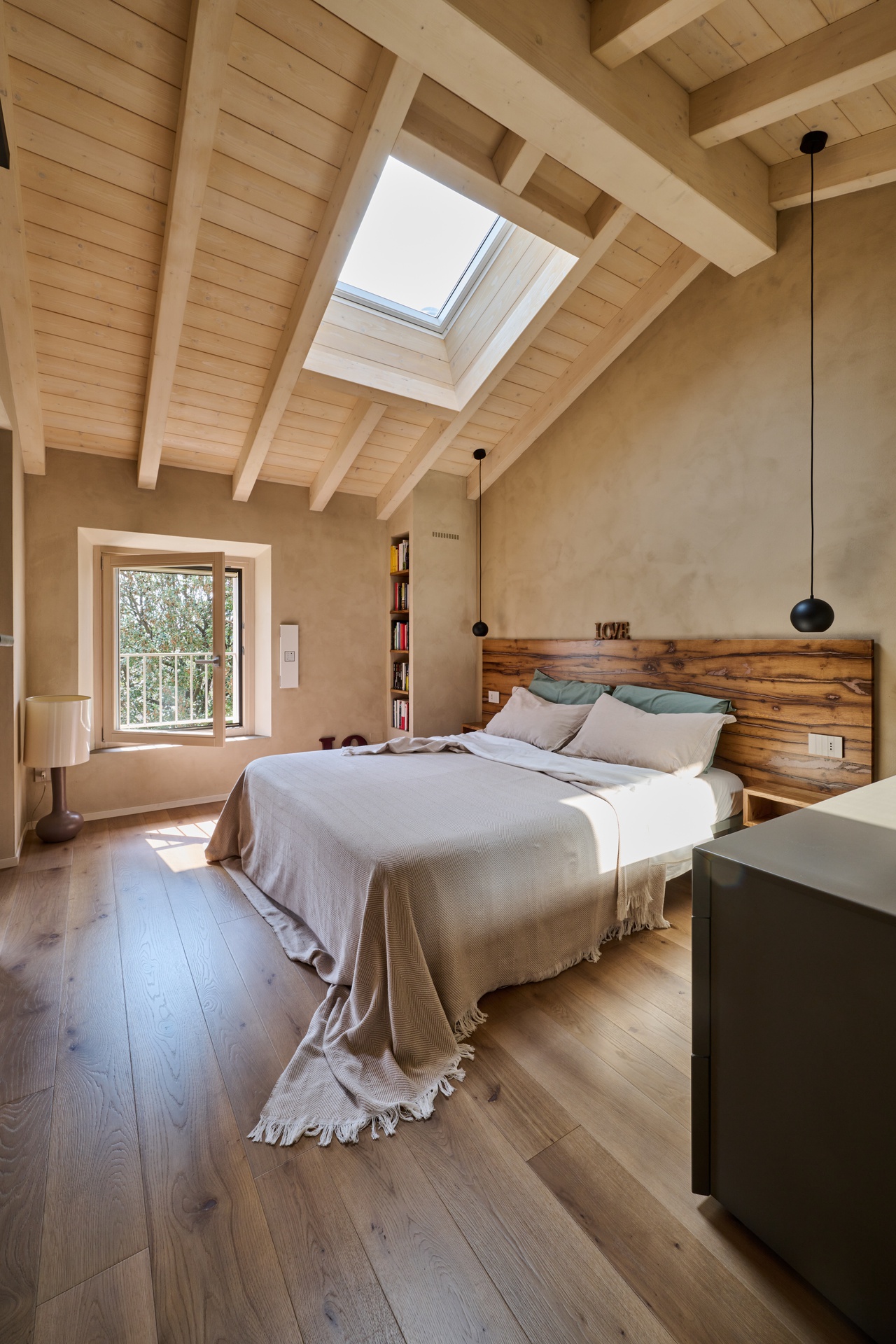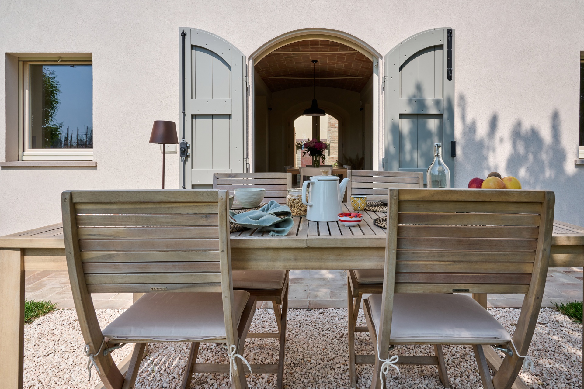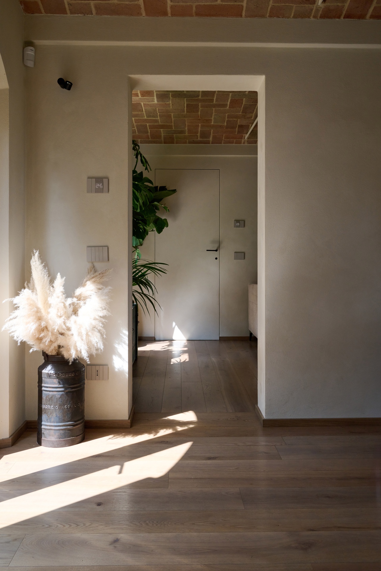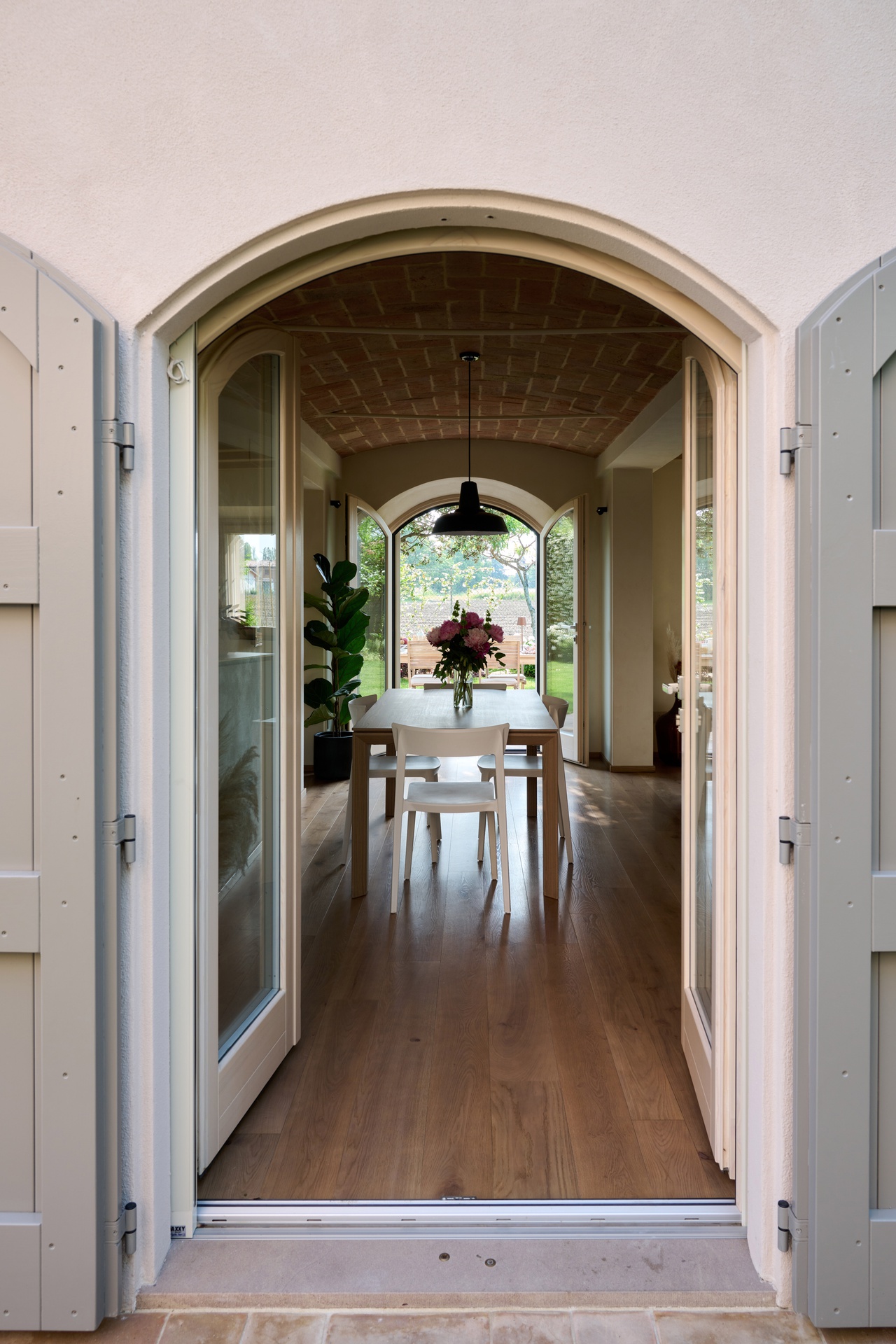 L’intervento ha avuto come obiettivo la ristrutturazione di una casa rurale con vincolo di restauro, risalente a fine ‘800 situata nella campagna modenese, composta da una abitazione al piano primo e magazzini e stalle al piano terra. Partendo dalla sagoma originale, si è ricavata un’unica abitazione disposta su due piani che ricerca l’armonia tra le forme della tradizione (soffitti voltati in pietra o in legno e tavelle di cotto, pareti tinteggiate a calce, infissi in legno) e il comfort della modernità, ripristinando l’atmosfera domestica di una volta e la tradizione del luogo.La pianta originaria dell’edificio risalente alla fine dell’800, è stata in parte modificata. Sono state mantenute e ampliate le aperture finestrate e gli accessi; le grandi bucature del piano primo, che in origine si affacciavano su una loggia aperta, oggi illuminano dall’alto la scala rivestita in rovere. Al piano terra, inizialmente adibito a magazzini e stalle, vi si accedeva tramite un locale voltato con due grandi aperture ad arco disposte frontalmente. Questo ingresso è stato valorizzato diventando il fulcro abitativo della casa con la zona pranzo e la cucina disposta ad isola da cui si osserva il soggiorno, esaltando la funzionalità e la convivialità del luogo.Ai colori e materiali che rimandano alla tipologia rurale, sono stati affiancati materiali nuovi come la pavimentazione in rovere, continua anche nella scala di collegamento tra i piani, il cemento ecologico per le superfici dei bagni, e arredi realizzati su disegno della progettista utilizzando il legno di recupero della demolizione, originario del ‘600. L’uso dei colori della terra, di materiali naturali, di forme organiche, di arredi realizzati su misura o vintage di recupero, rendono gli spazi accoglienti e in armonia tra loro, collegati da un filo invisibile creato dalla luce naturale proveniente dalle ampie vetrate e dalla matericità delle finiture. “L’intento è stato quello di trasformare l’abitazione in una casa moderna ma con il calore e l’accoglienza dell’antico. Una casa dal tempo indefinito, legata al passato e proiettata nel futuro che non invecchierà mai”