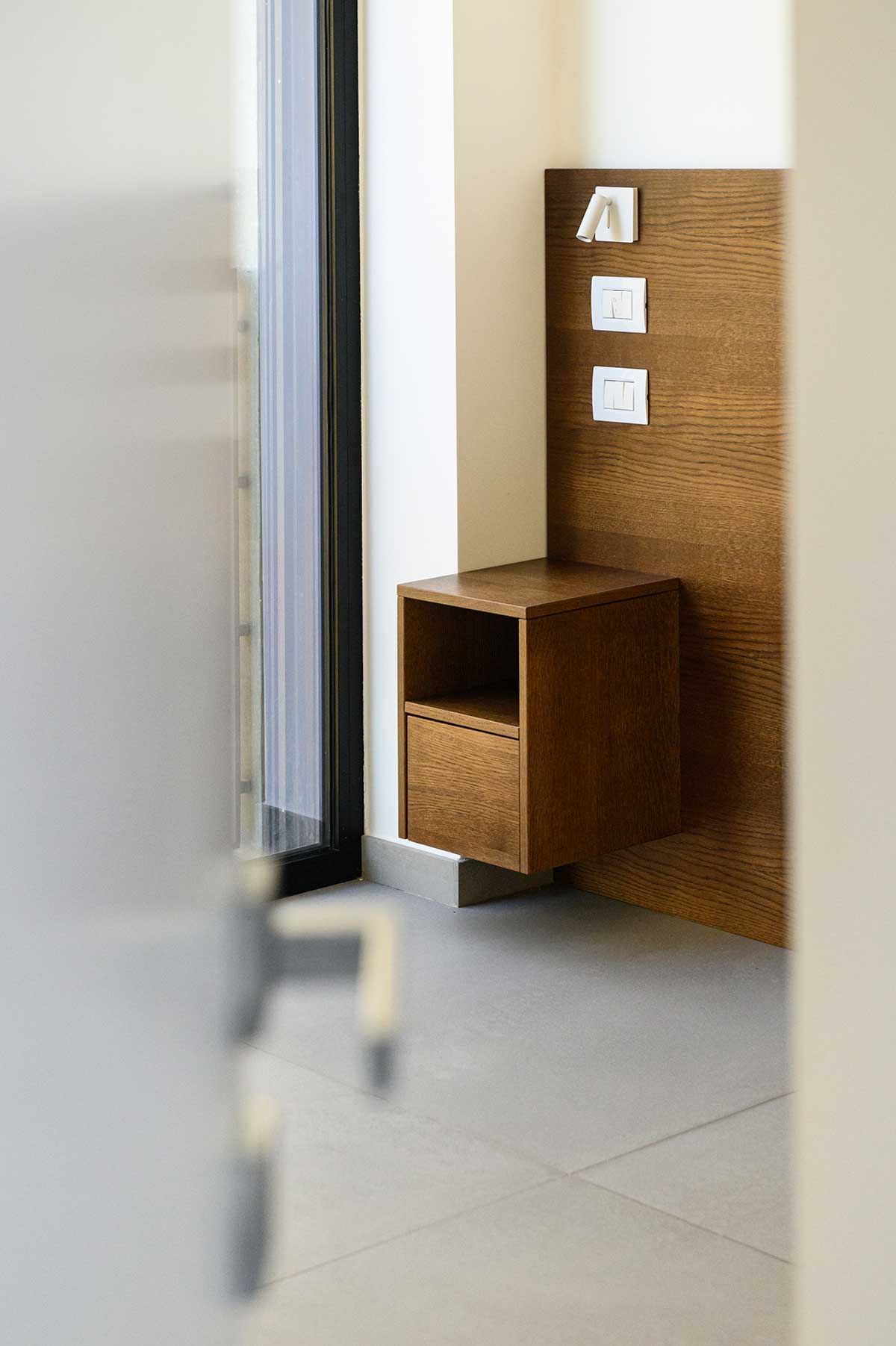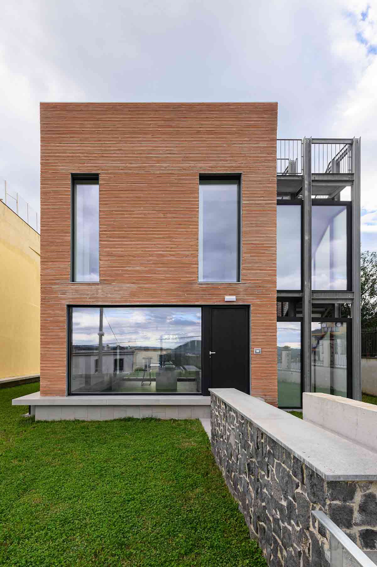 Villa monofamiliare a Monte di Procida.Un oggetto architettonico eccentrico in un contesto residenziale della provincia di Napoli, in cui una forte sperimentazione, se pur razionalista e funzionalista, non lascia l’osservatore indifferente.L’intero lotto non è raggiungibile dalle auto se non dal piano interrato, per cui di fatto l’abitazione risulta immersa nell’agrumeto e priva di veicoli.Dalla strada si accede in auto sotto l’abitazione direttamente nel garage interrato, oppure varcando l’ingresso pedonale attraverso la scala si accede alla zona giorno. Quest’ultima sviluppata in direzione nel lotto è aperta sul fronte anteriore e quello posteriore dove la cucina trova affaccio diretto al giardino sul retro, perfettamente a livello che di fatto estende la zona pranzo anche all’esterno.La zona notte posta al primo piano, si raggiunge con una scala indipendente dal corpo di fabbrica principale, staccata dalla struttura e realizzata in metallo, con travi HEA e gradini in orsogrill totalmente a vista.Il collegamento verticale tra piano terra e piano primo è protetto da un tunnel vetrato che affaccia a sua volta nella corte interna generata dal distacco tra volume scale e fabbricato.Il piano della zona notte presenta le aperture perpendicolari alla zona giorno palesando la scelta compositiva di contrapporre le bucature del piano terra con quelle del primo piano.Il volume architettonico principale è interamente rivestito in laterizio forato da 3cm posato orizzontalmente e lasciato a vista, alternando la faccia concava a quella convessa della tavella in modo da offrire alla facciata una particolare vibrazione alla luce del sole che cambia effetto a seconda dell’ora in cui colpisce i prospetti. Il garage interrato è totalmente realizzato con muri di contenimento in calcestruzzo armato lasciato completamente a facciavista.Al piano terra l’open space trova la sequenza ideale di ingresso, living, pranzo, cucina, con un piccolo mezzo bagno affacciato sulla corte interna.Al piano primo, il largo disimpegno della zona notte presenta una scrivania a sbalzo che aggiunge la funzione di zona studio comune. Le camere sono separate dal corridoio e tra di loro dagli armadi. Non ci sono pareti dunque ma separazioni funzionali e contenitori che fungono da armadi e da tramezzi.Infine la parte aperta della scala in metallo porta al terrazzo di copertura che gode di uno splendido panorama da capo Miseno passando per il Vesuvio fino alla spiaggia romana e il monte di Cuma.