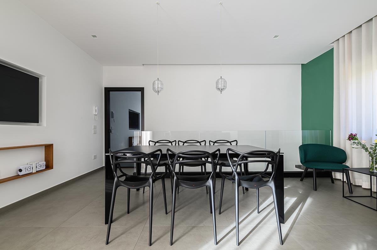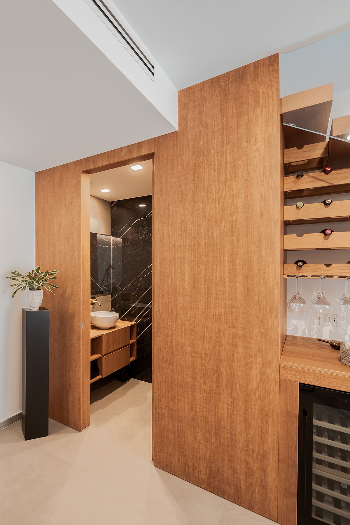 Ristrutturazione di un appartamento duplex di circa 150mq totali.La coppia di giovani committenti ci ha chiesto di realizzare un progetto che permettesse un utilizzo quotidiano e funzionale di entrambi i piani che in principio non erano collegati dall’interno.La proposta di realizzare una scala interna che potesse collegare in maniera diretta i due livelli collegati dapprima solo da una scala condominiale già esistente, ha trovato subito il favore dei committenti. Scala interna che è diventata uno vero e proprio tema di arredo. Lo studio napoletano di architettura e design manuarino ha scelto di realizzare una scala con gradini a sbalzo in legno e integrata al bar sottostante e al volume bagno sottostante.Al piano terra l’ingresso principale precede il grande spazio living dove troviamo un grande e comodo divano (Calía) per la zona Tv e quattro poltroncine (Connubia) per la zona conversazione. Lo spazio è dominato da due elementi realizzati in falegnameria su misura su disegno esclusivo e inedito dello studio manuarino: il separè all’ingresso che genera anche la parete tv attrezzata, e la scala con gradini a sbalzo che diventa bar nella parte bassa e bottigliera nella parte alta. La scala culmina nel grande volume di legno che cela il bagno ospiti ben nascosto da una porta filoparete a tutt’altezza in continuità con la boiserie di rivestimento del bagno.Il bagno è caratterizzato nel rivestimento da un’unica grande lastra di Gres effetto marmo nero marquina che dona all’ambiente bagno un’atmosfera molto elegante e ne amplifica lo spazio che se pur molto essenziale anche nelle misure, viene percepito come molto ampio grazie alle superfici lapidee spalmate su tutta l’altezza.Salendo al piano primo la zona giorno continua con area pranzo e cucina a isola. La cucina (Veneta cucine) presenta una parete prevalentemente attrezzata con colonne e una parte centrale con piano di lavoro, e una grande isola o, per essere più precisi, penisola (perché addossata alla parete) di tre metri con un grande top in Gres porcellanato (Decton) che garantisce un piano di lavoro molto generoso.La zona notte è separata con una porta scorrevole (pivato) in vetro fumè reflex che separa il disimpegno delle camere dalla zona pranzo. Disimpegno che trova una grande cappottiera e una zona svuotatasche.La camera matrimoniale molto essenziale presenta una testata letto realizzata in falegnameria su misura, laccata grigio a poro aperto in continuità con il colore della parete subito sopra a sua volta illuminata da una gola luminosa che genera un effetto wallwash molto gradevole e scenografico.La porta scorrevole in vetro fume reflex separa la grande cabina armadio.Il bagno in camera completo, mantiene il pavimento dell’appartamento anche come rivestimento pareti, eccetto per la parete di fondo della doccia per la quale è stato scelto un rivestimento decorativo molto caratterizzante e prezioso della Naxos ceramiche.Il terzo bagno è molto spazioso e accoglie anche un comodo spazio lavanderia celato da una parete mobile a tre ante a tutt’altezza realizzata su misura. Il rivestimento decorativo stavolta è un effetto onice verde lucido che dona all’ambiente un tono di classicità contrapposto all’essenzialità e alla purezza formale dello spazio.La sinergia con la committenza anche in questo caso ha prodotto una splendida alchimia per cui l’avventura della ristrutturazione se pur con alti e bassi è risultata un piacere sia per i professionisti coinvolti sia per i committenti stessi che ora sembrano godere a pieno dell’abitazione che tanto anno sognato!
