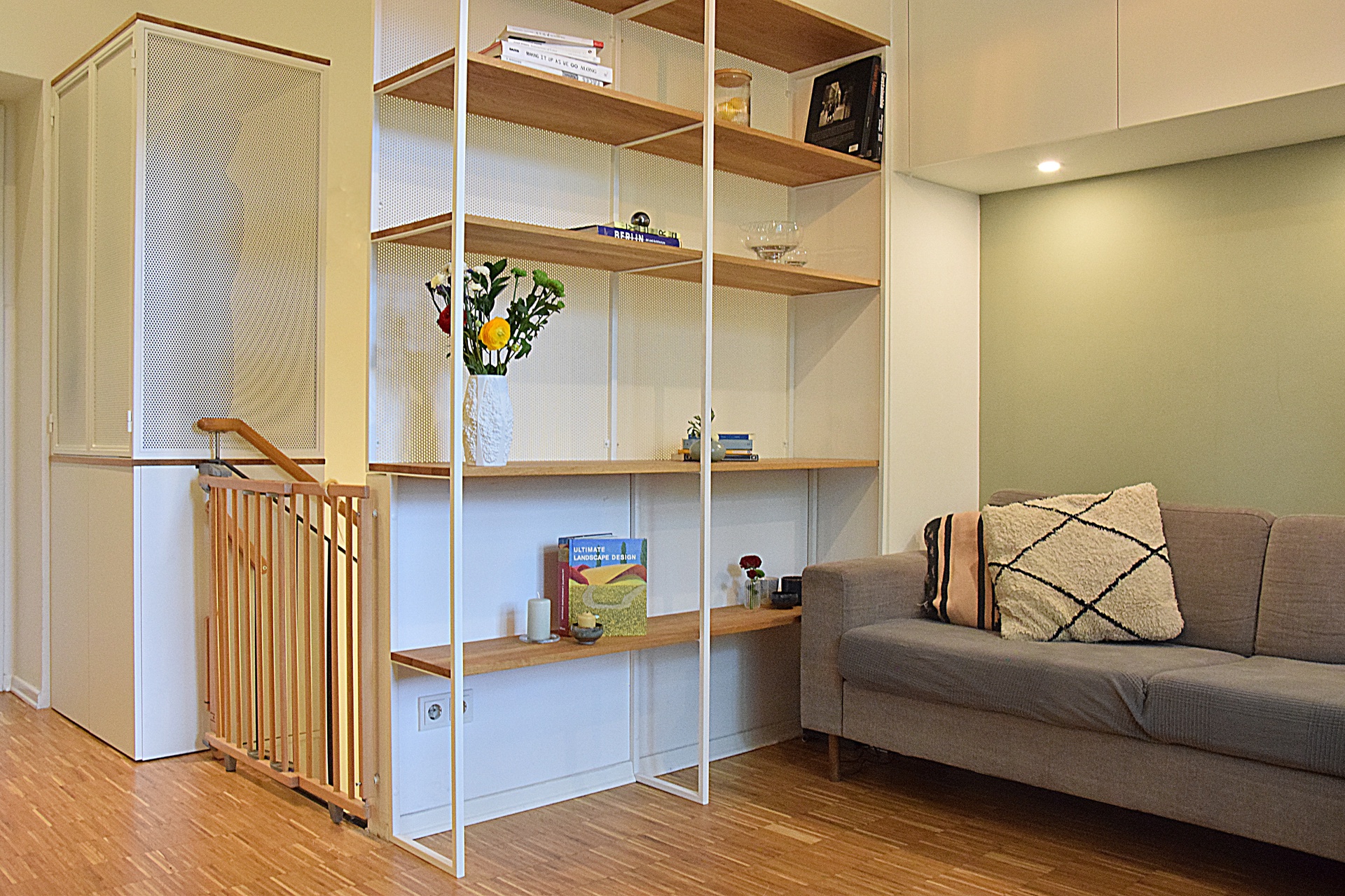 CASA FF è un progetto di Interior-RELOOKING della zona di ingresso e del Living al piano superiore di un appartamento Maisonette a Berlino. Esigenze del progetto.- Dare carattere allo spazio d’ingresso e del salotto, cercando di creare una qualità architettonico-funzionale. Rendere il parapetto della scala a “prova di bambini”.- Creare uno spazio contenitore, per giacche, scarpe e poter nascondere i giochi dei bambini. Obiettivi.Con lavori di falegnameria ed in metallo è stata progettata e creata su misura una “barriera d’aria”; la quale prende forma, come diaframma tra le due zone dell’appartamento, in un armadio per le giacche e le scarpe all’entrata ed una libreria nella zona Living. La struttura in ferro bianca lascia il posto all’alternanza di piani in legno massello di rovere o ad ante laminate bianche. Una lamiera perforata crea poi le pareti in trasparenza di cui l’ambiente necessitava. La nicchia del divano invece è stata arricchita e valorizzata dall’armadio contenitore sospeso a 4 ante, con faretti sottostanti integrati, che illuminano la sua parete retrostante, anch’essa dipinta con il colore “salvia” come la "box bagno" di fronte, ed il divano. Le linee della struttura dei tre i volumi realizzati vengono richiamate da una parte all’altra degli ambienti, come fossero un elemento unico che lascia intravedere giochi prospettici e geometrici. Un arredo su misura, architettonico e funzionale che cambia totalmente la percezione dello spazio della zona di ingresso e del soggiorno, rendendolo accogliente, armonioso e di carattere.