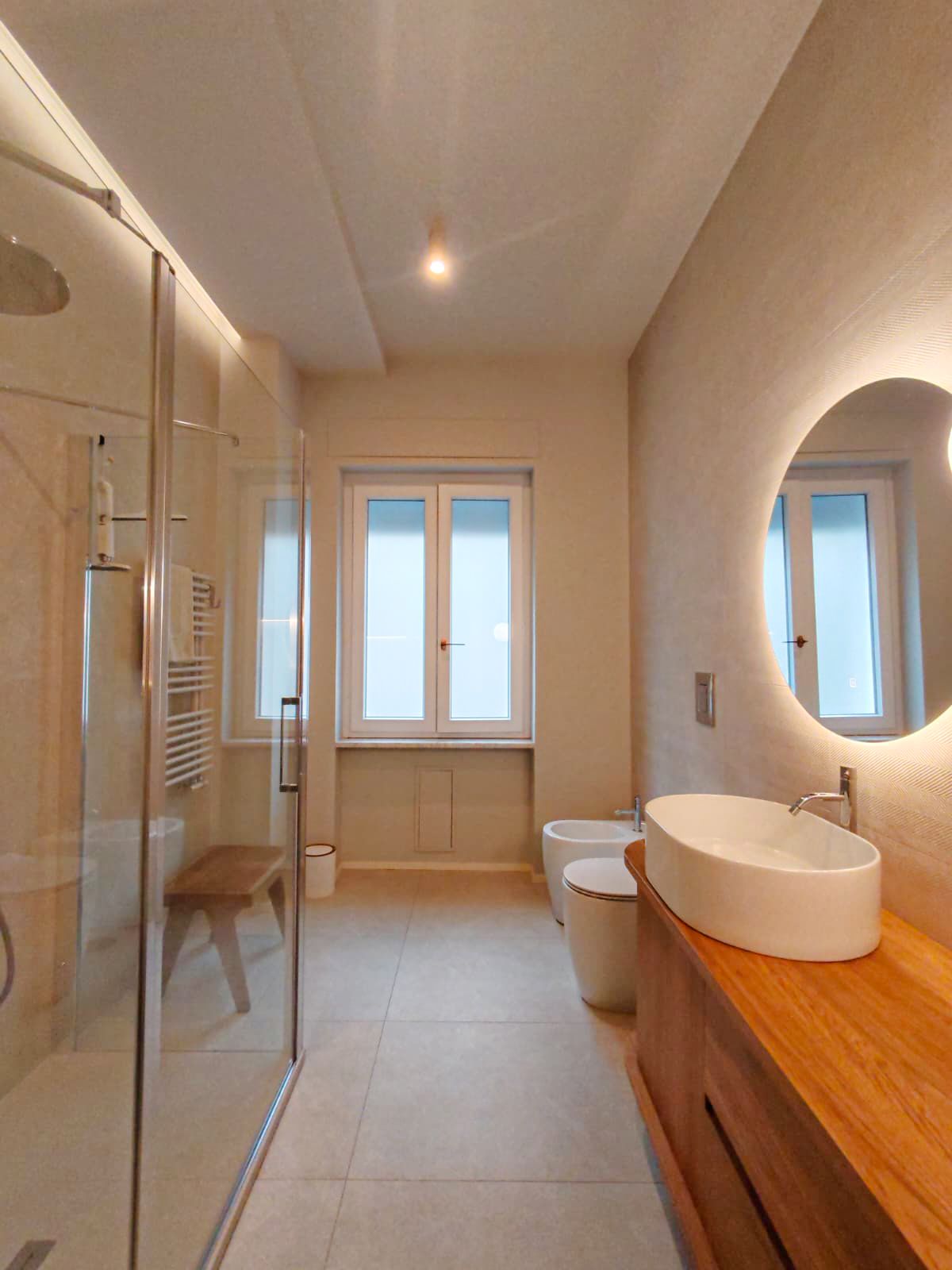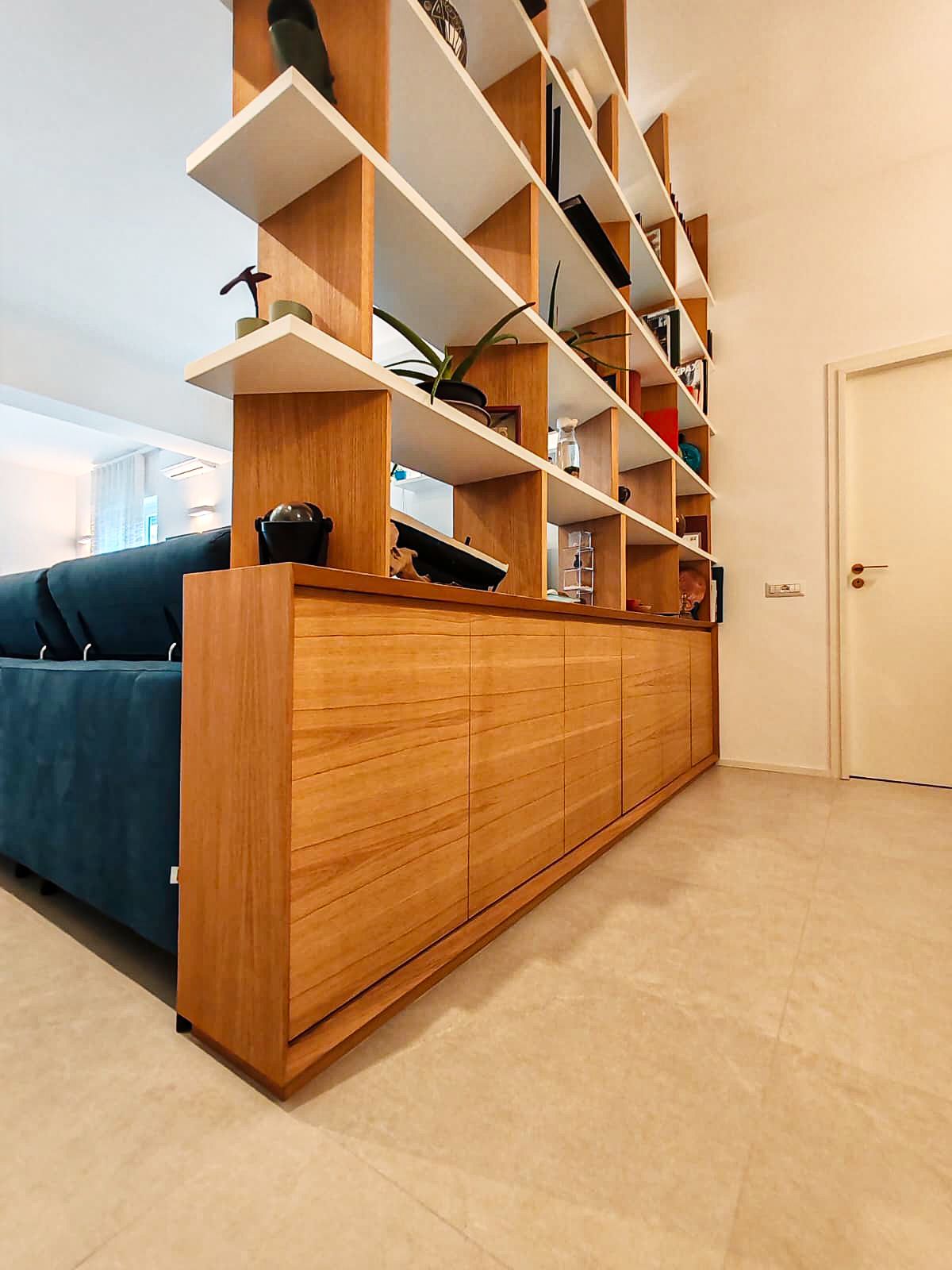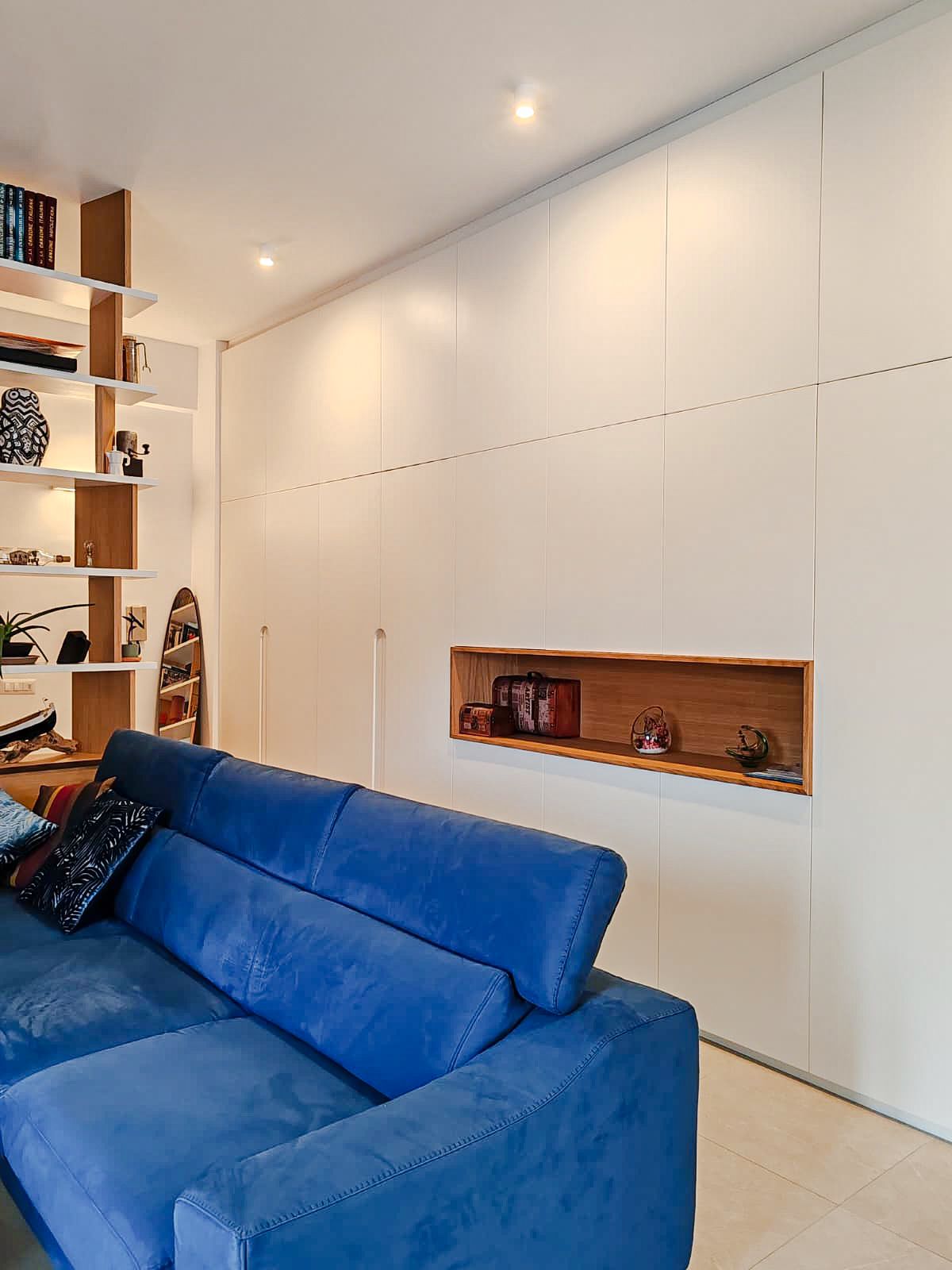 In questo progetto, l'obiettivo principale è stato quello di massimizzare l'illuminazione naturale nella zona giorno e creare soluzioni di contenimento su misura, come armadi a muro, per rispondere alle specifiche esigenze del cliente.L'intervento ha previsto in gran parte la demolizione dei tramezzi che frammentavano l'area living, al fine di ottenere un ampio open space.Sul lato sinistro è stato realizzato un grande armadio a muro, armoniosamente integrato con una boiserie e una porta filo muro in legno di rovere chiaro con finitura a doghe.L’intero ambiente è stato arricchito dall’utilizzo di tonalità ispirate al mare per pavimenti e cucina, un richiamo alla passione del proprietario per il mare e la nautica.Sono stati ricavati due bagni, uno a servizio della camera padronale e uno per gli ospiti, entrambi dotati di finestra.La zona lavanderia è stata sapientemente nascosta all'interno di armadi a muro con finitura a doghe, mantenendo così l’estetica pulita e ordinata.Questo progetto, attualmente in fase di completamento, ha richiesto un lavoro di falegnameria altamente specializzato, che ha dato vita a un ambiente completamente rinnovato, caratterizzato da una cura meticolosa per i dettagli e soluzioni su misura.