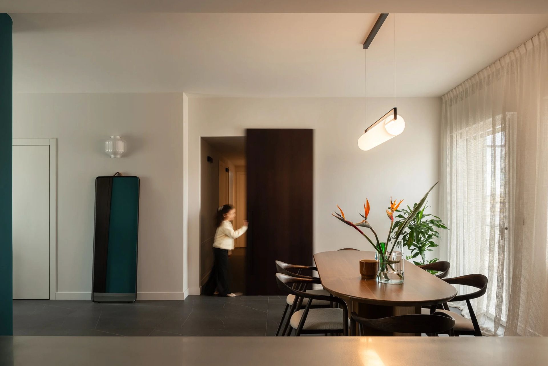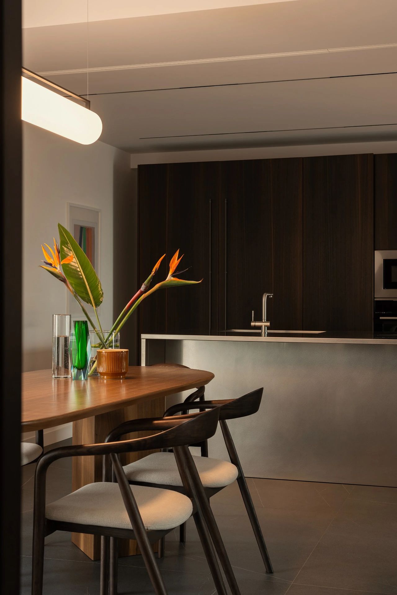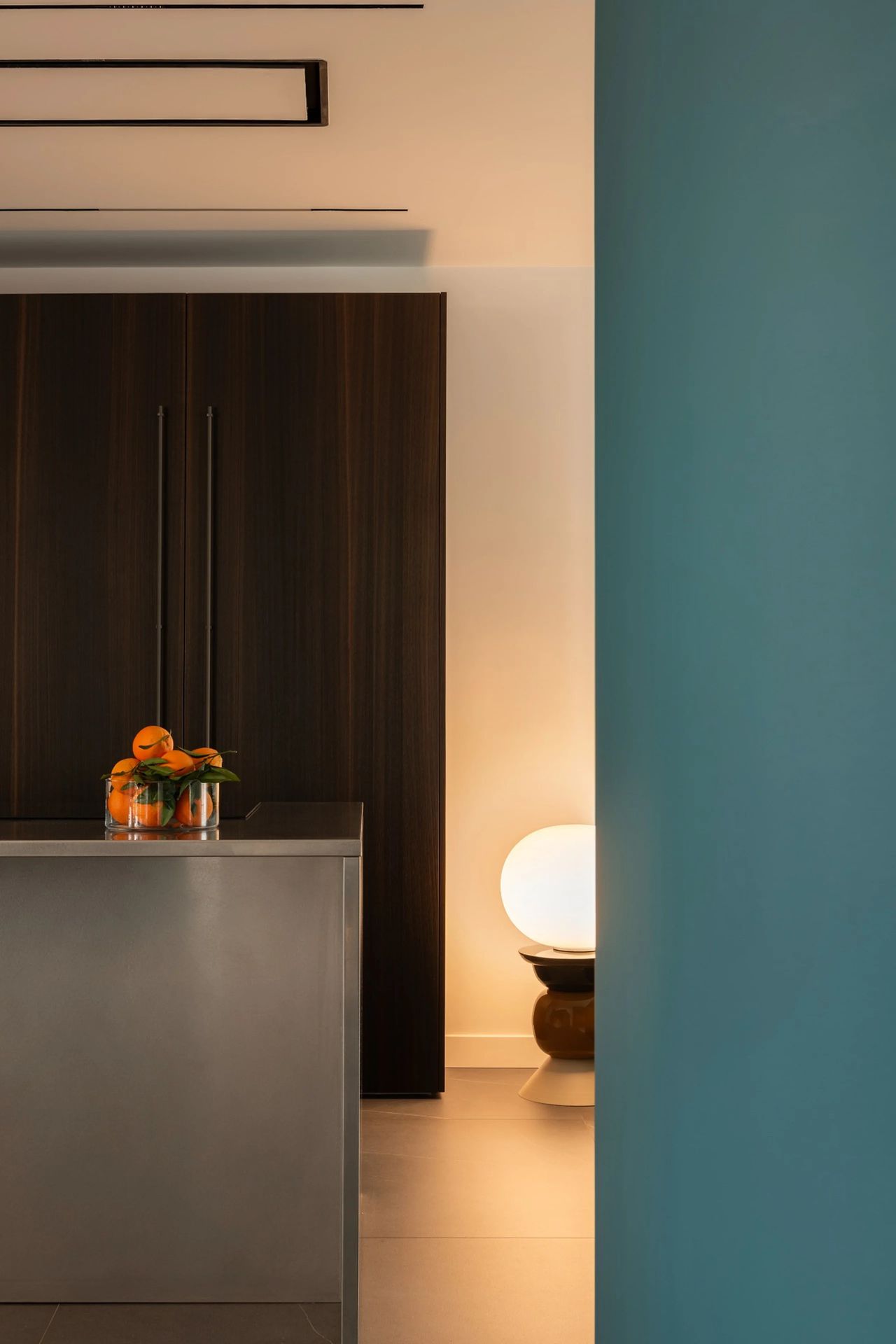 casa gargano | manfredoniaUn appartamento contemporaneo progettato come sequenza di spazi fluidi e continui, dove architettura e arredo dialogano attraverso materia, luce e colore.L’intervento di interior design nasce dalla volontà di eliminare la rigidità distributiva originaria, trasformando la zona giorno in un ambiente aperto e permeabile, capace di accompagnare i diversi momenti della quotidianità.Il fulcro della casa è la cucina con isola in acciaio satinato, pensata come elemento architettonico oltre che funzionale, attorno al quale si organizzano living e zona pranzo. Le superfici materiche, i legni scuri e i toni neutri sono bilanciati da un segno cromatico deciso che diventa riferimento visivo e orientamento spaziale.Il progetto costruisce così un equilibrio tra minimalismo e atmosfera abitata,privilegiando continuità percettiva e comfort quotidiano.Il bagno prosegue lo stesso linguaggio progettuale attraverso contrasti calibrati tra pietra e legno,mentre i dettagli definiscono un’estetica essenziale ma domestica.