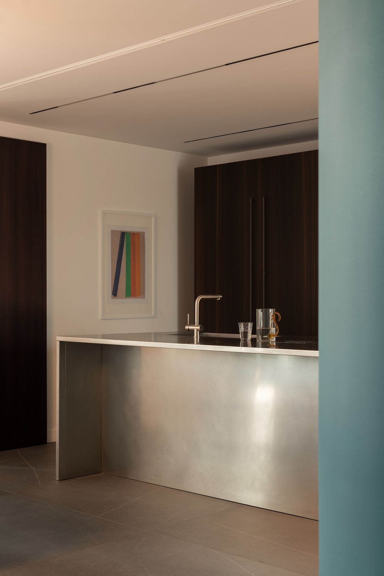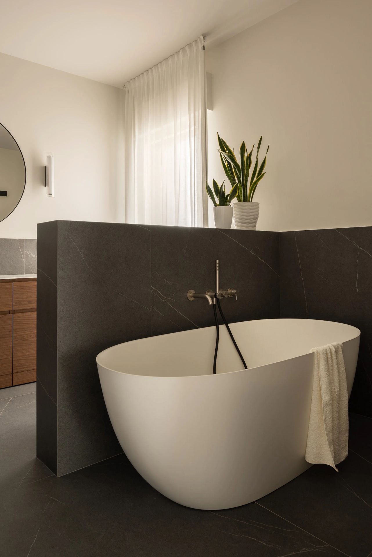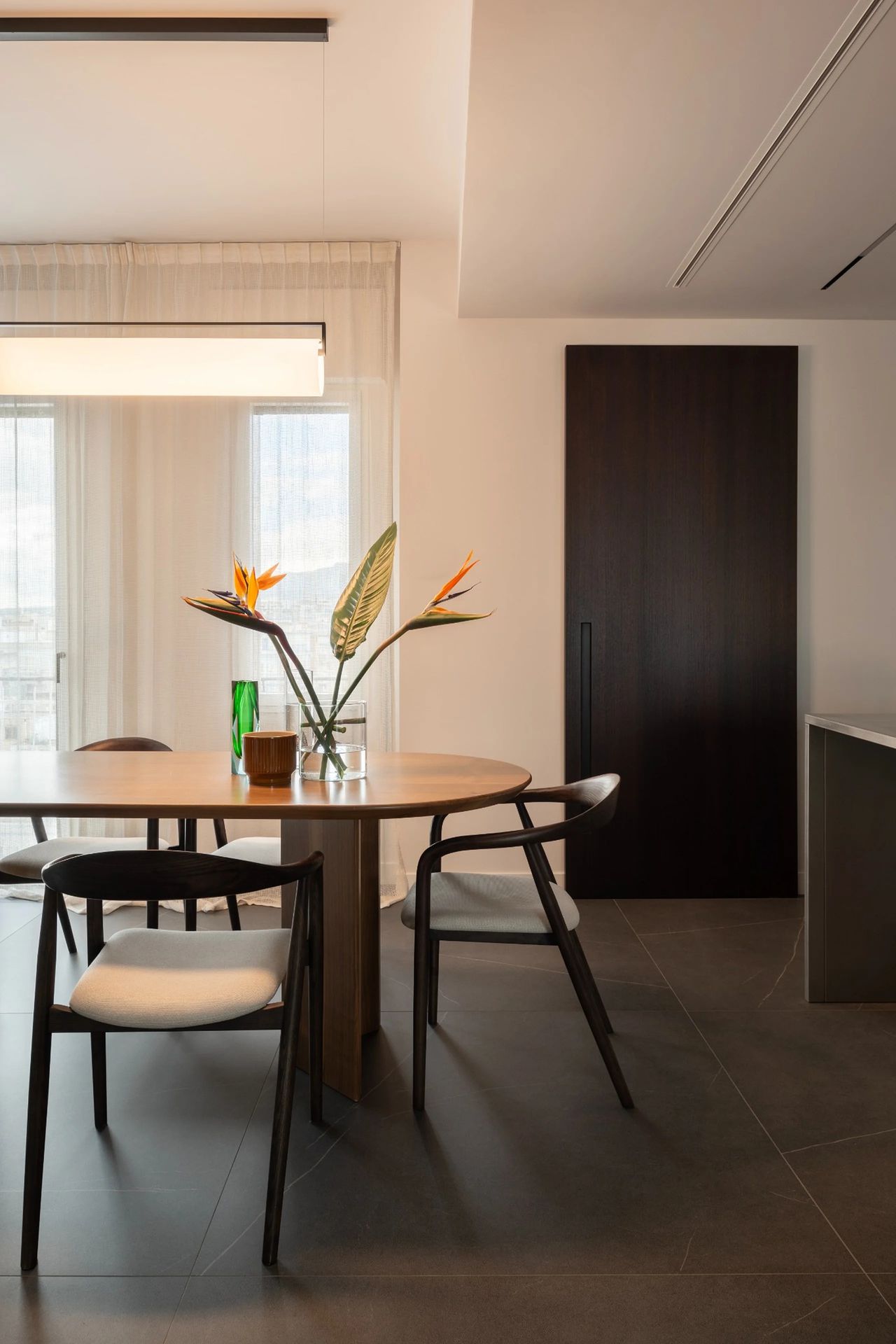 casa gargano | manfredoniaUn appartamento contemporaneo progettato come sequenza di spazi fluidi e continui, dove architettura e arredo dialogano attraverso materia, luce e colore.L’intervento di interior design nasce dalla volontà di eliminare la rigidità distributiva originaria, trasformando la zona giorno in un ambiente aperto e permeabile, capace di accompagnare i diversi momenti della quotidianità.Il fulcro della casa è la cucina con isola in acciaio satinato, pensata come elemento architettonico oltre che funzionale, attorno al quale si organizzano living e zona pranzo. Le superfici materiche, i legni scuri e i toni neutri sono bilanciati da un segno cromatico deciso che diventa riferimento visivo e orientamento spaziale.Il progetto costruisce così un equilibrio tra minimalismo e atmosfera abitata,privilegiando continuità percettiva e comfort quotidiano.Il bagno prosegue lo stesso linguaggio progettuale attraverso contrasti calibrati tra pietra e legno,mentre i dettagli definiscono un’estetica essenziale ma domestica.