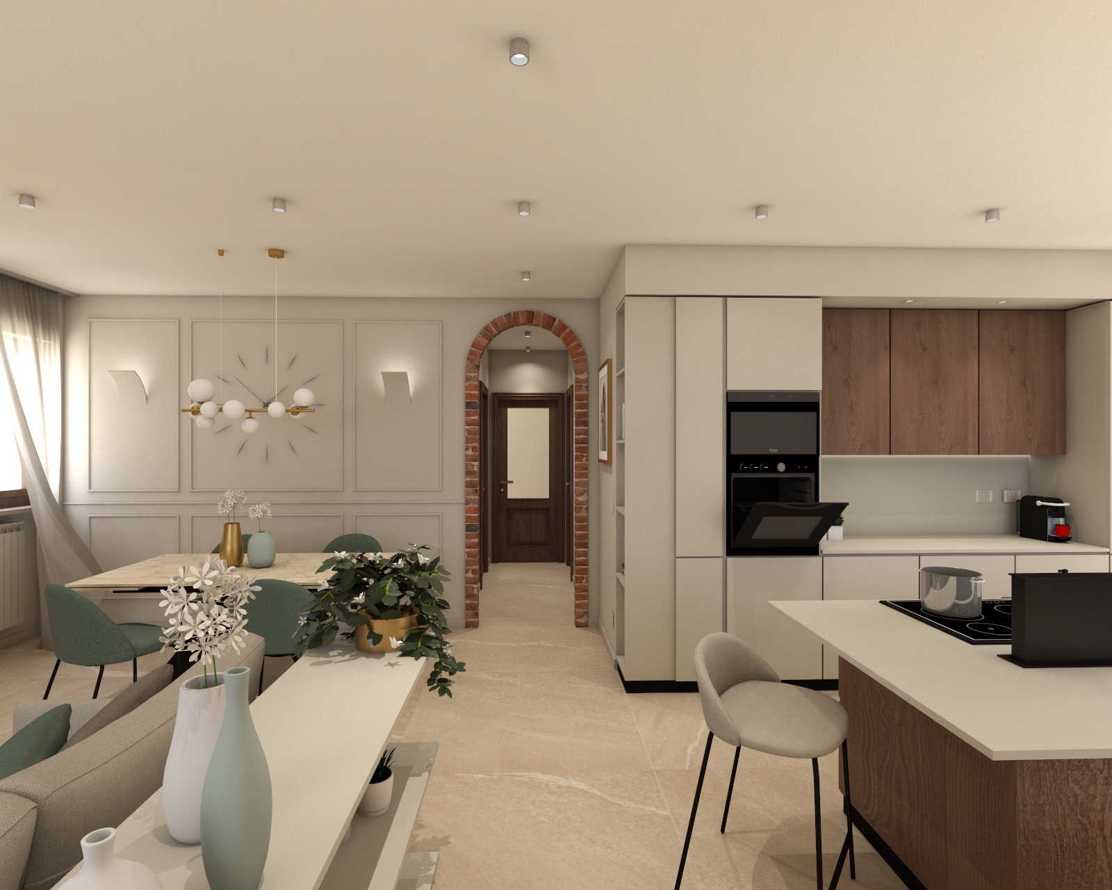 RENDER | Ristrutturazione di una villetta a schiera.Per questa casa i clienti avevano le idee ben definite: stile classico-contemporaneo, boiserie a parete, caminetto a fianco alla tv, toni neutri, cucina con isola, tocchi di verde sui complementi di arredo. Quindi esattamente il mio stile!Si era indecisi tra parquet o grande formato in gres, quindi nei render sono state proposte le due opzioni, differenziando anche l'arredo all'ingresso.Anche per il bagno, siccome piaceva il verde ho proposto un effetto jungle nella doccia ripreso dal verde dei mobili, poi mi è stato chiesto di fare un'opzione anche con una piastrella effetto corten accostando dei mobili che riprendessero quel colore.Per la cucina, siccome sapevo che l'avrebbero comprata da Stosa, ho proposto una decina di soluzioni accostando vari colori del brand.Progetto d'interni e render: Arch. Francesca BoglioProgetto: Geom. Alberto Corgiat Loia
