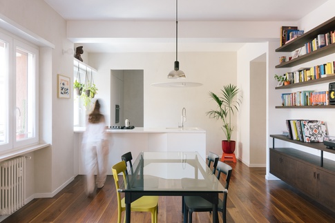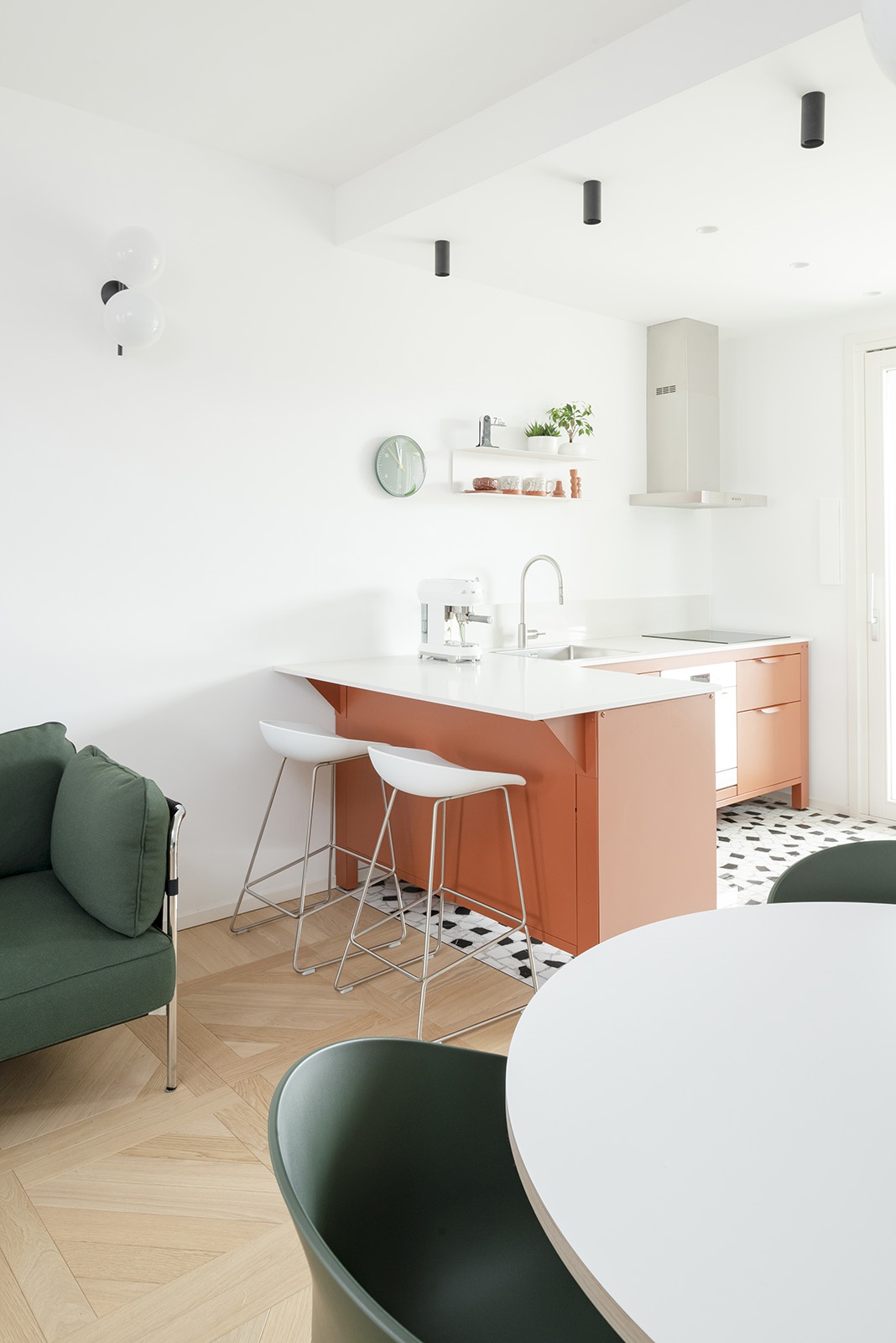 Il progetto di questa casa si sviluppa attraverso il contrasto di materiali, colori e texture, definendo ogni ambiente con una sua identità precisa.Il soggiorno è caratterizzato da un parquet a quadrotte su disegno, pensato come un “tappeto”, mentre la cucina si distingue per un pavimento effetto palladiana specchiante. Quest’ultima combina un’anima industriale, con un piano lavoro in ferro terracotta, e un’anima elegante, con colonne in legno laccato bianco.La camera matrimoniale, più calda e accogliente, è definita dal parquet a doghe sfalsate e da arredi neri minimali per un’atmosfera rilassante. Il bagno padronale riprende la tonalità terracotta della cucina, con pavimento e rivestimento a disegno diagonale, enfatizzando il contrasto tra piastrelle e stucco.Il bagno ospiti gioca sul dualismo chiaro/scuro e liscio/ruvido: il pavimento geometrico in piastrelle bianche opache si contrappone a un rivestimento che mescola diverse texture.