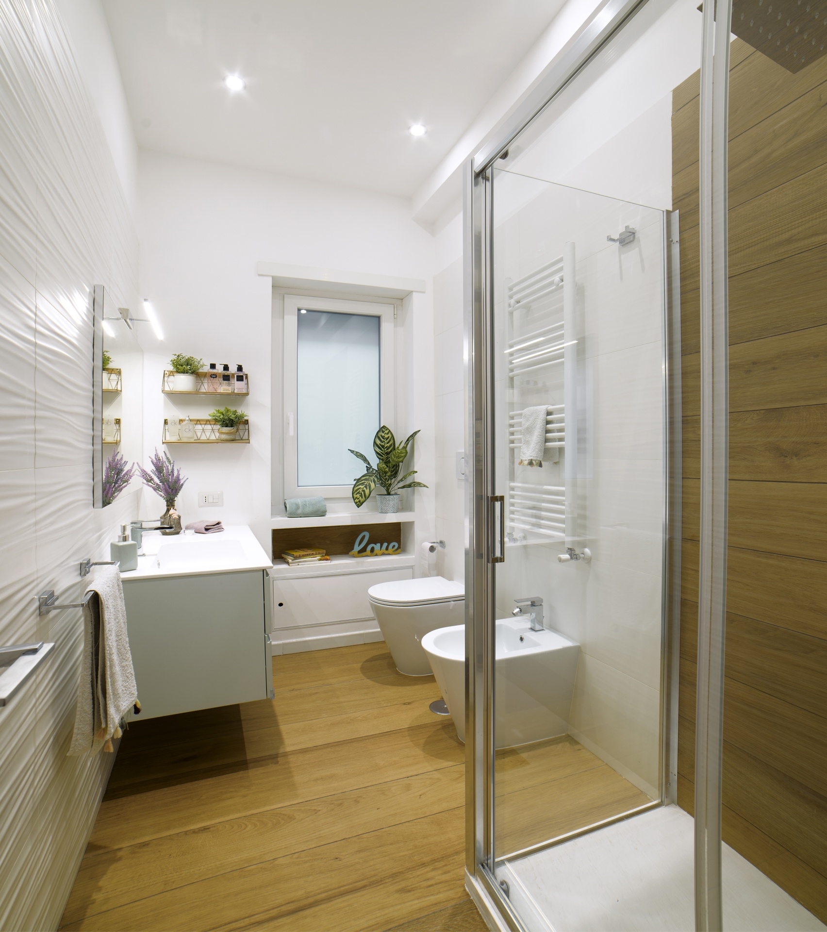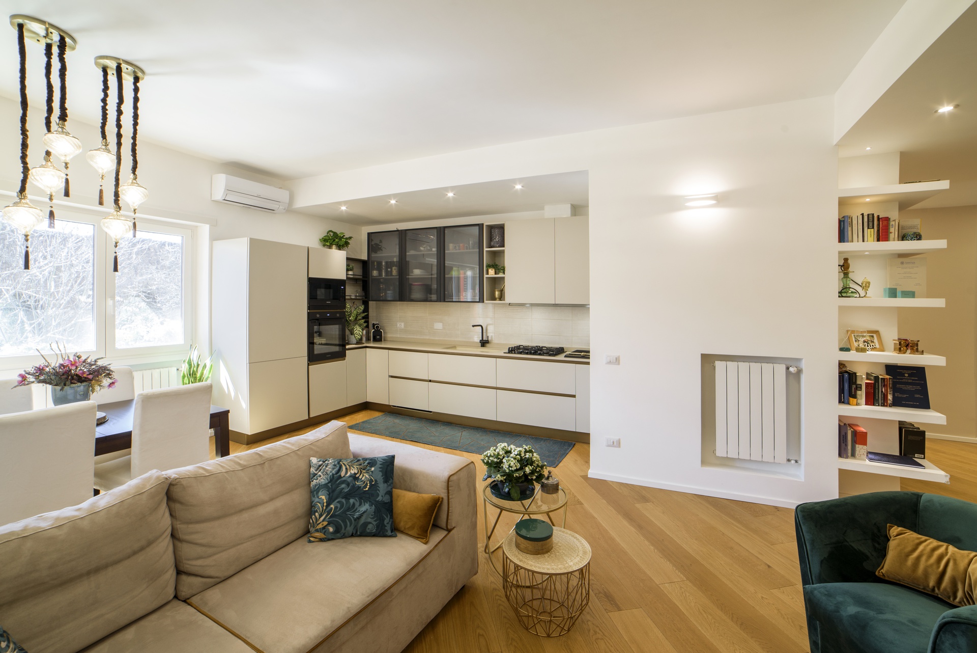Il progetto di questa ristrutturazione è frutto di un costante e proficuo scambio di idee con i committenti, una giovane coppia che realizzava il sogno della “prima casa”. L’appartamento, di circa 110 mq, ha una pianta fortemente irregolare e si trova nel vivace quartiere romano di Torpignattara.L’intuizione iniziale è stata quella di sfruttare l’affaccio sui resti di un antico Acquedotto Romano, prospiciente l’edificio, come elemento di pregio per la zona living/cucina. Questa idea è stata il perno di tutta la progettazione: l’impianto originale è stato pesantemente trasformato per spostare la cucina nella parte opposta dell’appartamento rispetto alla posizione originaria e creare un secondo bagno. Nella parte centrale, senza possibilità di luce diretta, è stata creata una zona lavanderia/ripostiglio ed una piccola dispensa per la cucina, che diventa divisione e filtro tra le zona giorno e zona notte. Questo spazio è caratterizzato da un grande parallelepipedo centrale "scavato" in diversi punti per ospitare la cucina, una libreria ed il termoarredo: al suo interno trova posto una piccola dispensa per la cucina e la zona lavanderia.Nel living trova posto una struttura in cartongesso che ospita un camino a gas ed integra la zona TV. Luci e controsoffitti aiutato a delimitare le diverse zona di questo grande ambiente open space.La zona notte si connota da un’ampia cabina armadio nella camera padronale e da un bagno dedicato, unico superstite del vecchio impianto della casa.