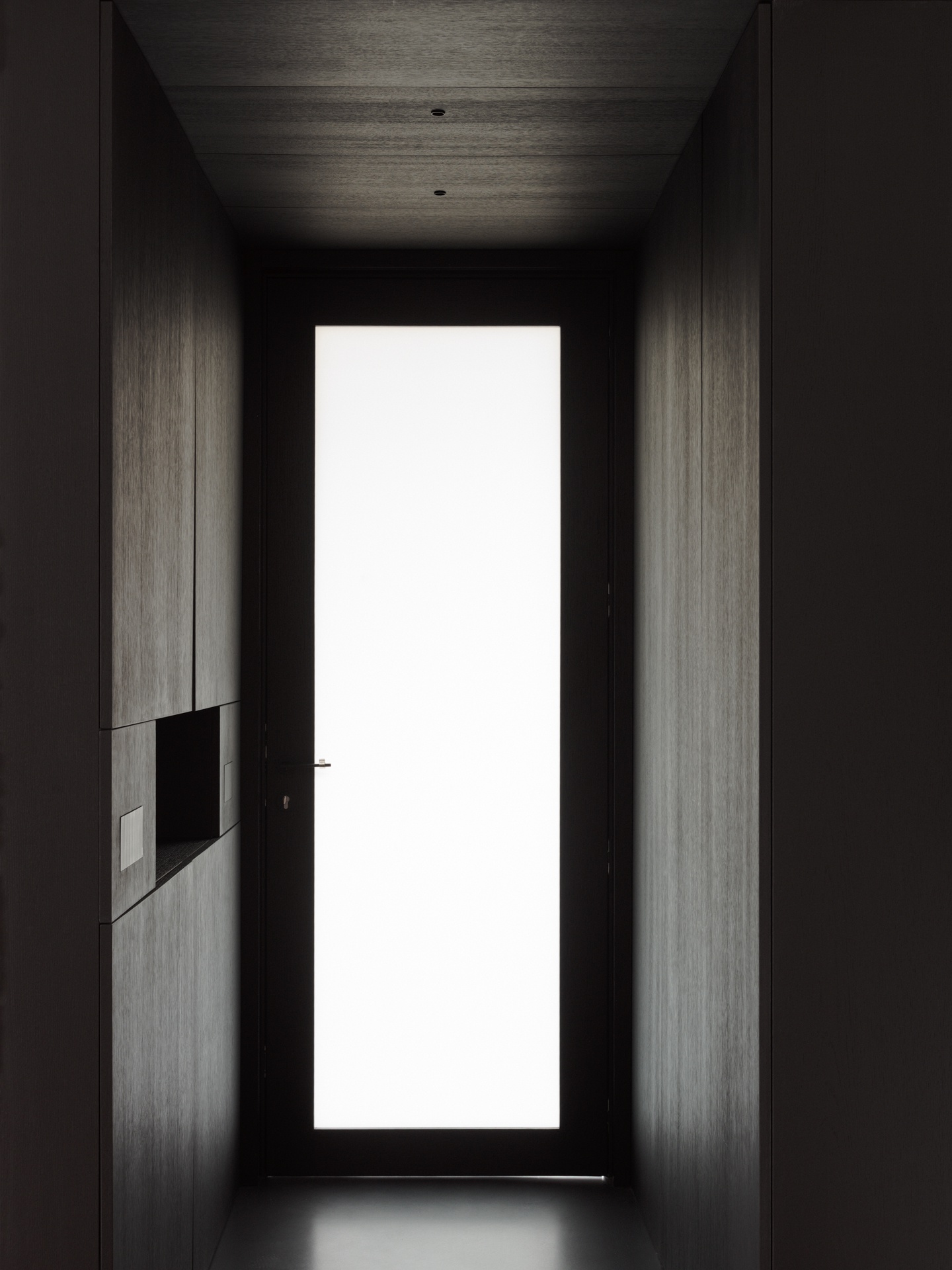L’unità immobiliare oggetto di intervento si colloca all’interno di un edificio plurifamiliare in piano secondo ubicato in un ambito di versante, libero su tre lati (Sud _ Ovest _ Nord), dotato di due balconi rispettivamente con affaccio sul fronte Sud e sul fronte Nord, caratterizzato da una vista privilegiata sul capoluogo valtellinese visibile grazie alle generose finestrature in legno che contraddistinguono l'ampia zona living. L’ingresso è stato pensando come un elemento fortemente caratterizzante, qui proposto con un rivestimento ligneo, spazzolato, di colore nero, su misura, che si pone l’obiettivo di generare una scatola all’interno dell’ambiente circostante, ben distinta e visibile all’occhio del fruitore, generando una vera e propria zona filtro organizzata con armadiature e spazi di stivaggio a scomparsa.Da qui si prosegue giungendo nel corridoio centrale controsoffittato dove emergono i due pilastri e la trave soprastante dalle quali si è rimosso manualmente lo strato di intonaco che le caratterizzava, facendo emergere la finitura in cemento a vista, irregolare, con elementi lapidei al suo interno, a rappresentanza dell'antica ossatura dell'immobile. Appaiono immediatamente visibili all'occhio del fruitore gli ingressi della camera padronale, della camera dei bambini e del locale igienico grazie alla presenza di porte in rovere su misura con maniglia dedicata di colore nero a richiamo dell'ingresso che generano delle cornici all'interno del cromatismo neutrale delle pareti che fanno da fondale. La camera padronale si contraddistingue grazie alla presenza di una boiserie retro letto in rovere che nasconde al suo interno una mensola con illuminazione led dedicata e delle nicchie volte a movimentare la linearità costruttiva del fondale generando pieni e vuoti. Un'armadiatura su misura caratterizzata da maniglie tailor made completa l'arredo. Il locale igienico, seppur di contenute dimensioni, risulta ottimizzato nella disposizione degli elementi che ne garantiscono un'ottimale fruizione. Il rivestimento ceramico a tutta altezza delle pareti risulta poi perfettamente integrato alla pavimentazione in rovere permettendo agli elementi di design scelti di emergere sotto un profilo del design. La zona living con andamento Est - Ovest si organizza in tre ambienti ben distinti (cucina - zona pranzo - soggiorno) e fortemente caratterizzanti l'ambiente circostante, senza che però nessuno sovrasti quello attiguo, attraverso un sapiente uso dell’arredo e dei volumi che essi generano. Il soggiorno si avvale da una quinta in legno su misura collocata centralmente nell'ambiente così da creare alla sua destra e alla sua sinistra un corridoio di passaggio che potesse dividere questo spazio da quella pranzo, ma nel contempo mantenere un continuum visivo con la restante parte dell'unità immobiliare evitandone una sua esclusione. La finitura cannettata abbinata ad un'illuminazione integrata contribuiscono a trasformarla in un elemento fortemente caratterizzante. La zona pranzo si organizza intorno ad un tavolo in marmo perfettamente allineato alla finestra rivolta a Nord che regala ai commensali una vista privilegiata sul capoluogo valtellinese. Non si è voluto optare per una classica illuminazione a soffitto, scegliendo al contrario di avvalersi di una gola ricavata nel mobile cannettato retrostante che potesse regalare una maggiore pulizia compositiva all'ambiente. La cucina si organizza in tre elementi apparentemente distinti, ma perfettamente connessi sotto un profilo compositivo, cromatico e funzionale: l'isola centrale con tavolo snack in rovere fa da crocevia generando libertà nei percorsi del fruitore, connettendo l'angolo caratterizzato dalla presenza di frigorifero e forno e della parte più lineare che segue l'andamento della parete.Lo Studio ha curato altresì l'illuminazione degli ambienti, optando per corpi illuminanti dalle forme classiche a richiamo del passato, da aggiungersi ad altri di moderno design, perfettamente integrati con l'arredo su misura, con la conseguenza di generare mutevoli scenari e giochi di luce a servizio degli spazi.