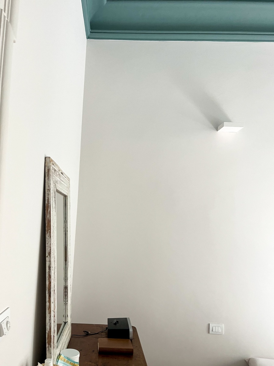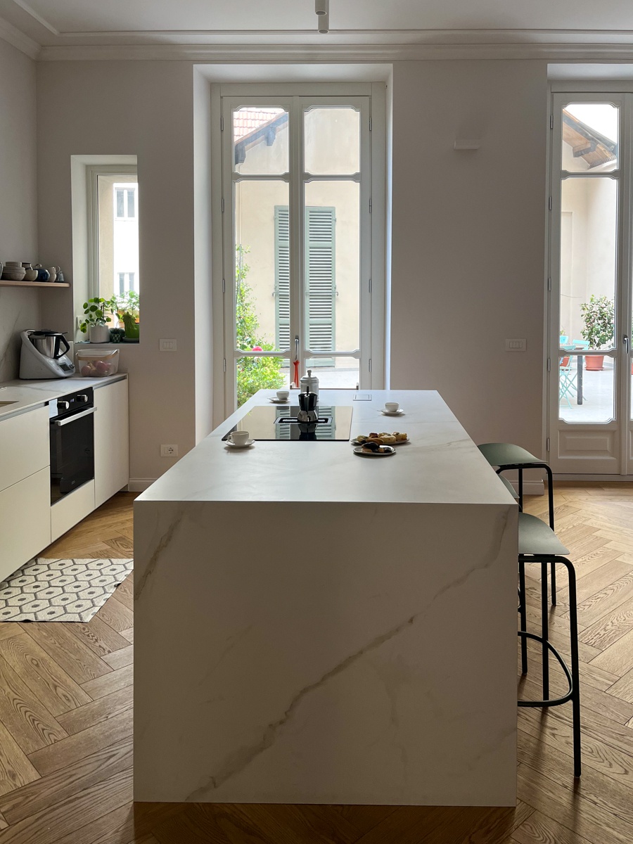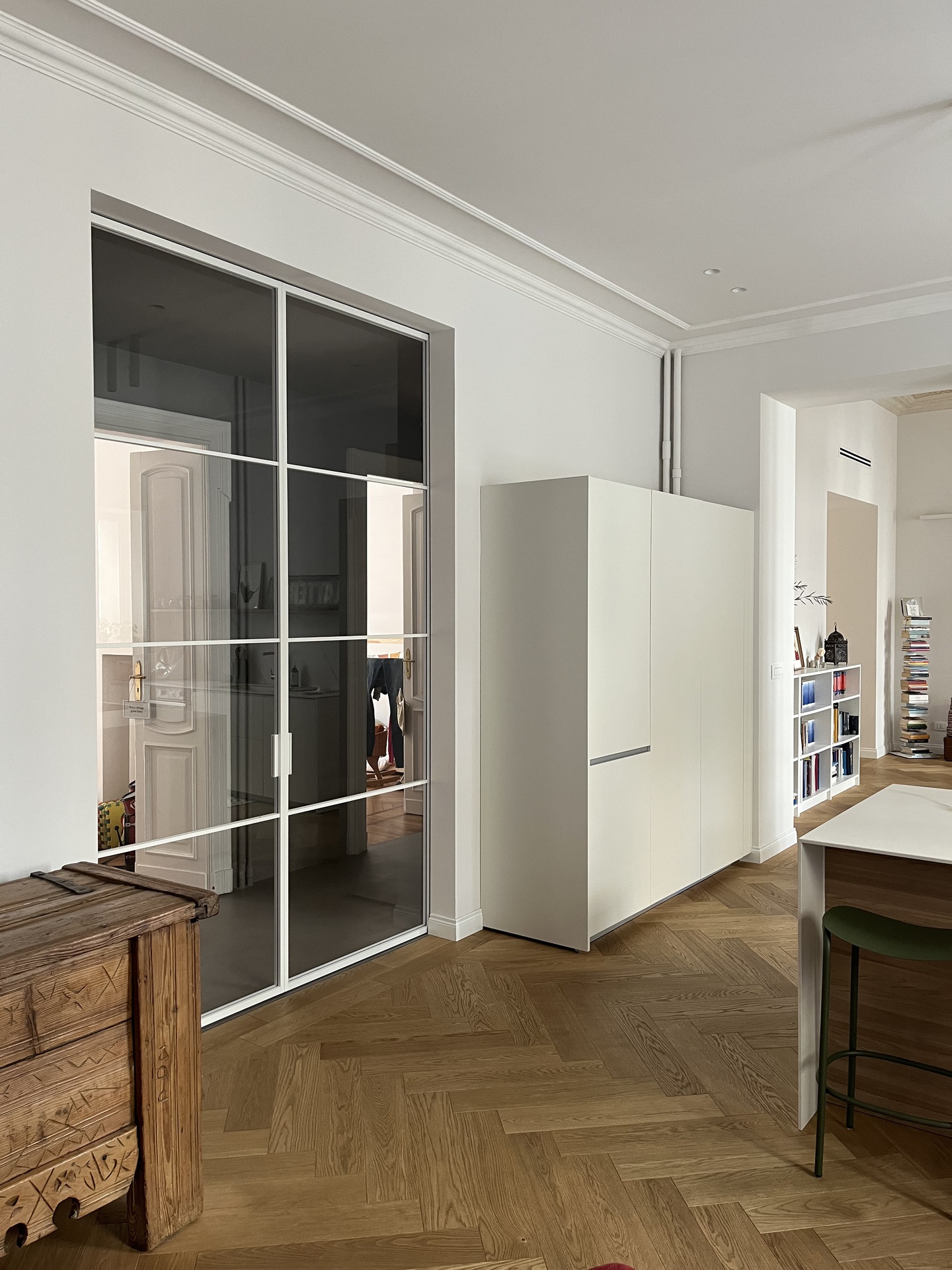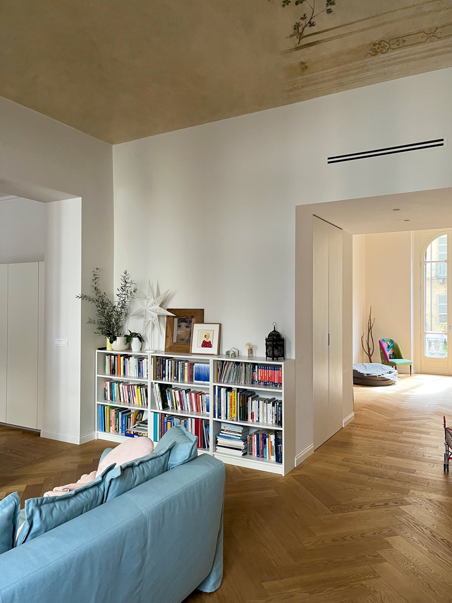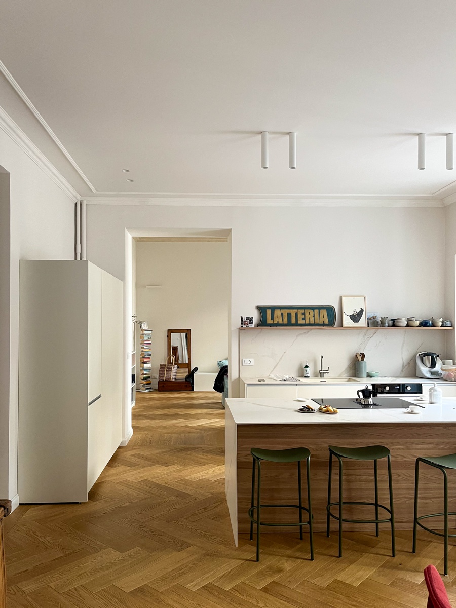 Il layout originario era caratterizzato da un corridoio di quasi 14 metri che divideva rigidamente l’appartamento in due parti. L’intervento ha previsto importanti demolizioni per ripensare completamente la distribuzione interna, con l’obiettivo di ottenere ambienti più ampi, luminosi e funzionali. Lungo il tracciato del vecchio corridoio sono stati ricavati un nuovo bagno, un ripostiglio e due cappottiere, trasformando uno spazio di puro passaggio in una sequenza di volumi utili e strategici per la vita quotidiana.