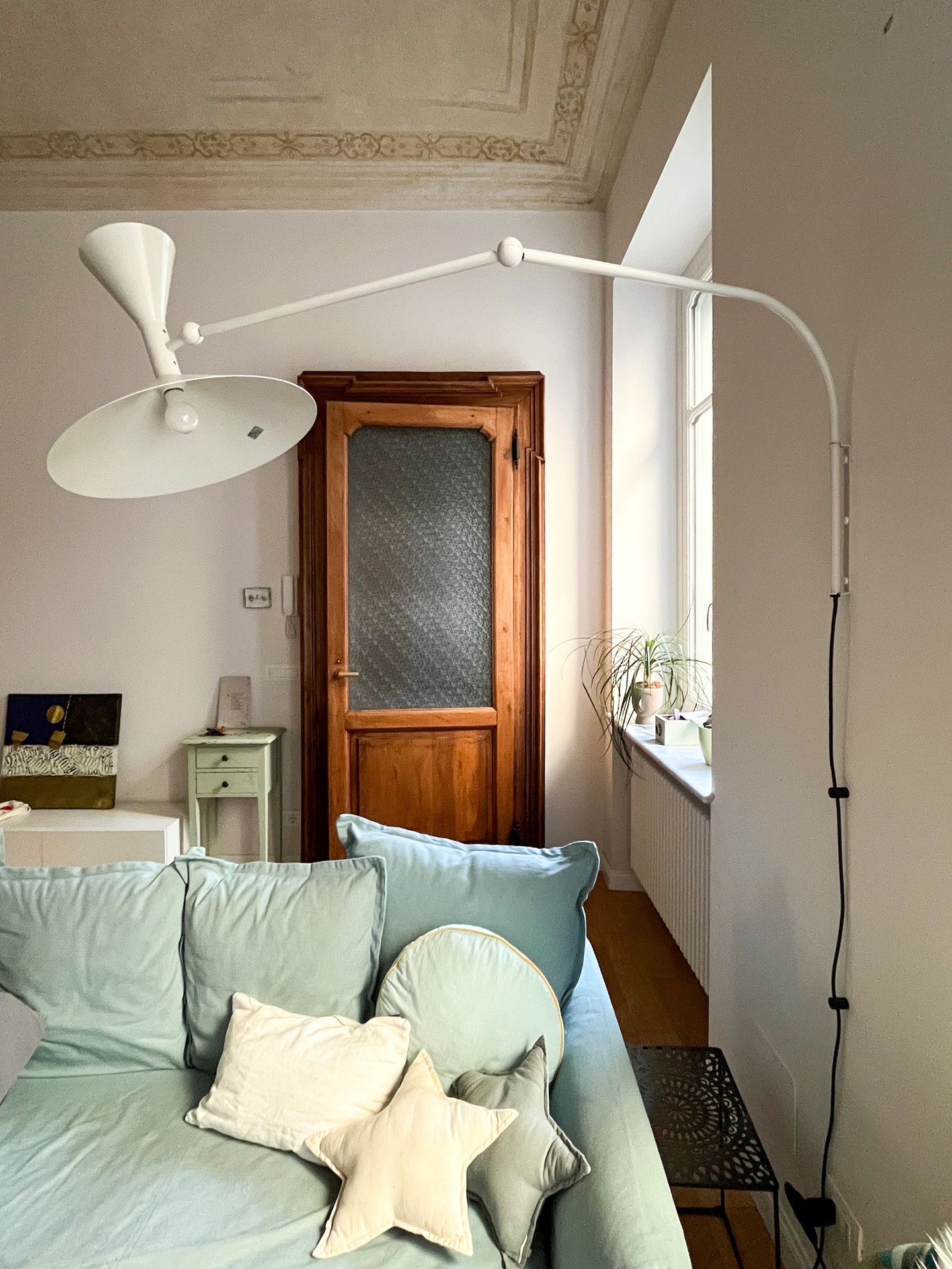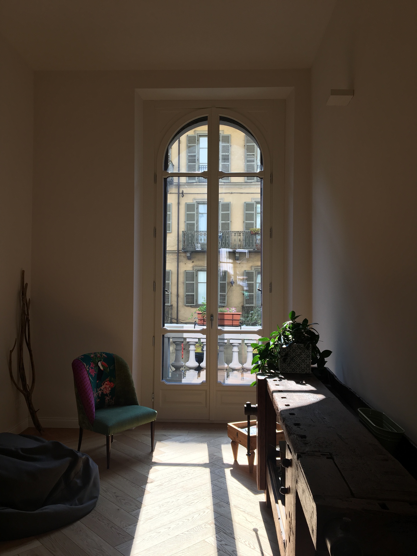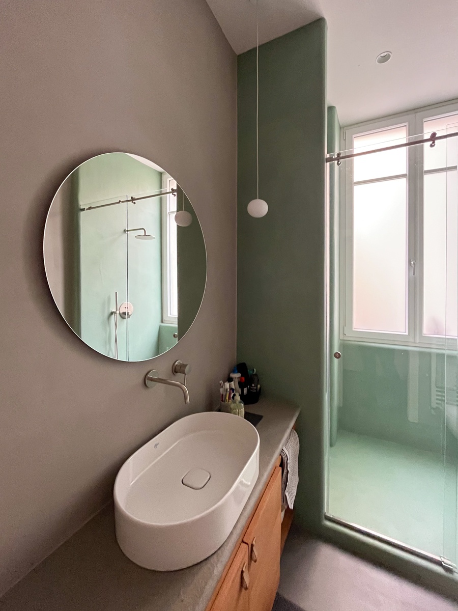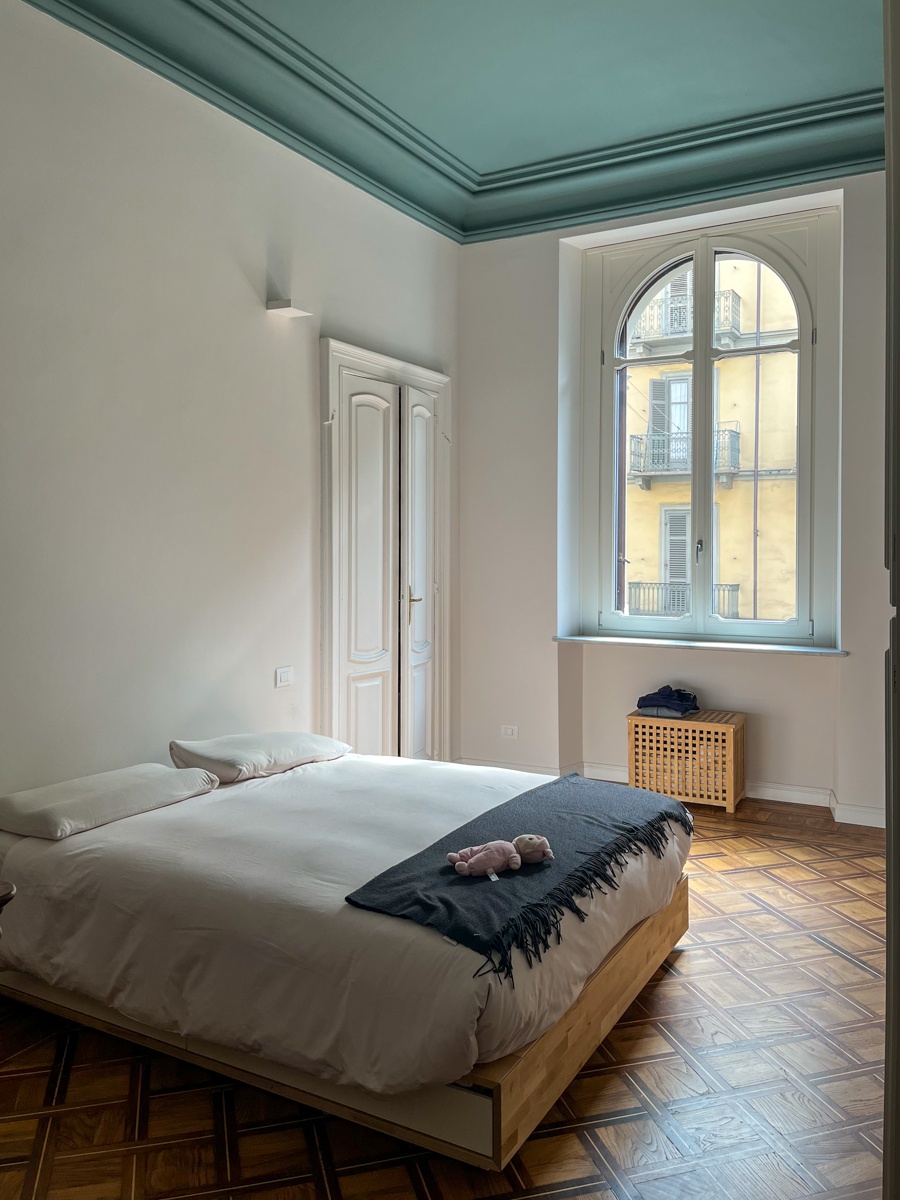 Il layout originario era caratterizzato da un corridoio di quasi 14 metri che divideva rigidamente l’appartamento in due parti. L’intervento ha previsto importanti demolizioni per ripensare completamente la distribuzione interna, con l’obiettivo di ottenere ambienti più ampi, luminosi e funzionali. Lungo il tracciato del vecchio corridoio sono stati ricavati un nuovo bagno, un ripostiglio e due cappottiere, trasformando uno spazio di puro passaggio in una sequenza di volumi utili e strategici per la vita quotidiana.
