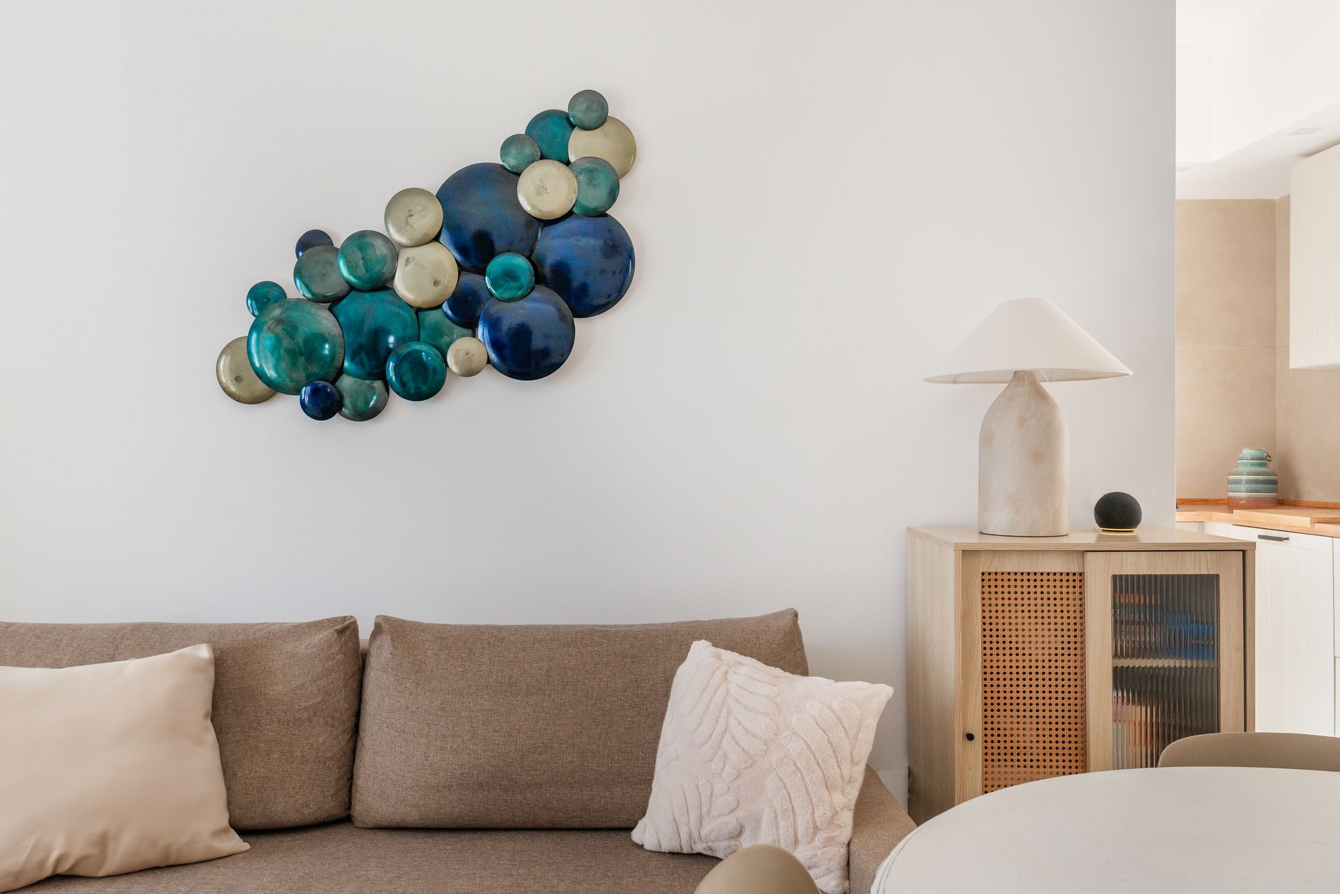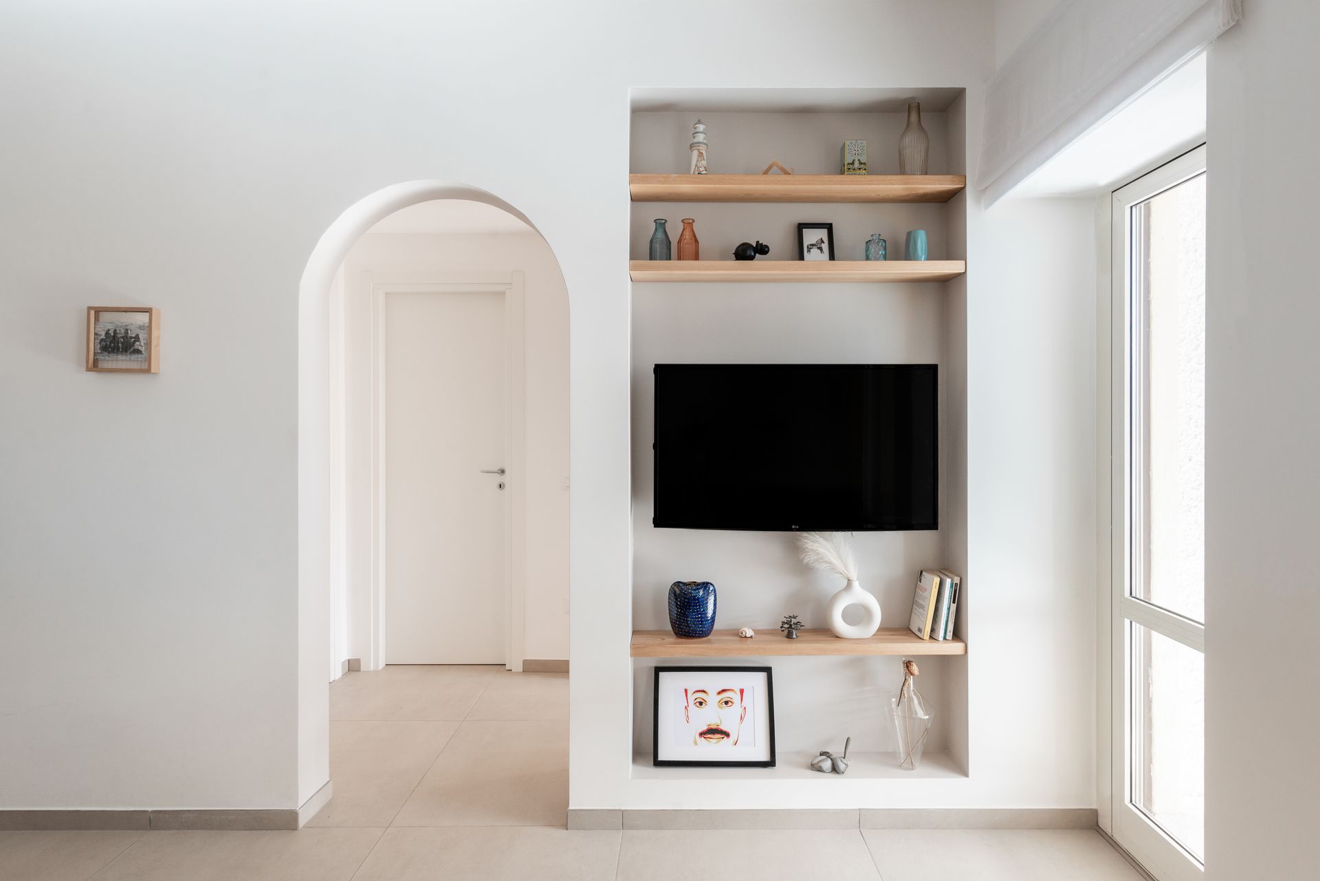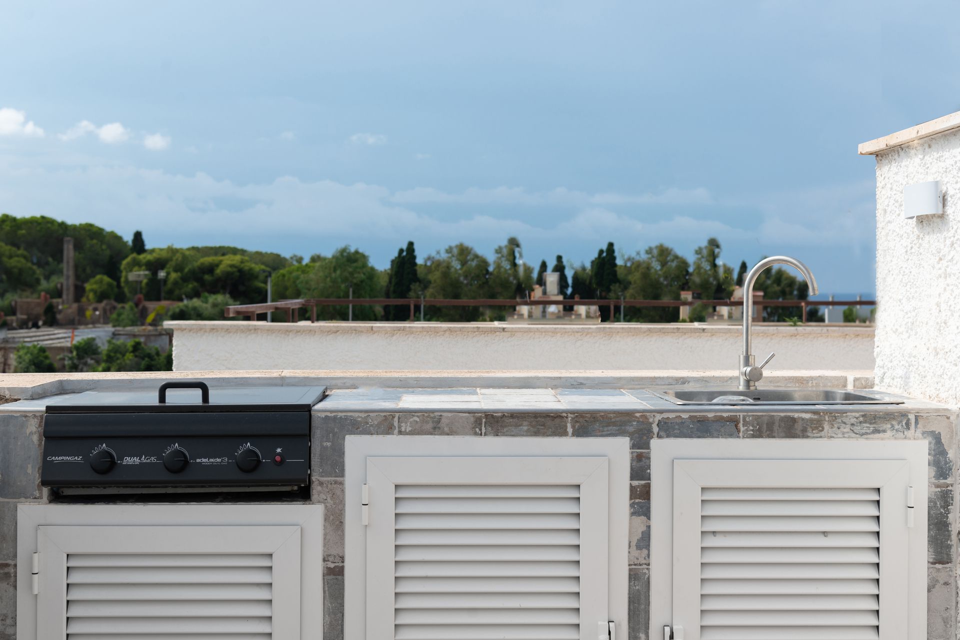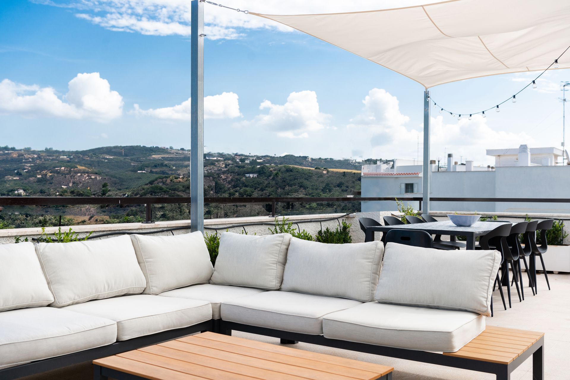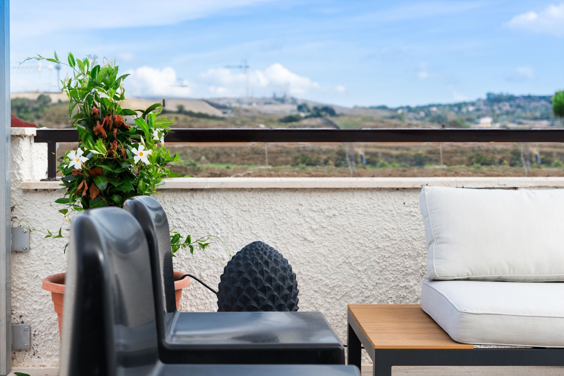 Sita sul litorale romano a Santa Marinella, Casa Marinella si distingue per un design pulito e moderno, che armonizza interni accoglienti con spazi esterni suggestivi. Gli interni, caratterizzati da tonalità neutre e da una distribuzione spaziale ottimale, sono pensati per massimizzare la luce naturale e creare un ambiente rilassante. Il salotto e la zona pranzo sono arredati con mobili dalle linee semplici, come il tavolo rotondo di legno bianco e le sedie minimaliste color sabbia, in perfetta sintonia con il divano dalle tonalità neutre. La scala interna, che porta ai piani superiori, è un altro elemento di design, con la struttura metallica di un blu scuro che crea un contrasto moderno e dinamico con le pareti bianche. Le finiture riflettono un gusto sobrio ma ricercato, con dettagli come i piccoli quadri incorniciati lungo il corridoio, che aggiungono un tocco di personalità agli ambienti.Il punto focale dell’abitazione è sicuramente la terrazza con vista panoramica, arredata per favorire momenti di relax all’aperto. Un ampio divano bianco a L e tavolini di legno creano una zona perfetta per intrattenere gli ospiti o godere del panorama sulle colline circostanti. Un grande tavolo da pranzo all'aperto permette di cenare all'aperto, mentre la vegetazione e le decorazioni, come vasi di piante rampicanti, aggiungono un tocco di verde che si integra perfettamente con l’ambiente naturale.La ristrutturazione evidenzia un’attenta scelta dei materiali e dell’arredo, mirata a creare un equilibrio tra modernità e funzionalità, rispettando al contempo l’essenza mediterranea del luogo.