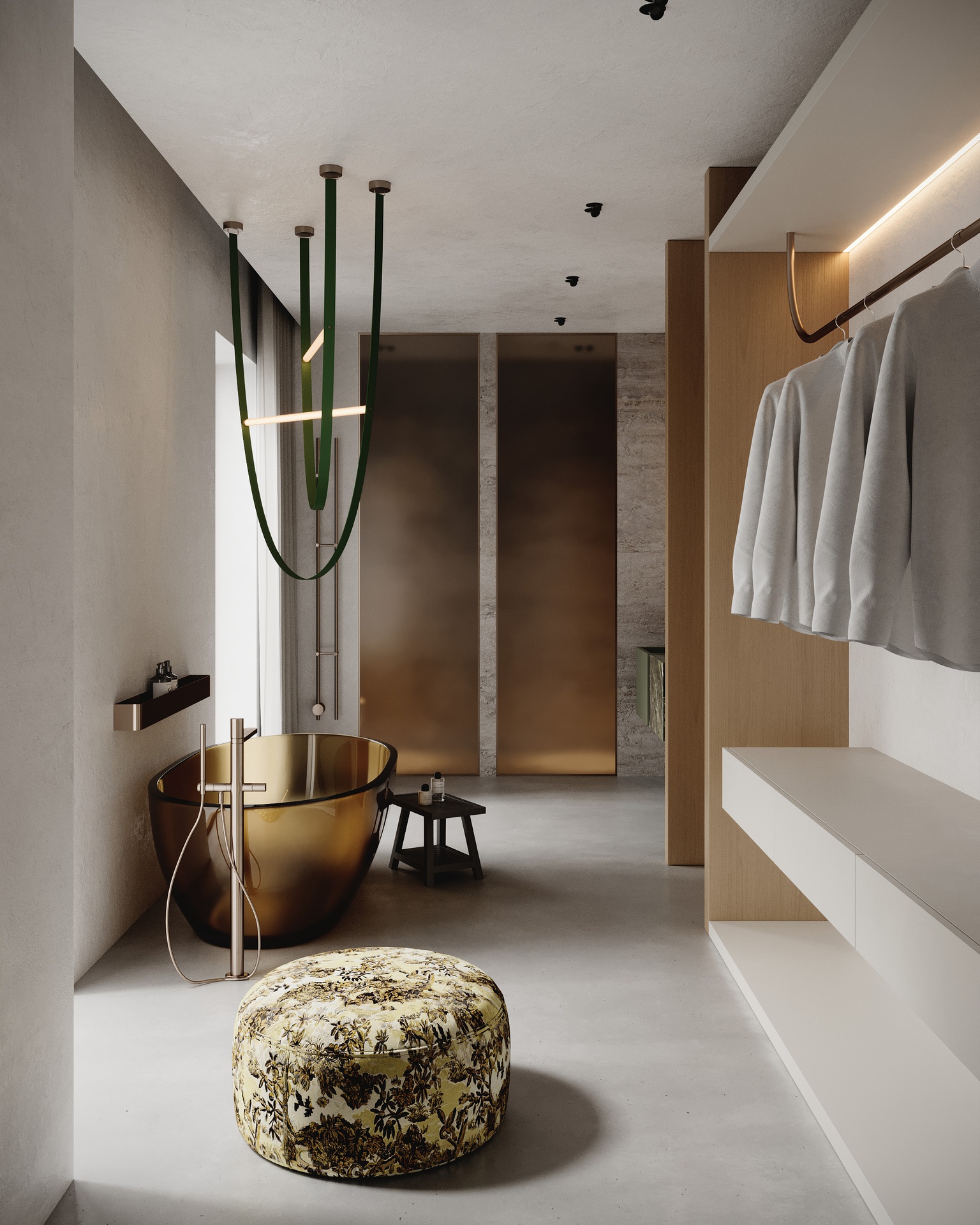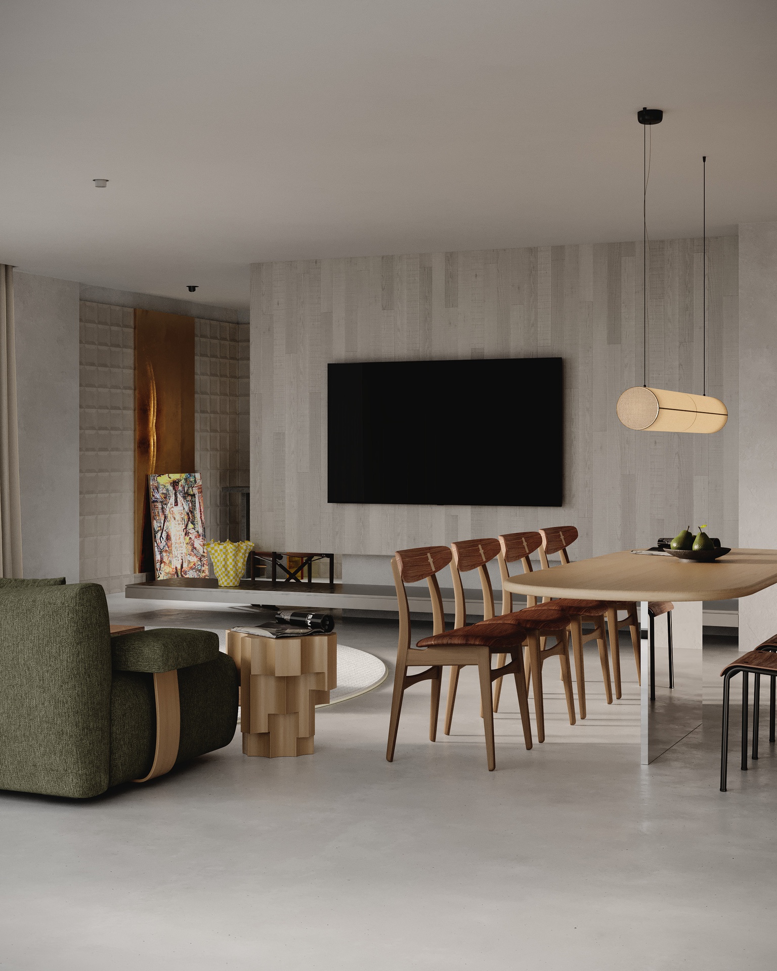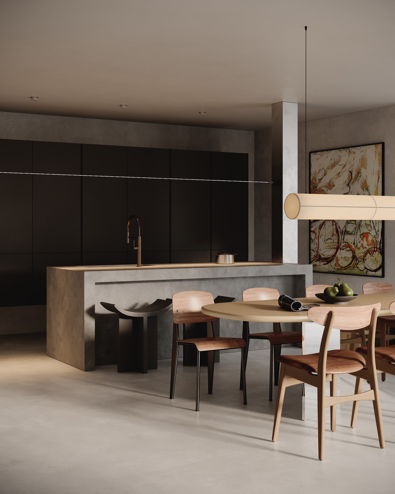 In questa casa, l’architettura diventa racconto. Ogni spazio è pensato come un’estensione della personalità di chi lo vive — artisti che lavorano nel mondo del design e che hanno voluto un luogo capace di rispecchiare la loro sensibilità estetica e la loro ricerca di equilibrio. Una visione chiara: minimalismo con carattere, essenzialità che non rinuncia alla forza materica e alla presenza.I toni neutri del grigio avvolgono gli ambienti donando un senso di ordine e calma, ma senza rinunciare al calore, grazie alla presenza del legno e delle opere che animano gli spazi.Il cuore della casa, la cucina, si distingue per un’isola monolitica in cemento armato, pura e scultorea, che dialoga con i cupboards in Fenix nero, morbidi al tatto come velluto e impeccabili alla vista.Nei bagni, la resina avvolge pareti e pavimenti restituendo un effetto grezzo e monolitico (come nel resto dell'appartamento) , quasi lunare, ma scaldato dal travertino e dai toni verde opaco dei mobili. Tre cubi, semplici e potenti, accolgono i lavabi in un gesto architettonico che riassume tutto: forma, materia, colore, design — qui parlano la stessa lingua.Un progetto dove ogni spazio è pensato per essere vissuto, dove estetica e comfort si incontrano e dove la personalità diventa parte integrante dell’architettura.