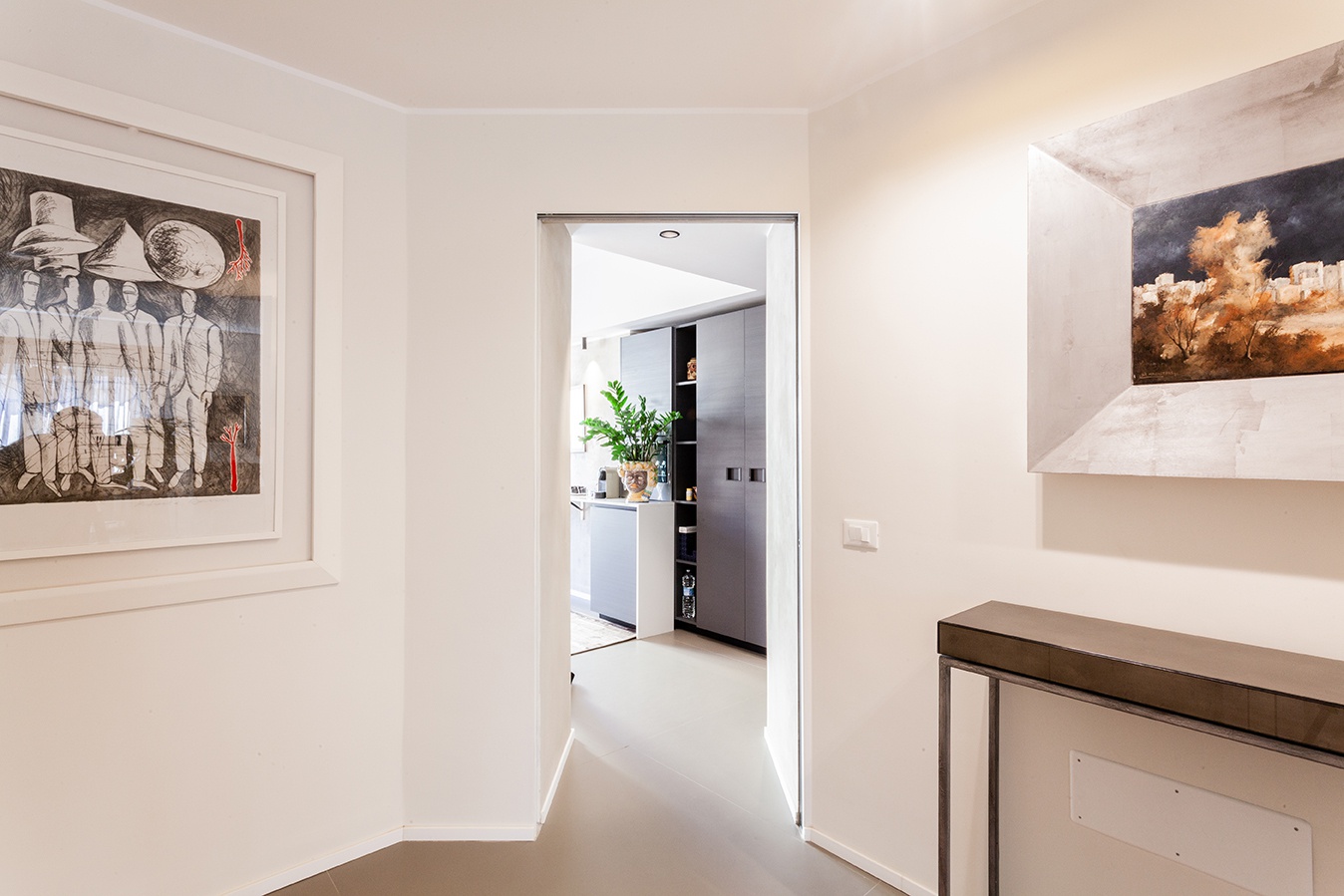 Ci contatta una cliente romana che aveva appena comprato casa a Palermo ed era in procinto di trasferirsi. I suoi desideri erano: una cucina grande, due camere da letto matrimoniali (una per ospitare il figlio quando veniva a trovarla) e uno studio ma soprattutto di rendere la casa più luminosa eliminando inutili suddivisioni dello spazio.La nostra proposta verte a creare uno spazio continuo in cui le distinzioni tra una funzione e l'altra sono dettate dalla dilatazione e dalla compressione in altezza. Entrando troviamo una zona ingresso più bassa che si apre a destra sul soggiorno-pranzo mentre sulla sinistra una porta a vetri la separa dalla cucina, continuando il soggiorno si contrae nella parte finale dalla quale si accede al disimpegno delle varie camere.Il soggiorno è delimitato da due pareti singolari: da un lato un armadio su cui è stato applicato un rivestimento in stoffa e resina che si configura come una vera opera d'arte contemporanea, dall'altro una struttura in acciaio e legno nasconde la tv e ospita un quadro realizzato da un caro amico della proprietaria.La maggior parte degli arredi apparteneva già alla cliente e il progetto è stato ragionato in loro funzione, la cucina, gli armadi e il divano (e ovviamente tutti i mobili su misura), così come le lampade, sono stati scelti per questa casa.