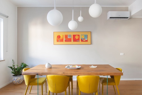 Gli interventi architettonici “pesanti” fatti in casa MeMa sono pochi. Rispetto alla planimetria iniziale abbiamo deciso di creare uno spazio open-space cucina/soggiorno, aumentando così il dialogo e la luminosità.La maggior parte del lavoro è stata fatta sulla scelta dei colori, delle finiture e dell’arredamento.Quasi la totalità degli arredi, ed in particolare la cucina, sono disegnati su misura e realizzati in falegnameria. Per tutti è stato scelto il colore come elemento distintivo. L’azzurro della cucina, in contrasto con la pietra sedimentaria utilizzata come top, crea un punto vivace nella zona giorno.Anche per i bagni il colore non è venuto a mancare. Rosa e verde caratterizzano i due spazi, insieme alle piastrelline che rivestono le pareti, dalle geometrie particolari.