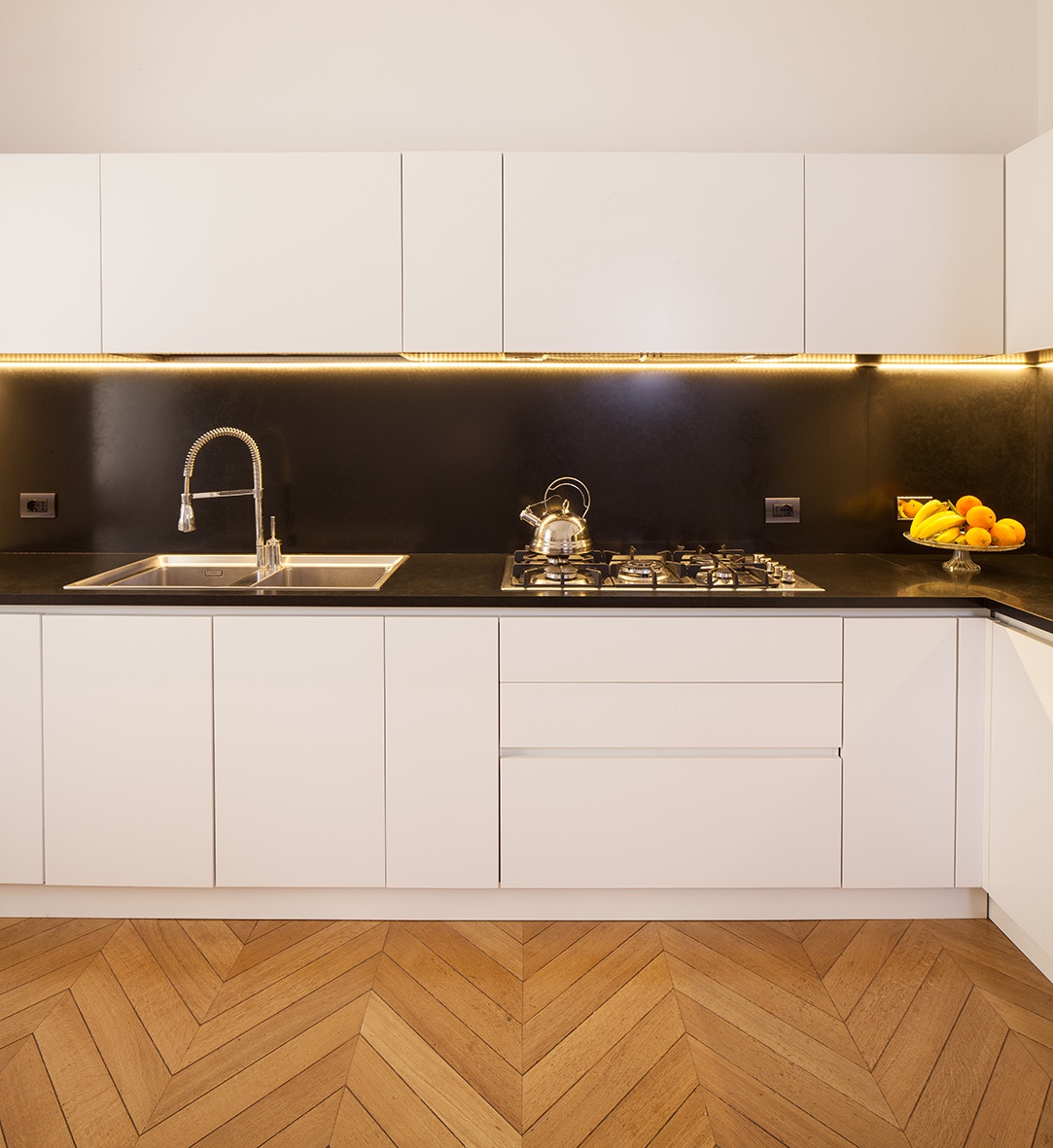 In una città come Roma vivere in un palazzo d’epoca ha un sapore speciale. Da tempo i proprietari di casa (una coppia di giovani professionisti) erano alla ricerca di un nuovo appartamento per la famiglia, (da poco cresciuta dall’arrivo della figlia Emma), caratterizzato da altezze generose e volumi importanti, ossia un involucro che li facesse sentire a proprio agio, protetti e rassicurati dai segni del passato.L’immobile fa parte di un palazzo storico del quartiere Trieste di Roma, inserito e vincolato dalla carta della qualità, situato al piano primo, con affaccio su strada esterna e su cortile interno.L’impianto planimetrico originario dell’appartamento prima dell’intervento di ristrutturazione, prevedeva già una doppia partizione: la parte giorno, scandita da un susseguirsi di ambienti che affacciano su strada, la parte notte, su un affaccio su cortile interno. In questo suggestivo involucro architettonico, i progettisti hanno aperto un dialogo con segni dalle geometrie sobrie, cercando un equilibrio tra luce ed ombra, design contemporaneo e segni del passato, in un costante e fruttuoso confronto con i propri committenti.L’intento progettuale presupponeva la realizzazione di un ambiente domestico confortevole, discreto e semplice, che non rinunciasse però a precise suggestioni estetiche, che si esprimono nell’uso di colori chiari o tenui, e nell’uso di materiali di pregio (parquet a spina ungherese, pietre naturali) sapientemente accostati ad arredi ed oggetti di design contemporaneo.L’intervento di ristrutturazione ha imposto un confronto con il sito originario, cercando di rispettare e valorizzare gli elementi preesistenti, adeguandolo però alle mutate esigenze di una famiglia contemporanea. Dall’ingresso si accede alla zona living, da un atrio di forma triangolare, caratterizzato dalle numerose porte in legno massello e vetro, con ferramenta e maniglie in ottone, tutte restaurate nella forma originaria.L’ampio salone triplo, è scandito dalla sequenza di due importanti archi in muratura e caratterizzato dalla presenza di soffitti decorati, in motivi generalmente geometrici e con elementi floreali. In questo ambiente, trovano collocazione tavolo ovale e sedie KNOLL della collezione Saarinen con base in alluminio verniciato nero e piano in marmo neroassoluto. Al centro, un grande lampadario a sospensione di VIBIA Wireflow Chandelier, che in un esercizio di semplificazione, apporta delicatamente a alla zona pranzo un intangibile carattere concettuale.Completano il set del living domestico: il grande camino in pietra, con il focolare in ferro grezzo scuro; il parquet a spina ungherese in rovere classico, di CP Parquet, presente peraltro in tutta l’abitazione; divani e chaise lounge di B&B, la grande libreria bianca a tutta parete Wall di Poliform; mobile tv in legno laccato e riquadri in essenza, su disegno dello studio z5ai; lampade applique SURF di Artemide e lampada da terra Arco di Flos.Dall’ambiente living, lungo il corridoio centrale, si delineano gli altri ambienti dell’appartamento.La cucina è caratterizzata dai mobili in legno laccato bianco e dalle superfici del top ed alzata in pietra naturale in nero assoluto.Nella stanza padronale sono presenti un letto di Poliform e arredi in legno wengè, armadi in legno laccato bianco; l’illuminazione dei soffitti decorati è garantita da strisce led e dalla lampada Parentesi di FLOS.La stanza della prima figlia è invece caratterizzata dai colori tenui e decò delle pareti, dal disegno bicromo in fasce verticali, in colori bianco e taupe.I due bagni interni sono rivestiti con pietre naturali (Santa Flora) quello padronale, e mosaico vetroso di colore nero assoluto per quello di servizio. I sanitari e le rubinetterie sono di collezioni classiche, mentre gli arredi interni sono su disegno originale.