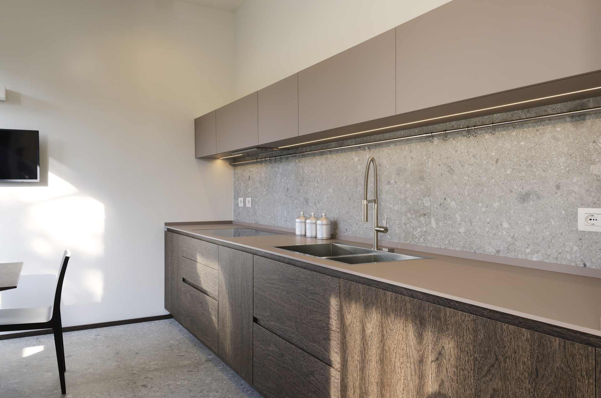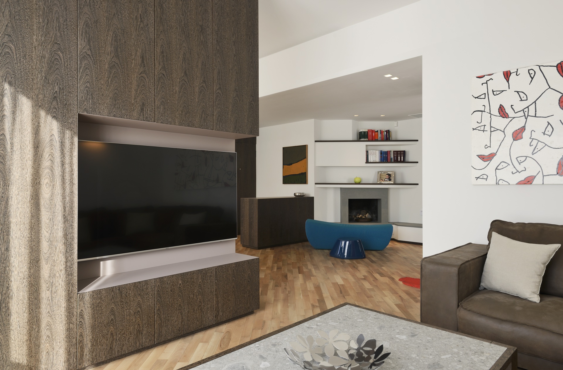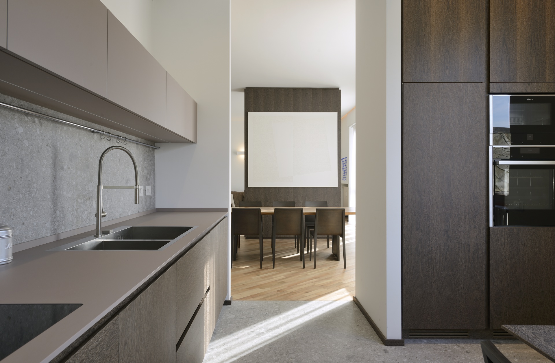 La rimozione delle partizioni murarie interne ha permesso di ripensare completamente la distribuzione di un appartamento tradizionale, dando vita a uno spazio ampio, arioso e ricco di luce naturale. La cucina dialoga ora con l’area living attraverso una grande apertura, favorendo continuità visiva e funzionale.Il progetto di interior design valorizza ulteriormente la luminosità degli ambienti grazie al raffinato contrasto tra pavimenti e pareti dalle tonalità chiare e gli arredi su misura in legno scuro. Le texture classiche ed eleganti dei materiali scelti contribuiscono a definire un ambiente armonioso, equilibrato e accogliente.