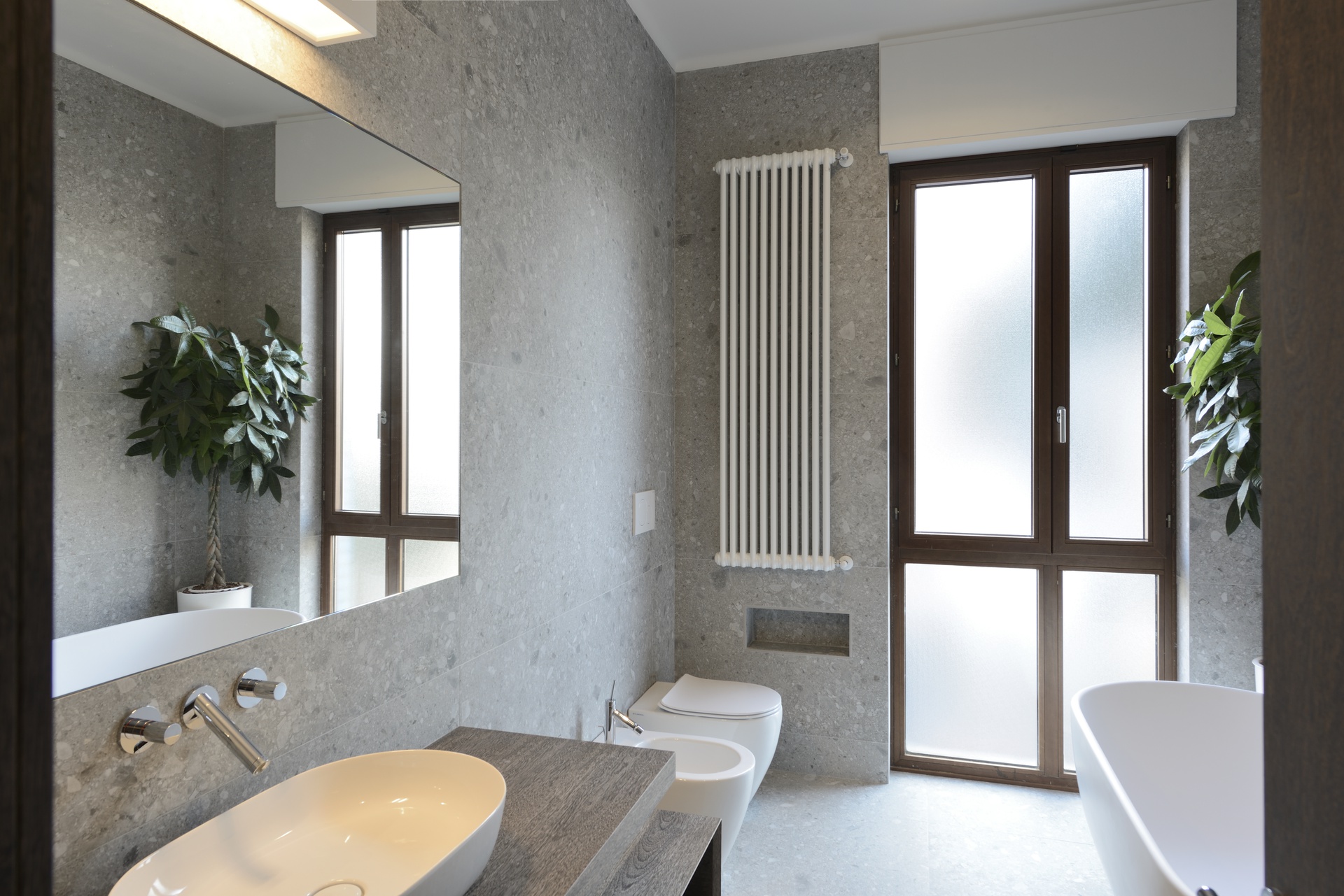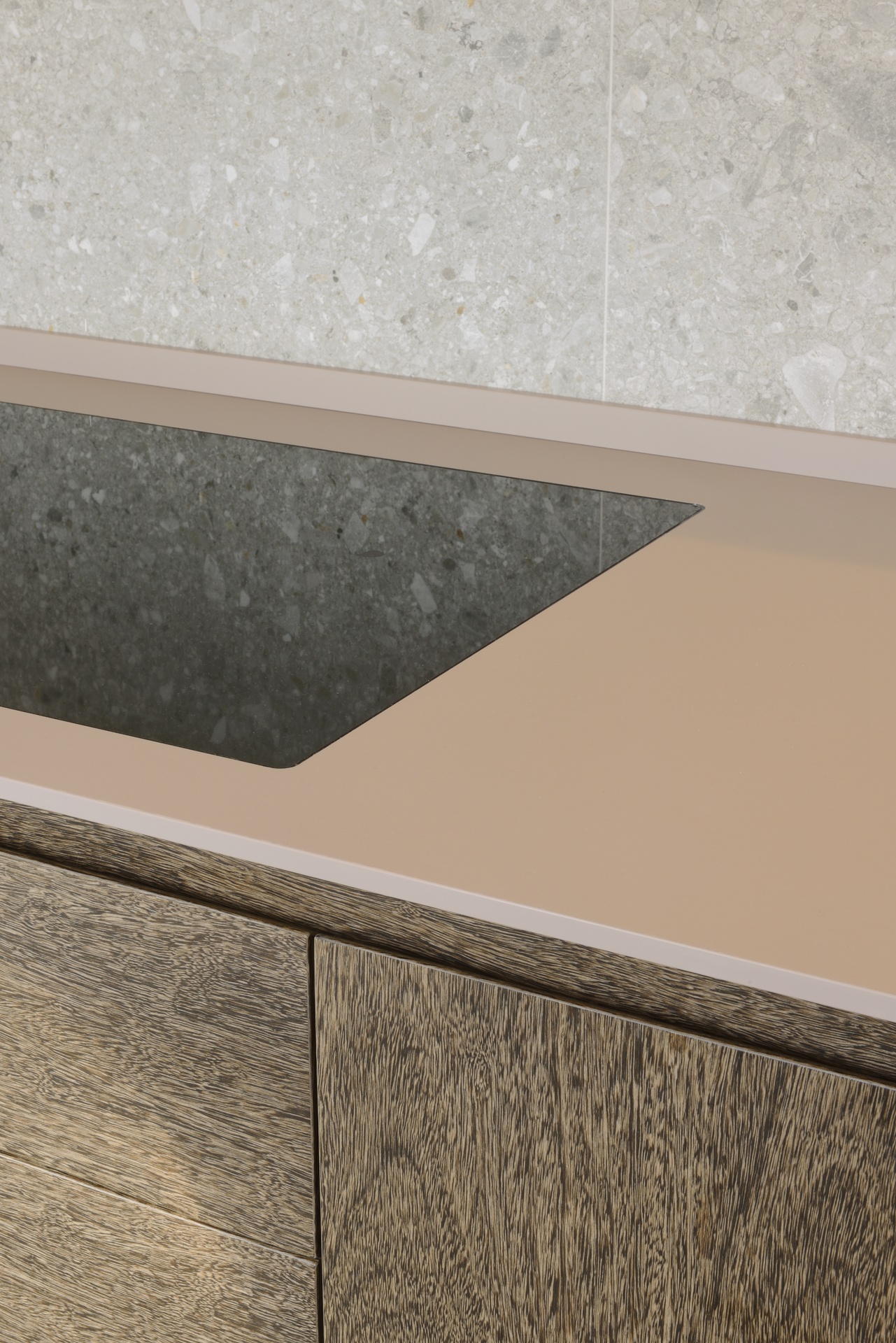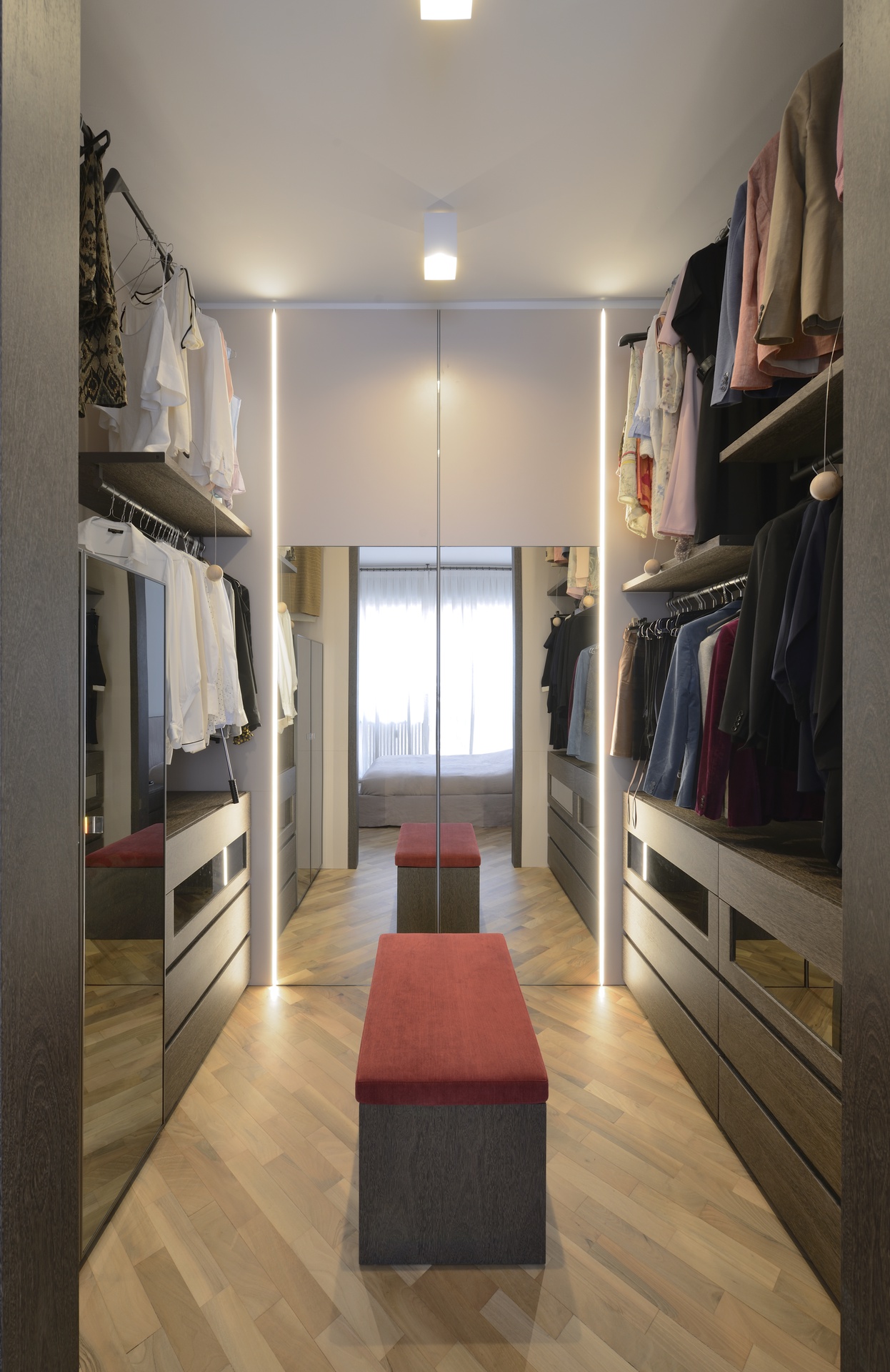 La rimozione delle partizioni murarie interne ha permesso di ripensare completamente la distribuzione di un appartamento tradizionale, dando vita a uno spazio ampio, arioso e ricco di luce naturale. La cucina dialoga ora con l’area living attraverso una grande apertura, favorendo continuità visiva e funzionale.Il progetto di interior design valorizza ulteriormente la luminosità degli ambienti grazie al raffinato contrasto tra pavimenti e pareti dalle tonalità chiare e gli arredi su misura in legno scuro. Le texture classiche ed eleganti dei materiali scelti contribuiscono a definire un ambiente armonioso, equilibrato e accogliente.